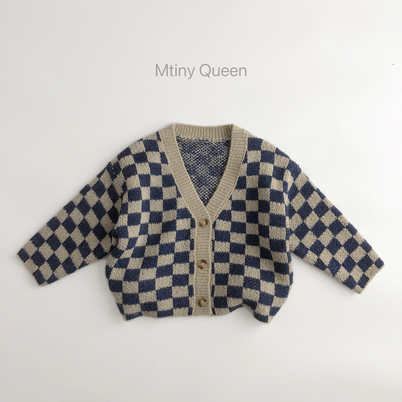북유럽 스타일 ~ 봄 가을 어린이 스웨터 바둑판 카디건 서양식 남녀 조수 보물 니트 반바지 세트 센