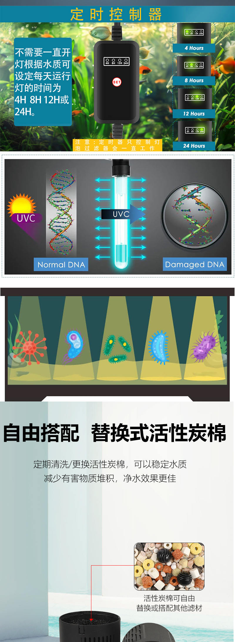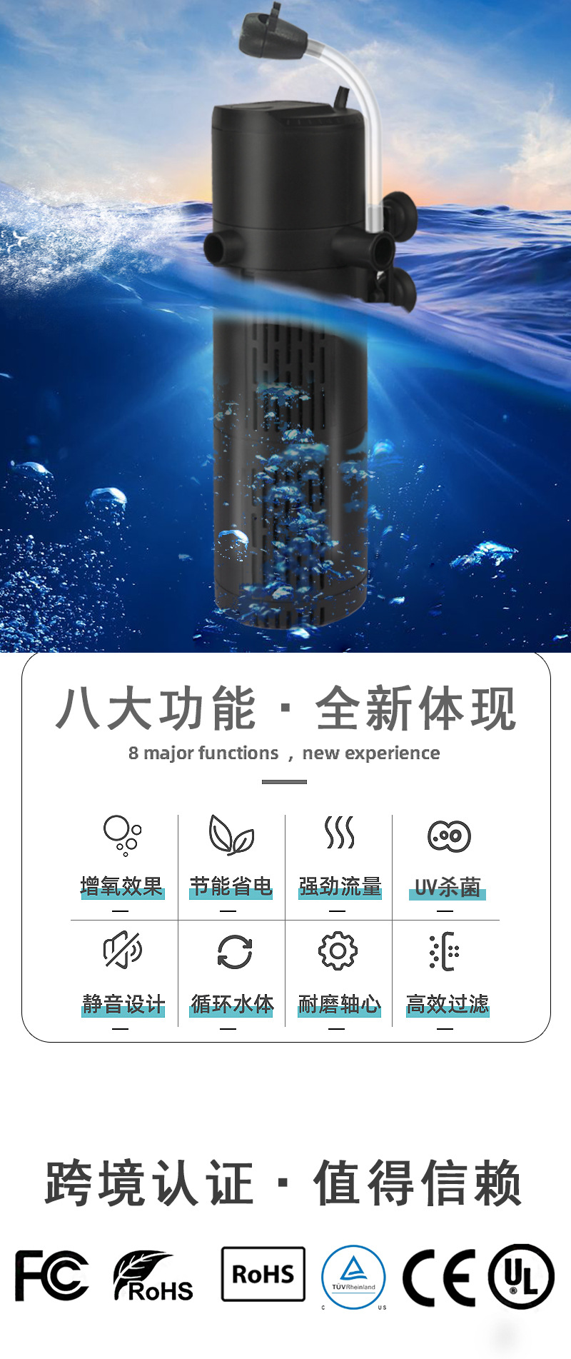 국경 간 수족관 필터, 4-in-1 순환 필터, 수중 펌프, 산소 공급, 소형 UV 파도 생성 필터 펌프