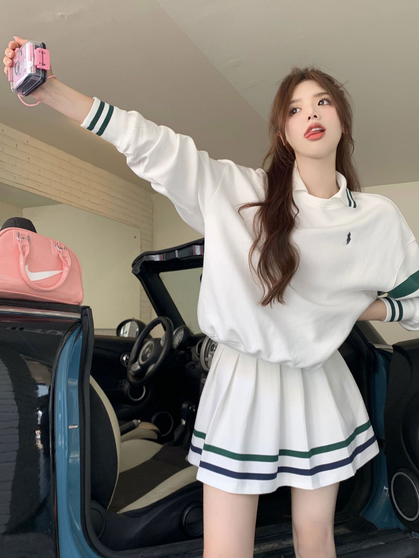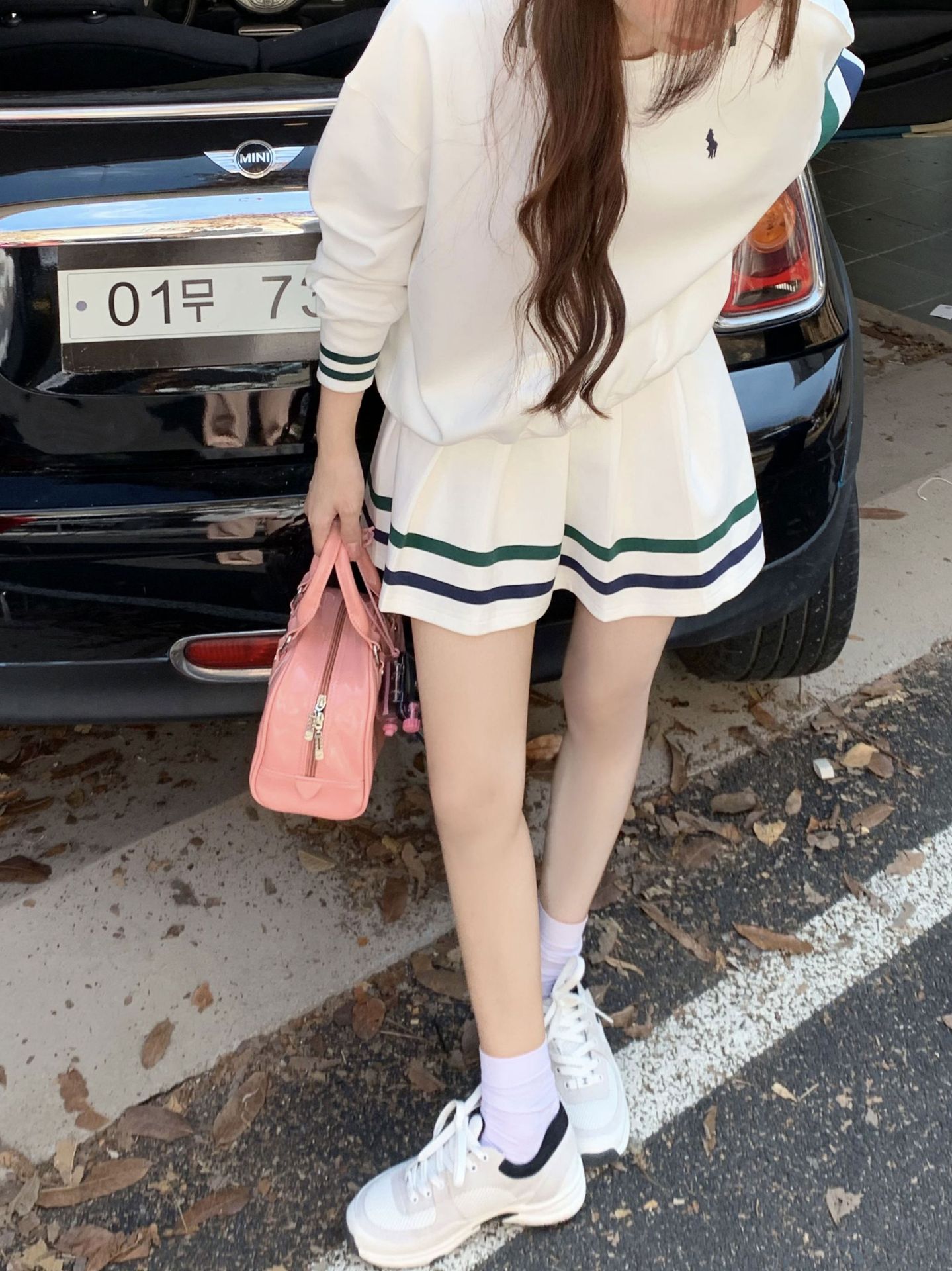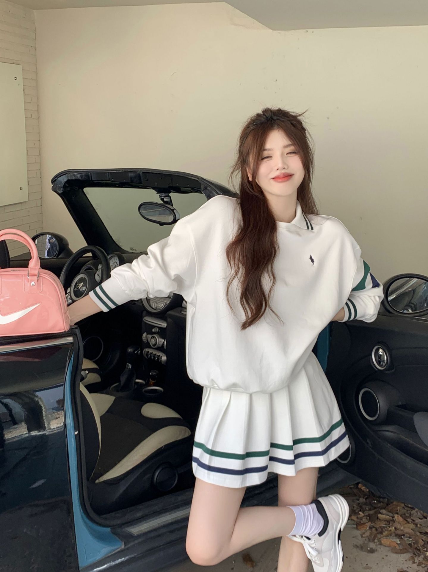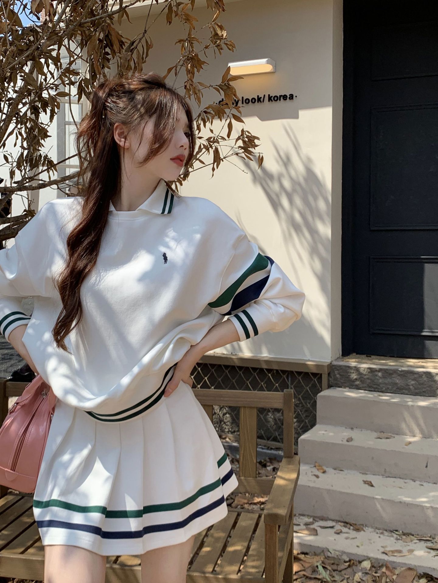 프레피 스타일 튀김 거리 스포츠 세트 짧은 치마 여성 봄과 가을 캐주얼 패션 시대 감소 달콤한 핫 소녀 주름 치마 투피스 세트스토어 가기