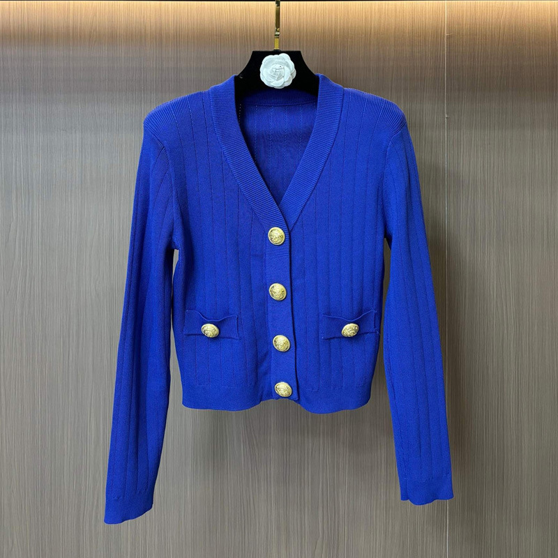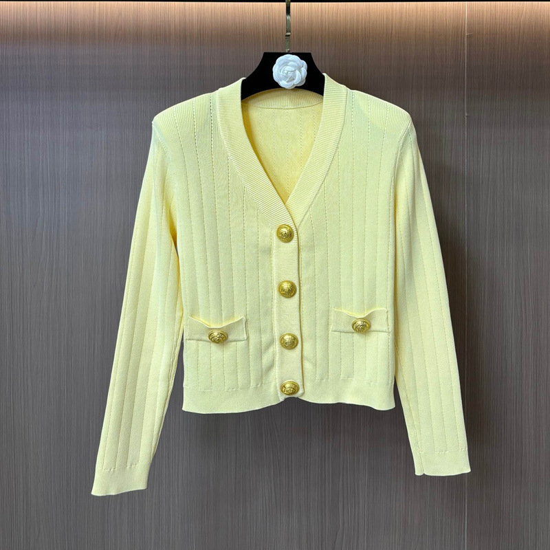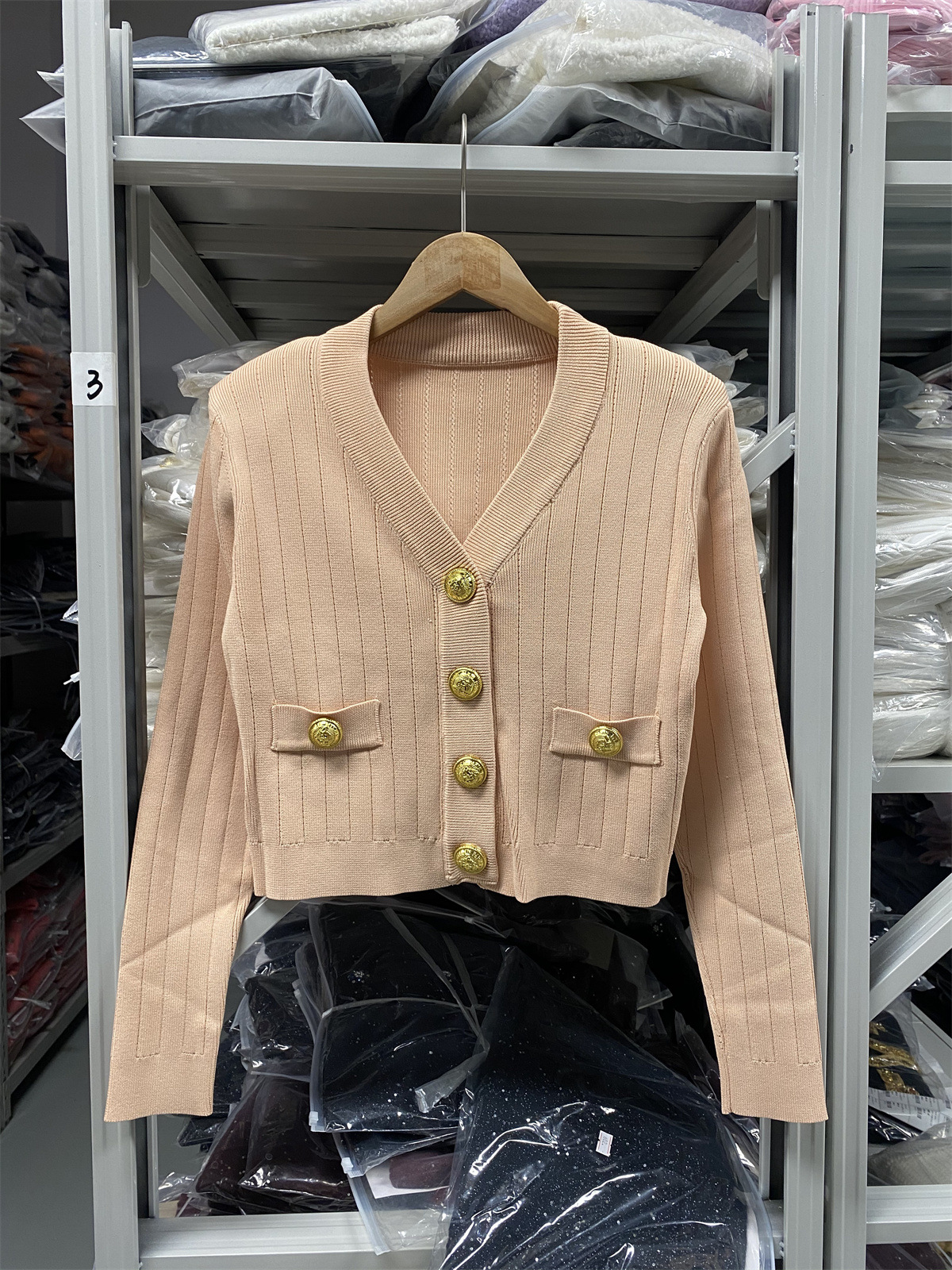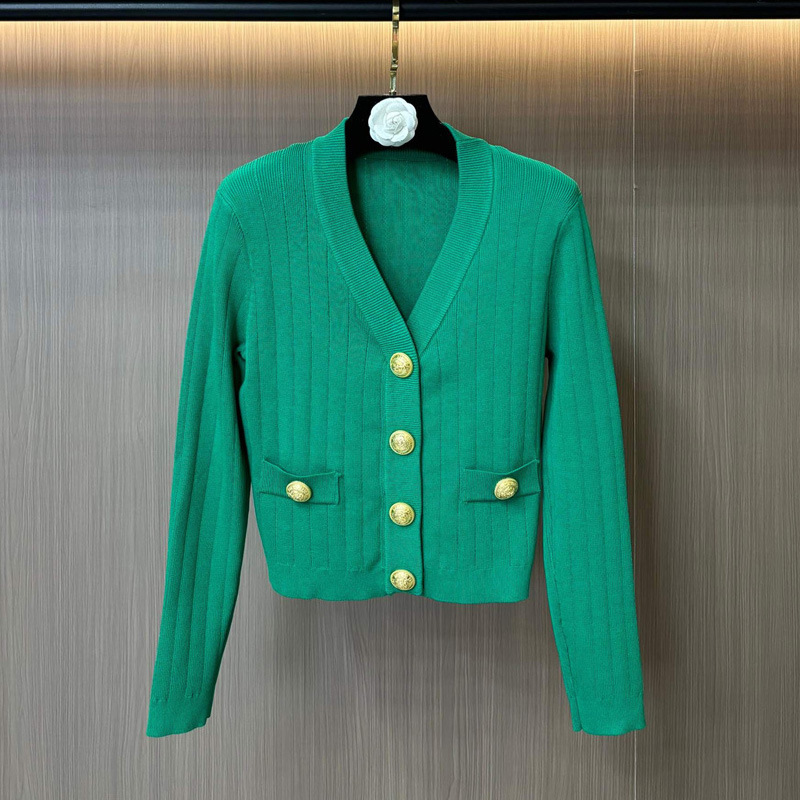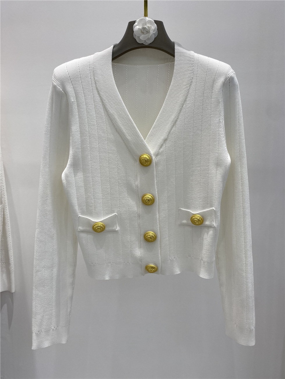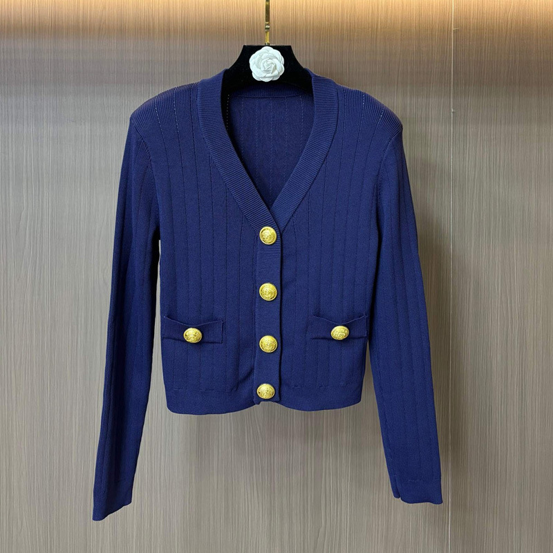 우아한 탑 V 넥 빅 골드 버클 니트 카디건 코트 여성용 어깨 패드 2024 봄 패션 슬림 핏 하이 퀄리티 재고스토어 가기