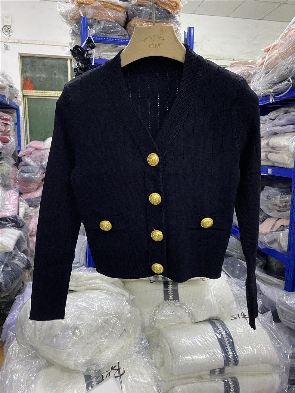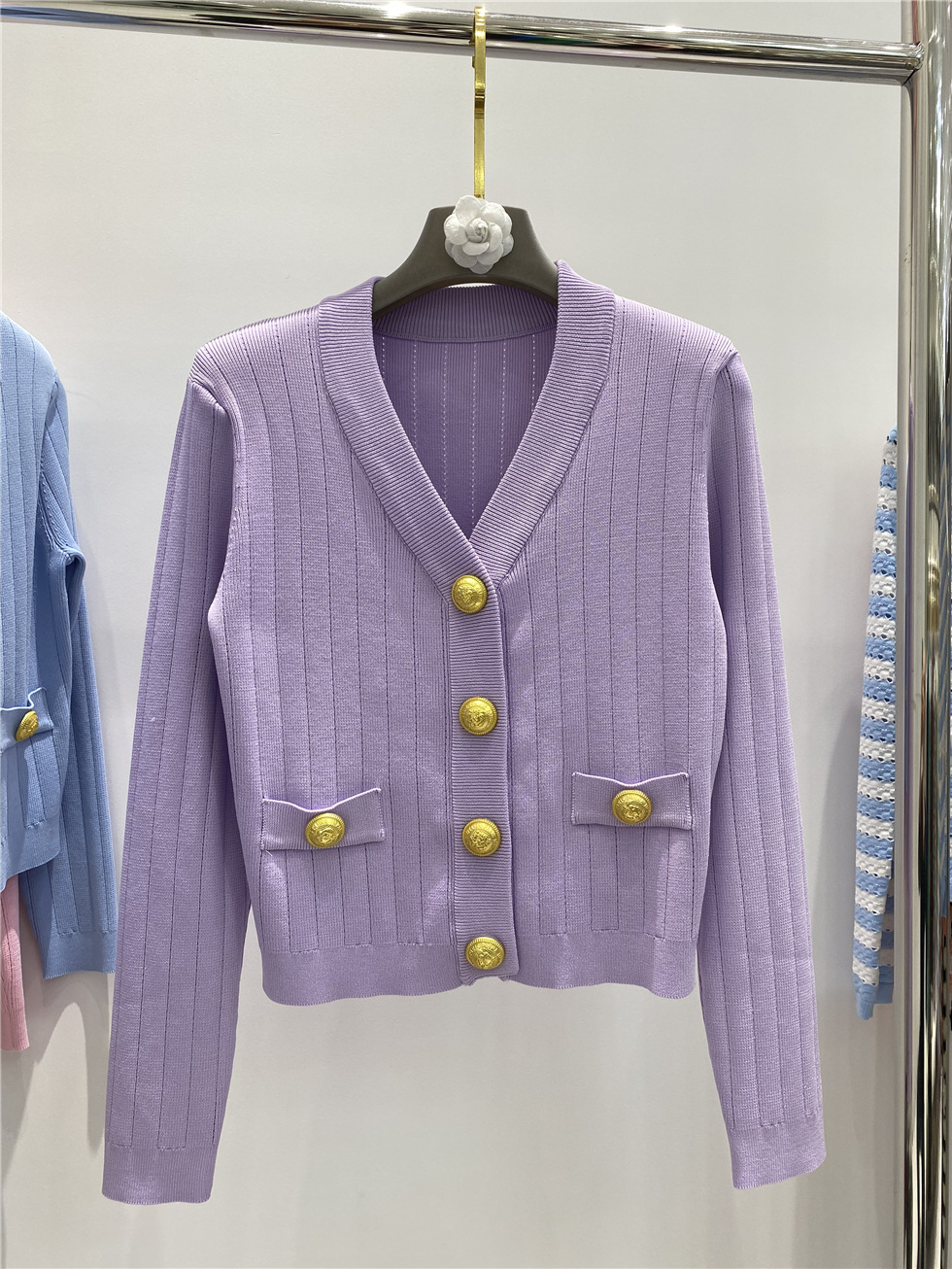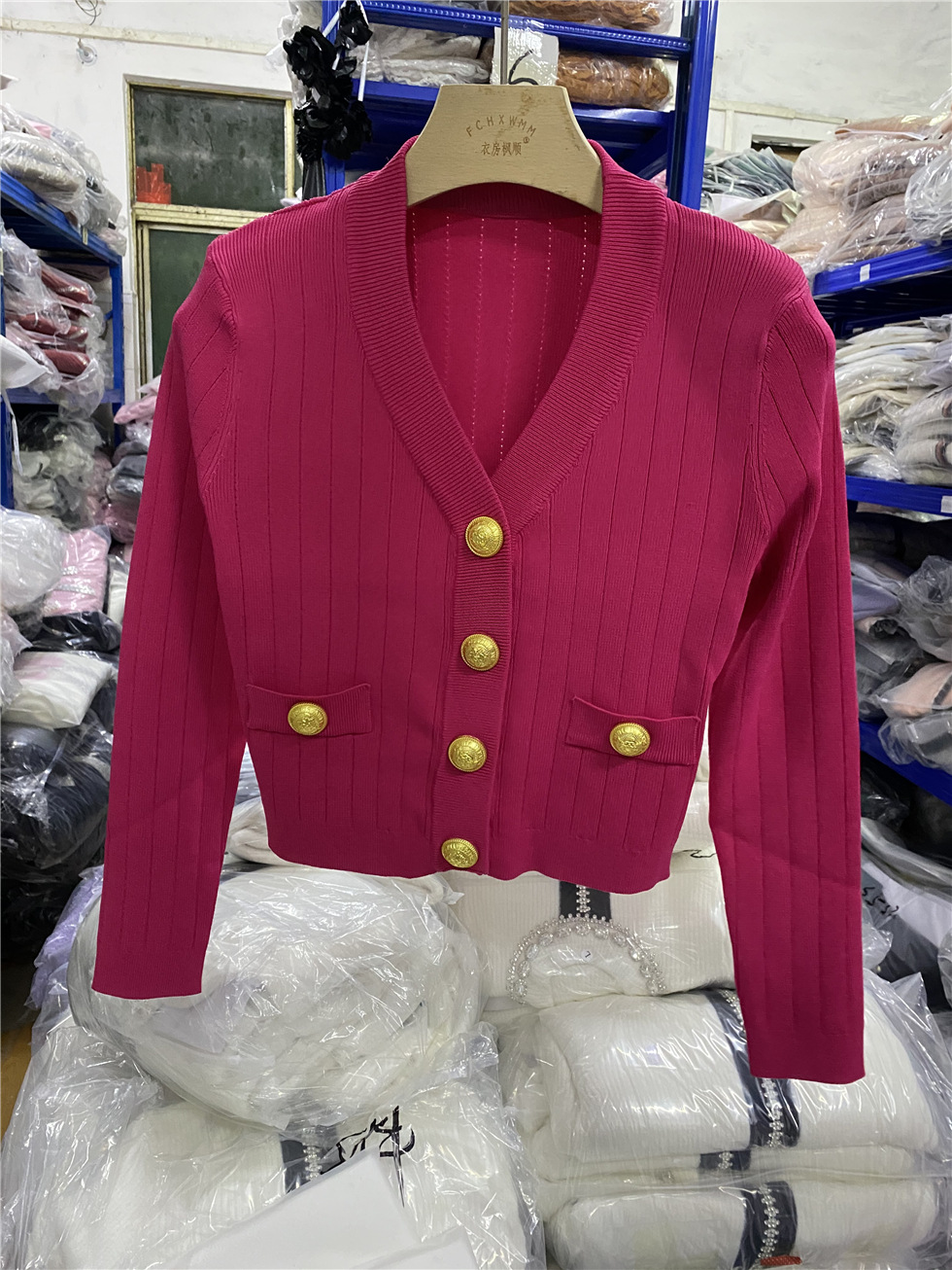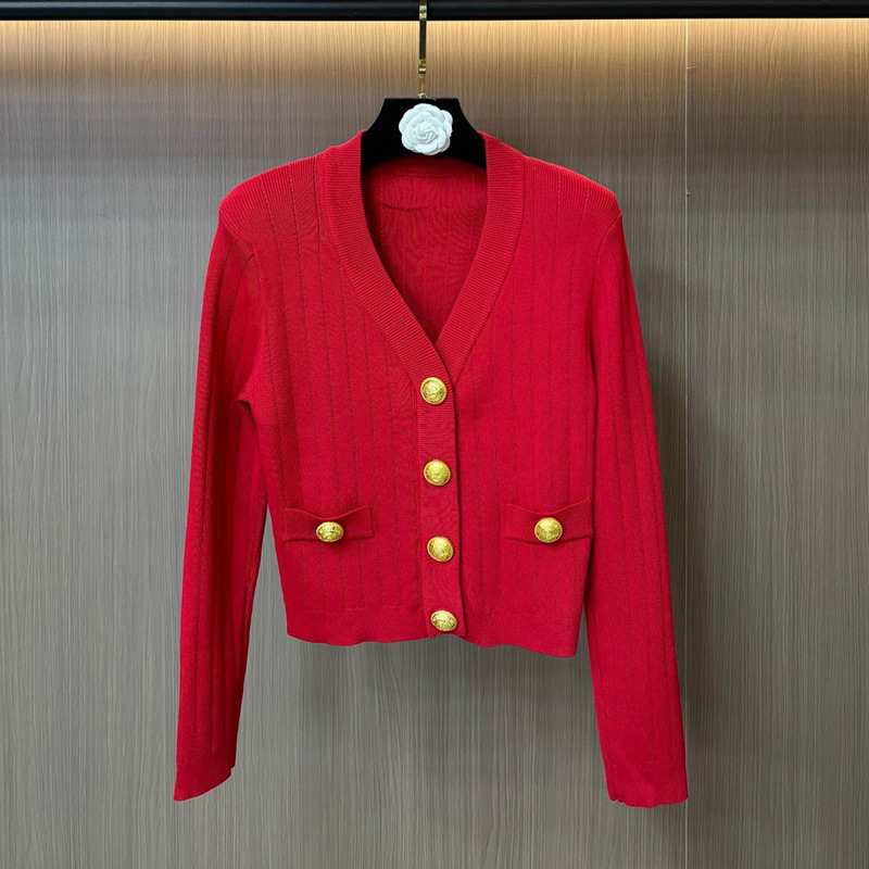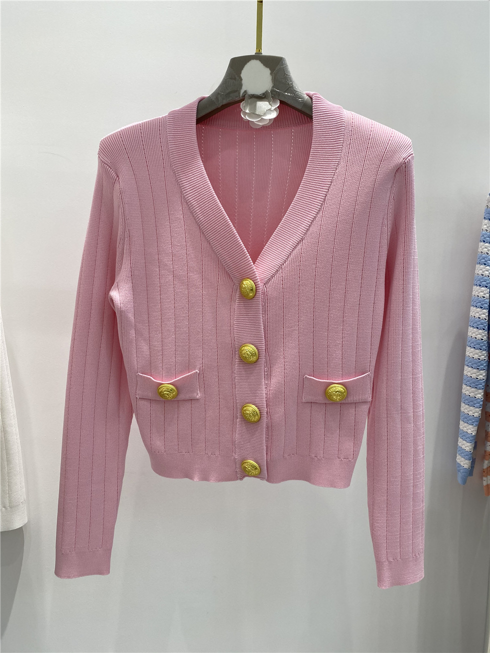 우아한 탑 V 넥 빅 골드 버클 니트 카디건 코트 여성용 어깨 패드 2024 봄 패션 슬림 핏 하이 퀄리티 재고스토어 가기