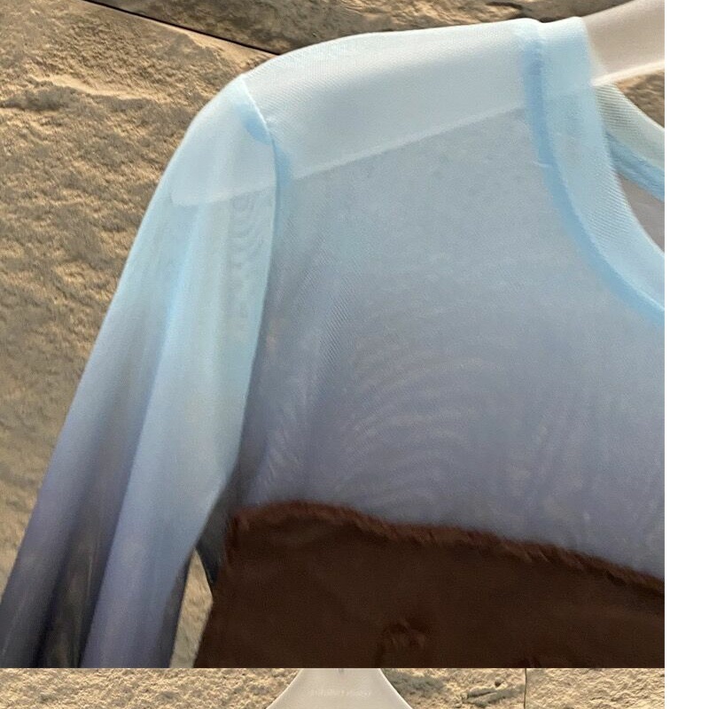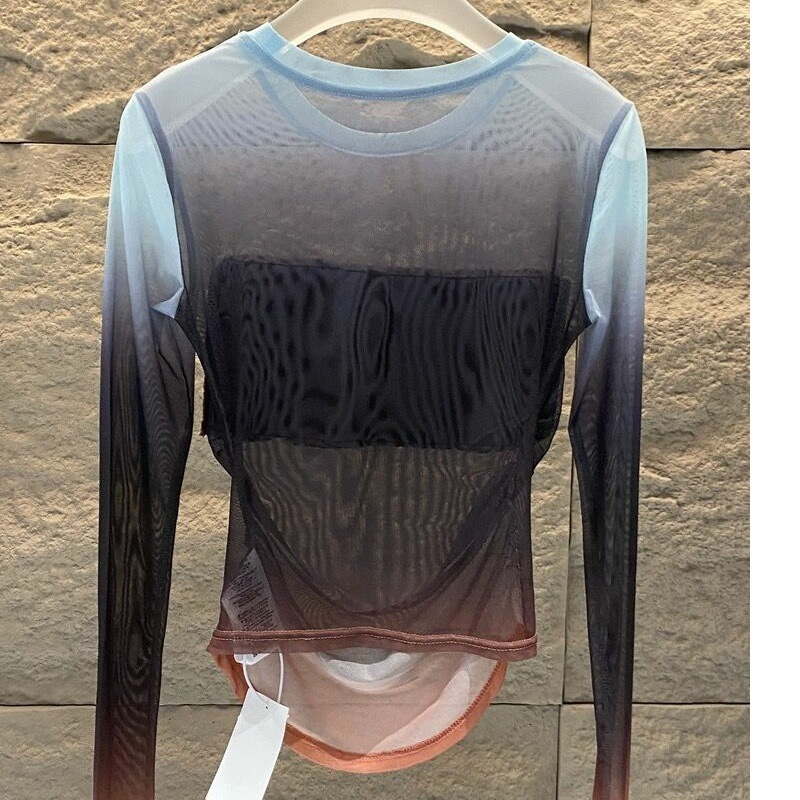 유럽 패션 젊은 편지 인쇄 그라디언트 컬러 메쉬 티셔츠 여성 2023 새로운 슬림 풀오버 긴 소매 탑