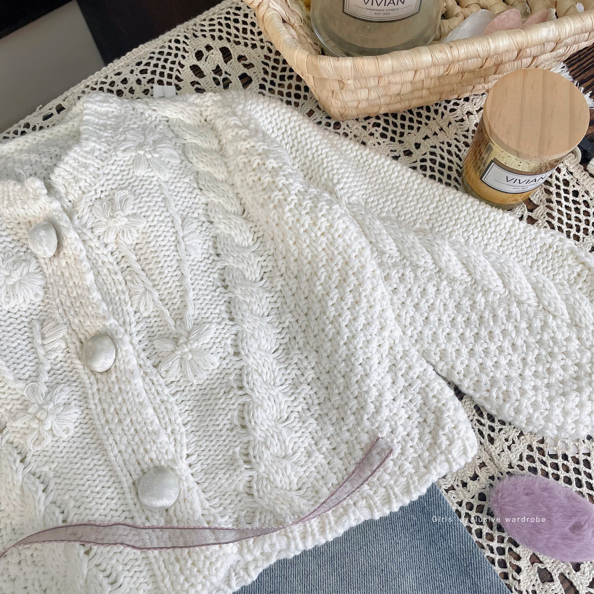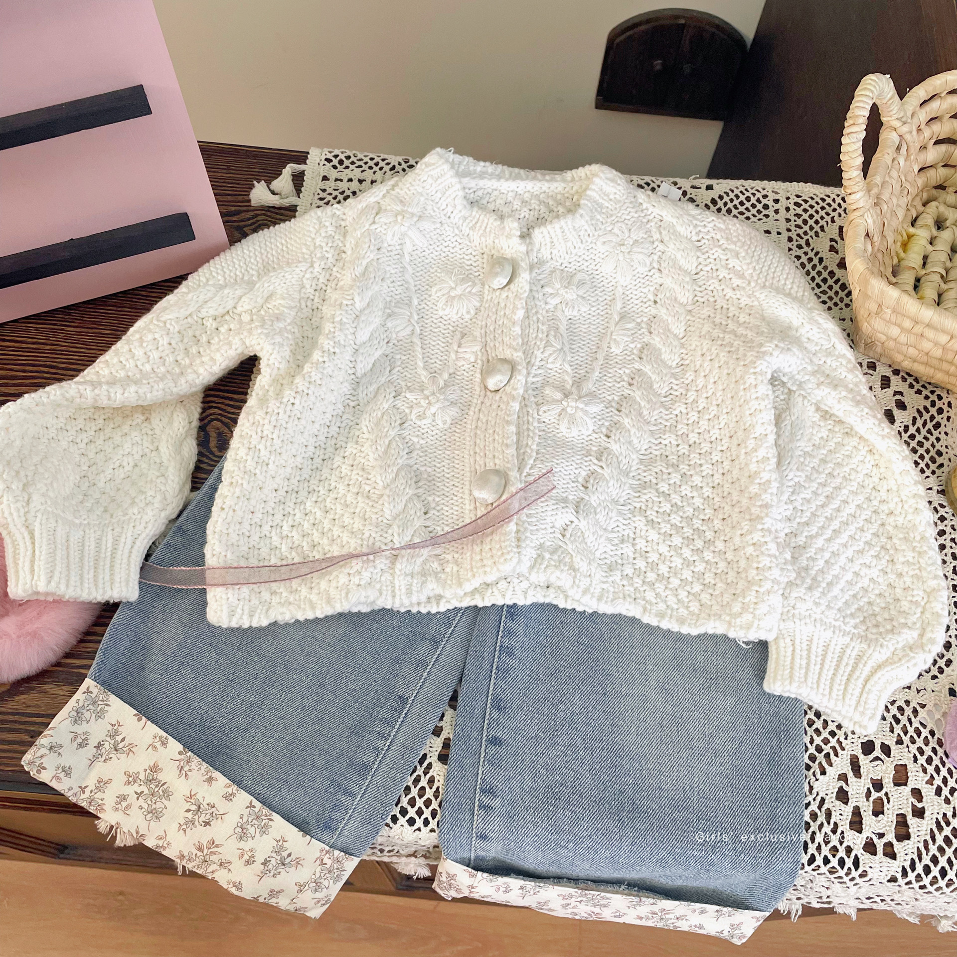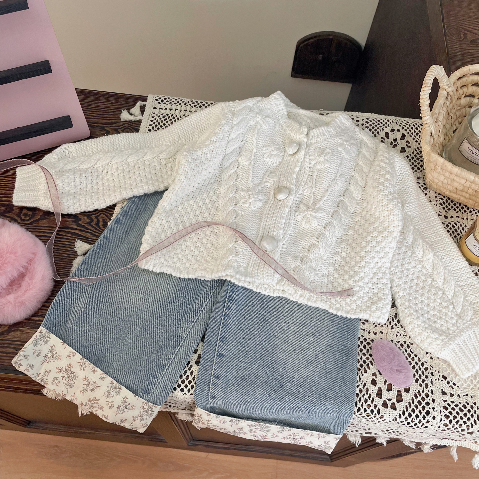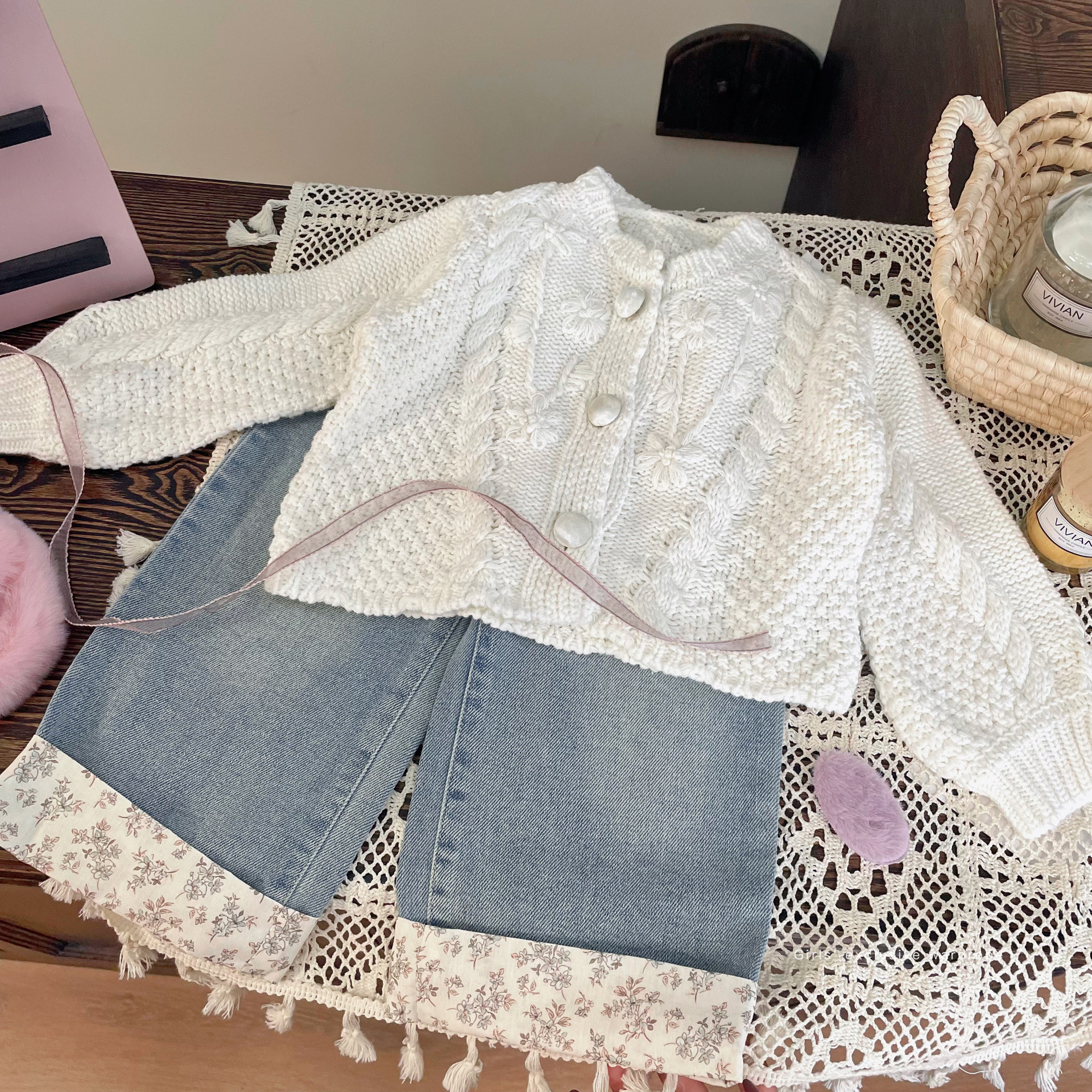 재고정리, 반품불가, 교환불가【합리적인 주문】가을 여아용 흰색 스웨터 가디건+청바지스토어 가기