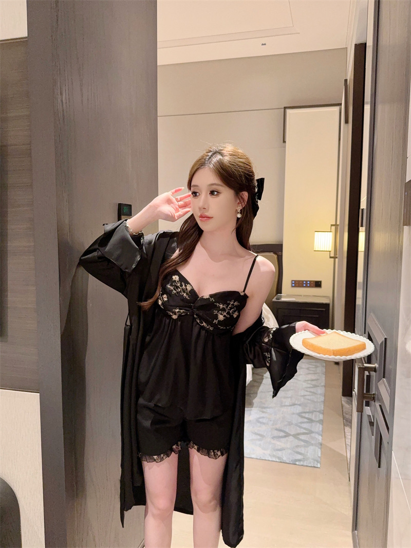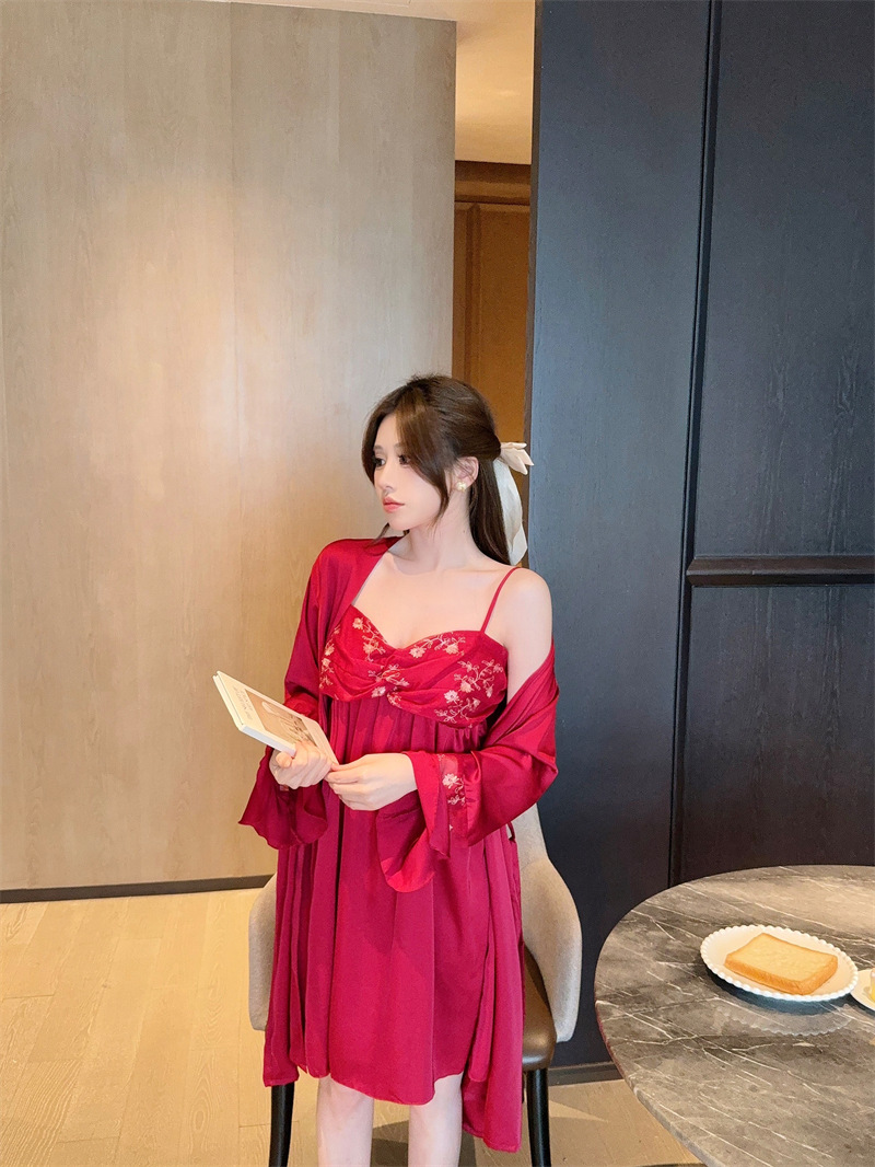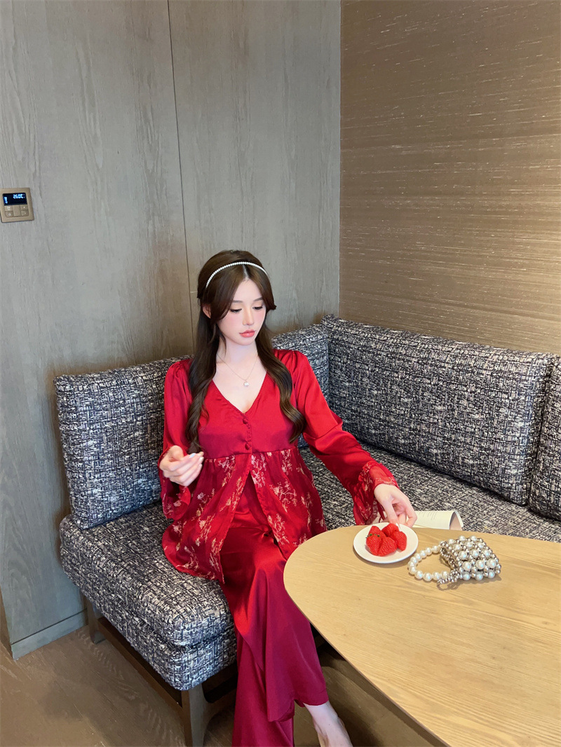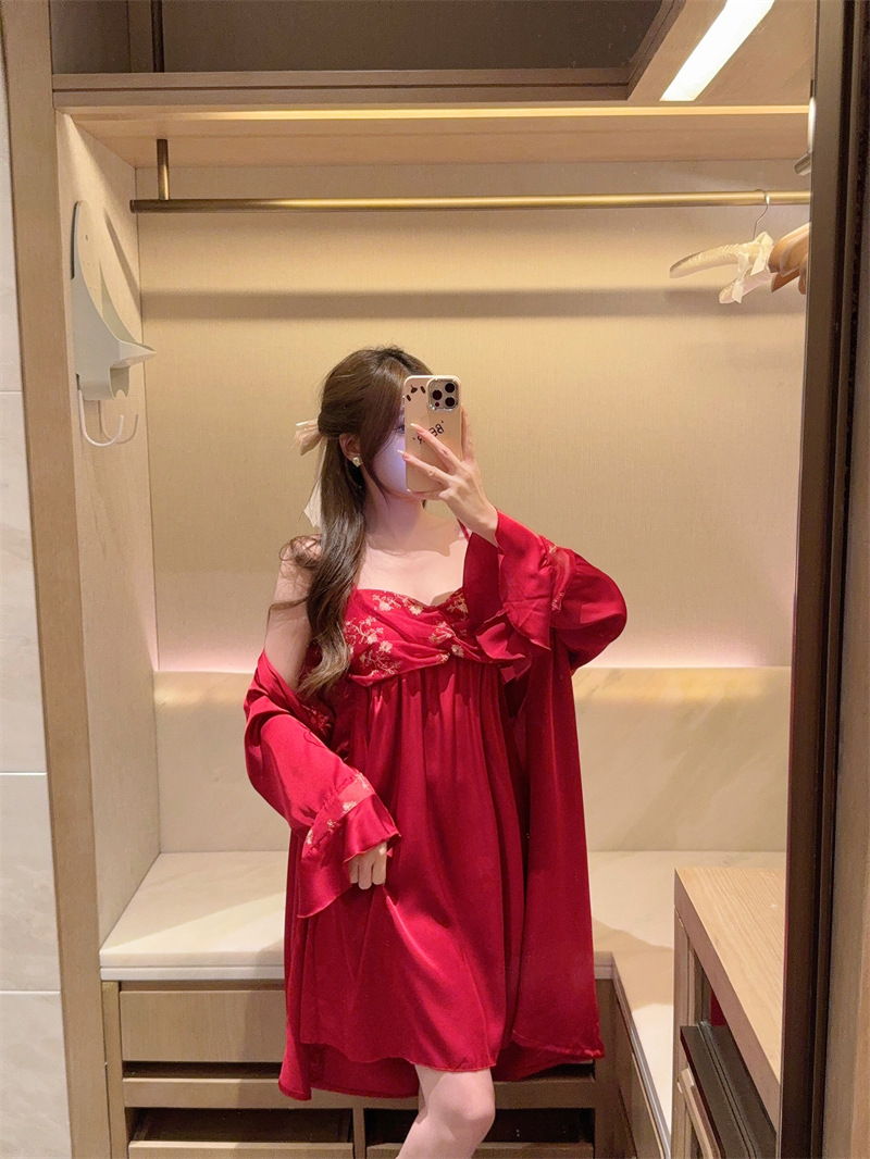자수 레이스 섹시한 중국 스타일 붉은 잠옷 여성 아이스 실크 얇은 신부 스트랩 반바지 잠옷 세트스토어 가기