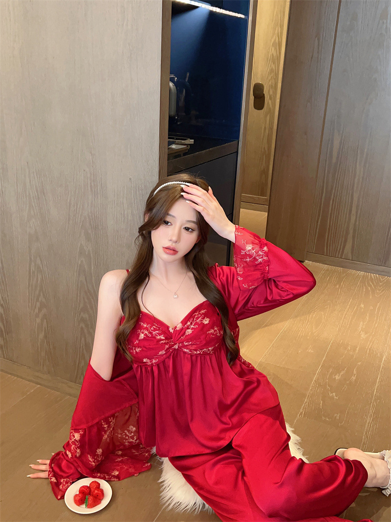 자수 레이스 섹시한 중국 스타일 붉은 잠옷 여성 아이스 실크 얇은 신부 스트랩 반바지 잠옷 세트