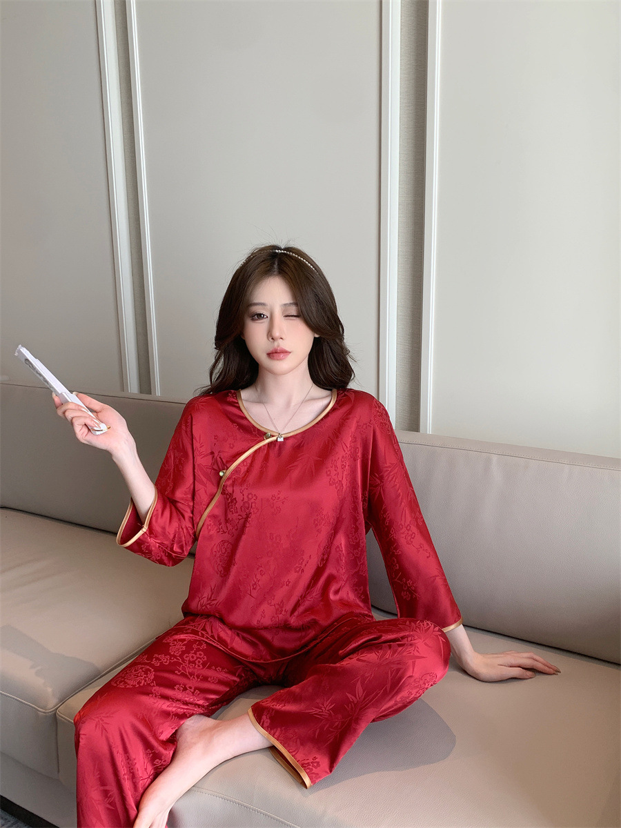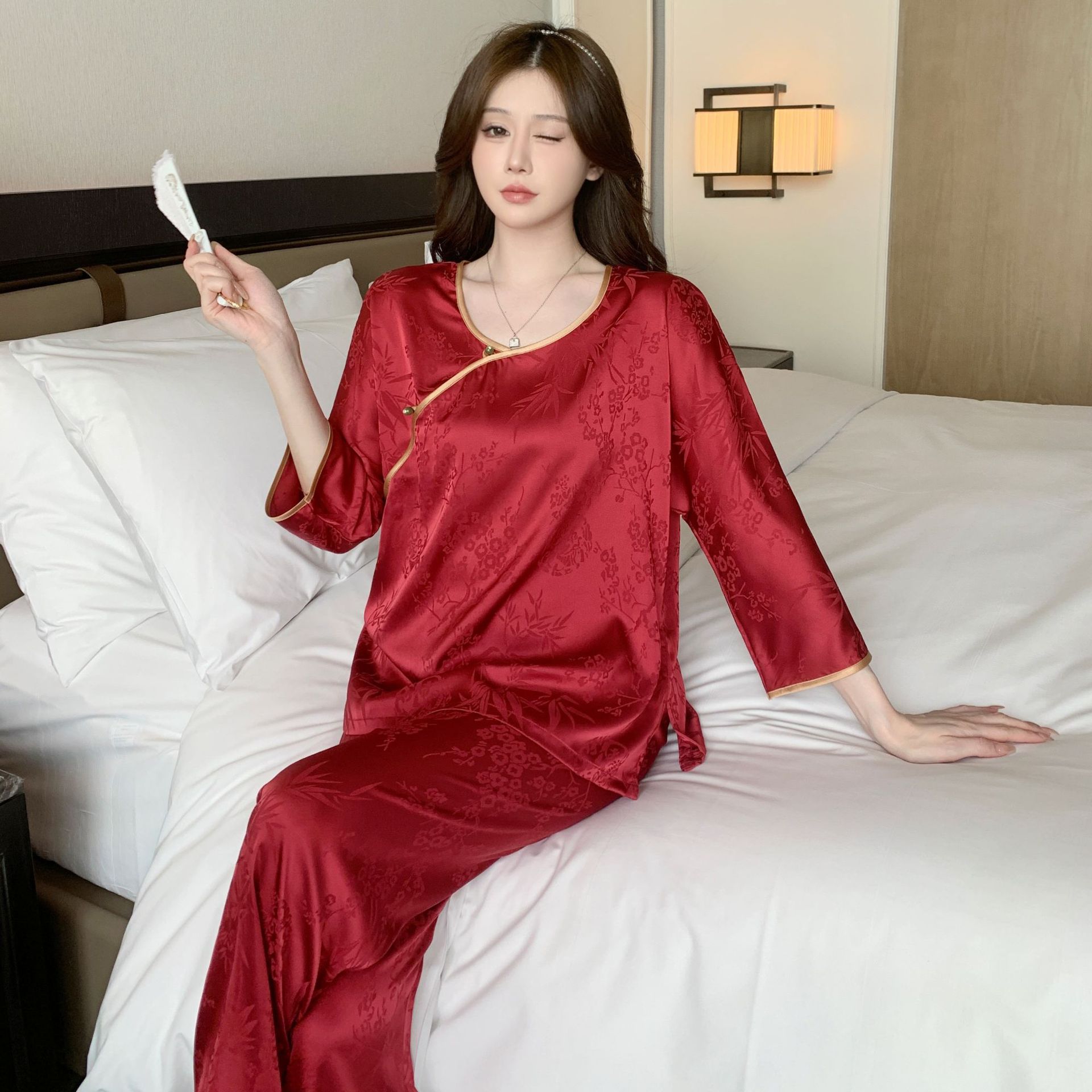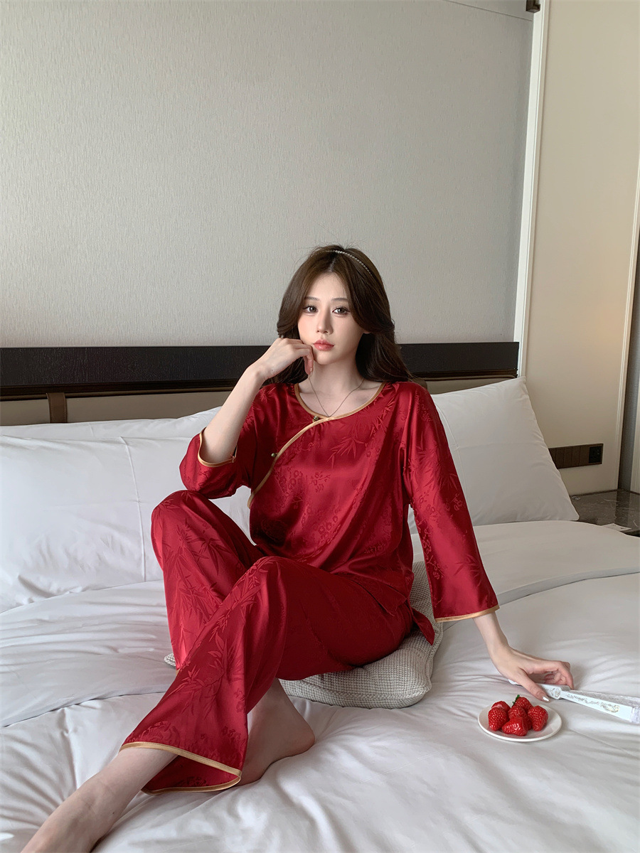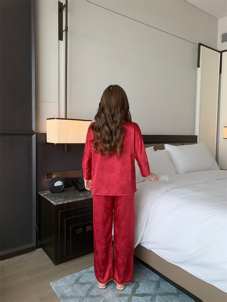 레드 파자마 여성의 봄과 가을 얇은 아이스 실크 긴팔 바지 투피스 세트 중국 스타일 홈웨어는 외부에서 착용 할 수 있습니다.스토어 가기