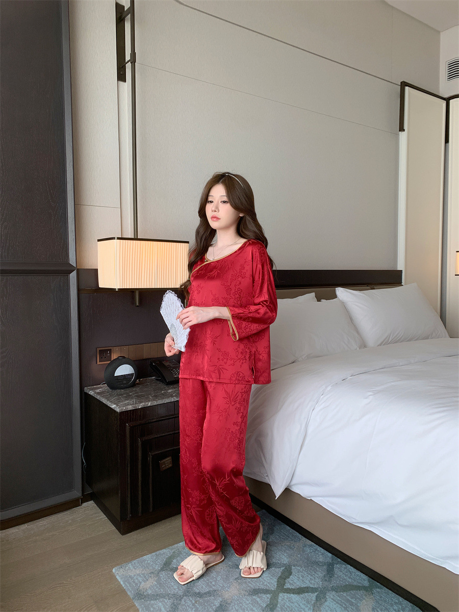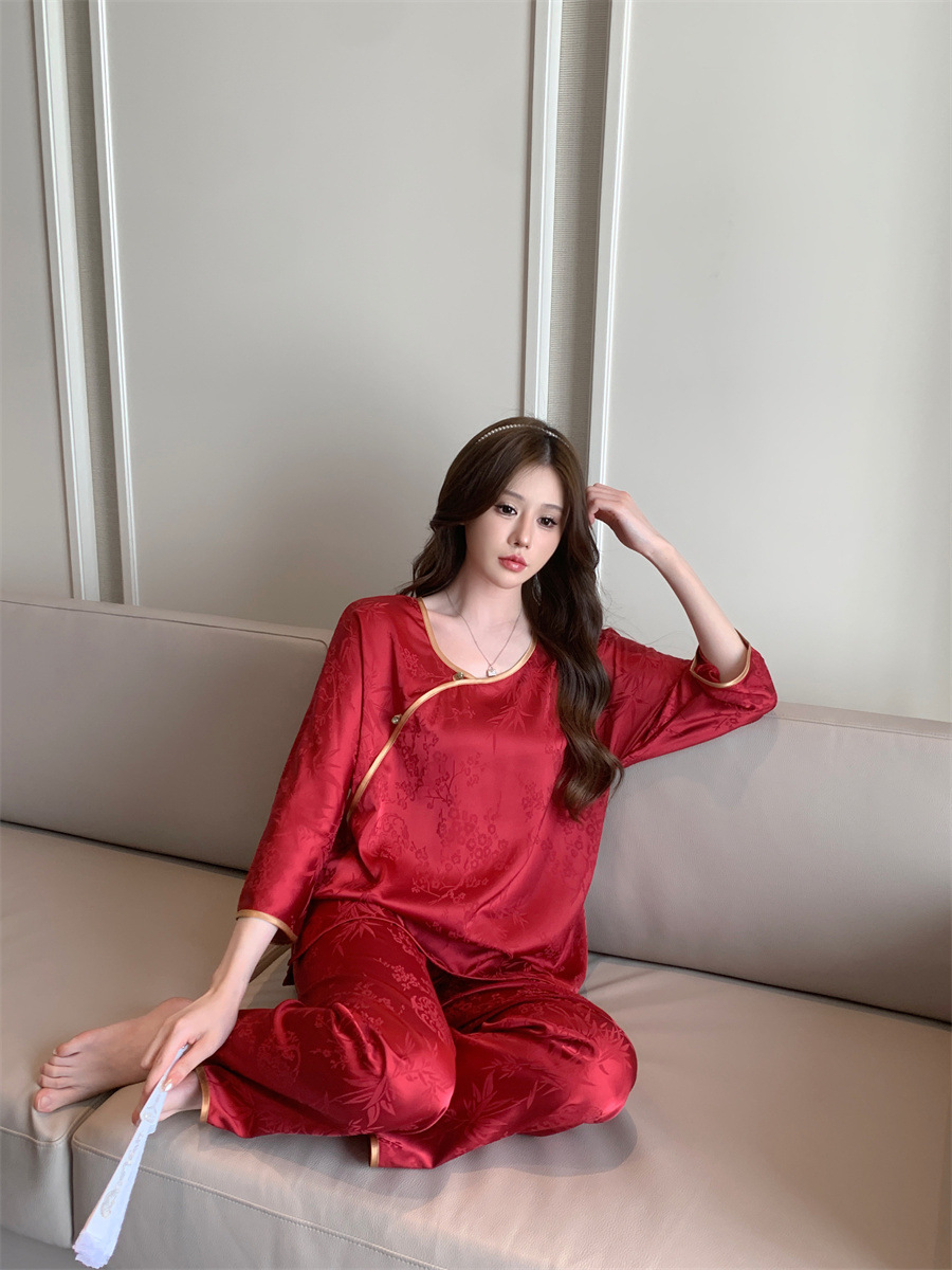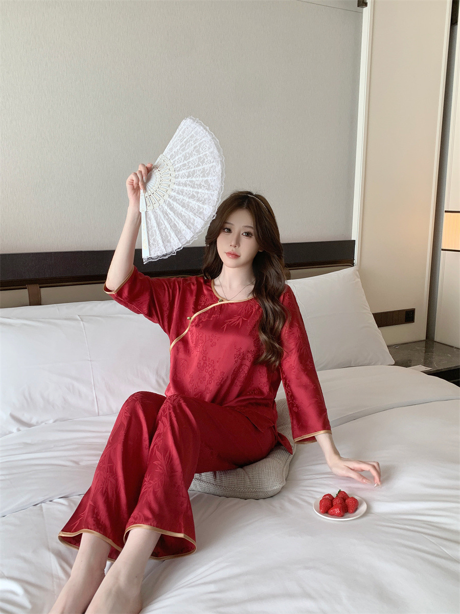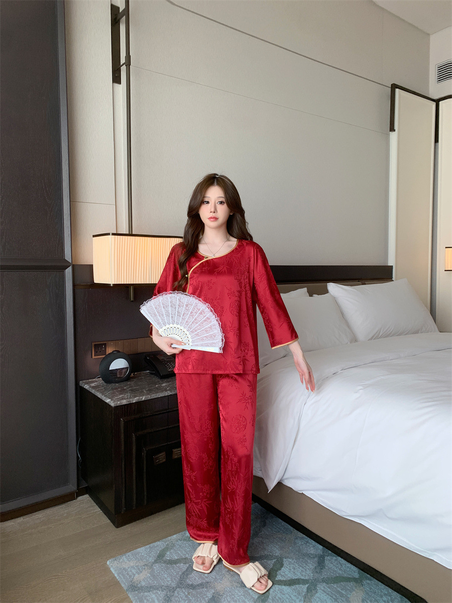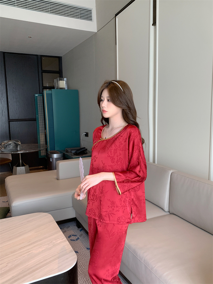 레드 파자마 여성의 봄과 가을 얇은 아이스 실크 긴팔 바지 투피스 세트 중국 스타일 홈웨어는 외부에서 착용 할 수 있습니다.스토어 가기