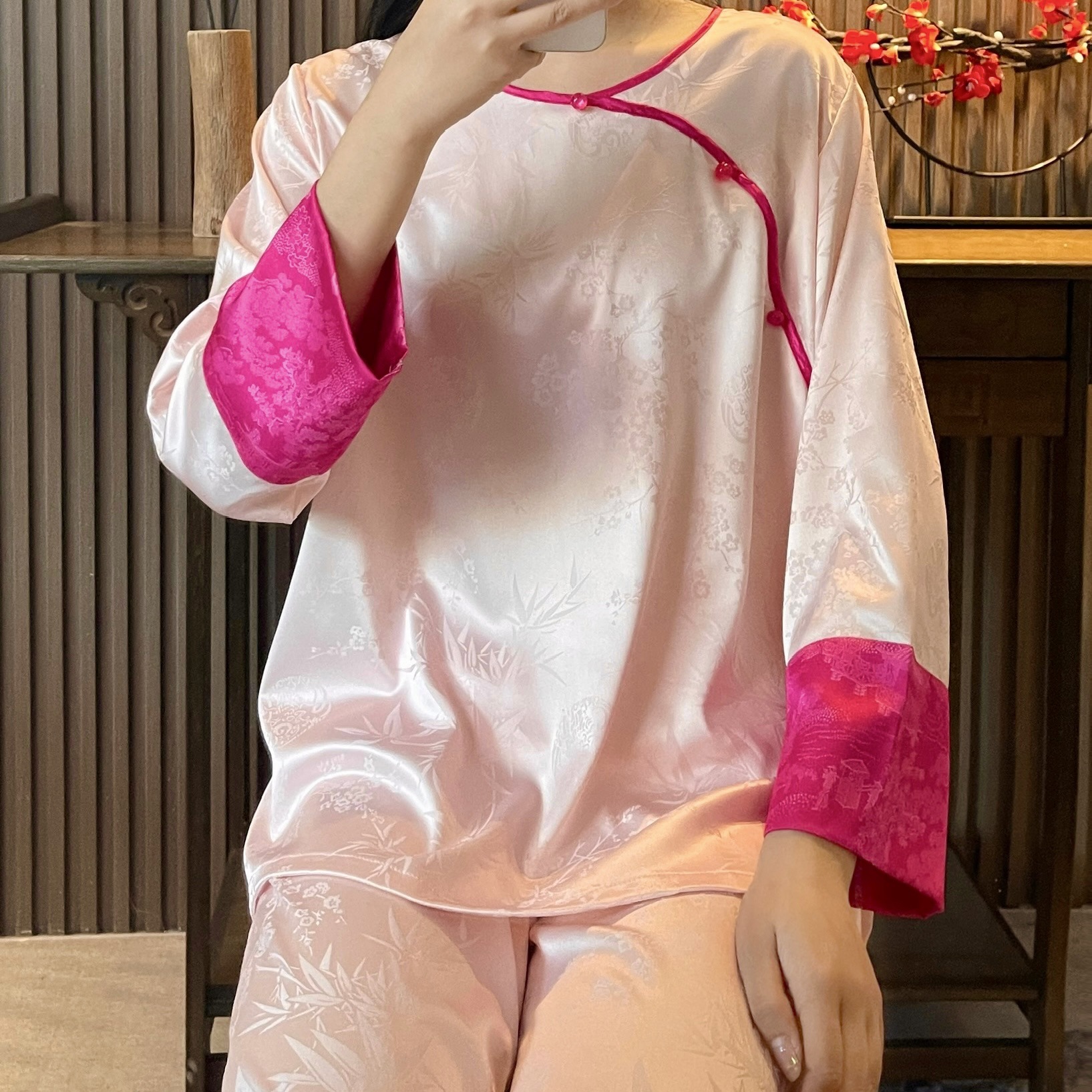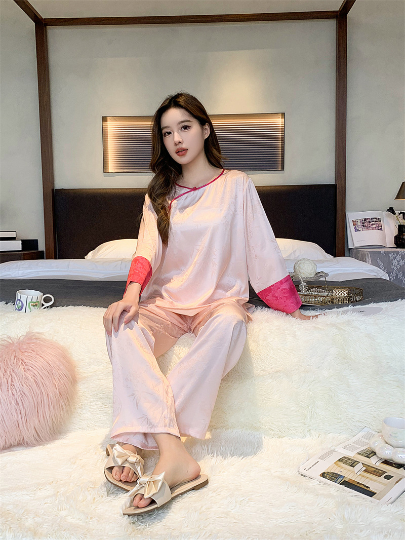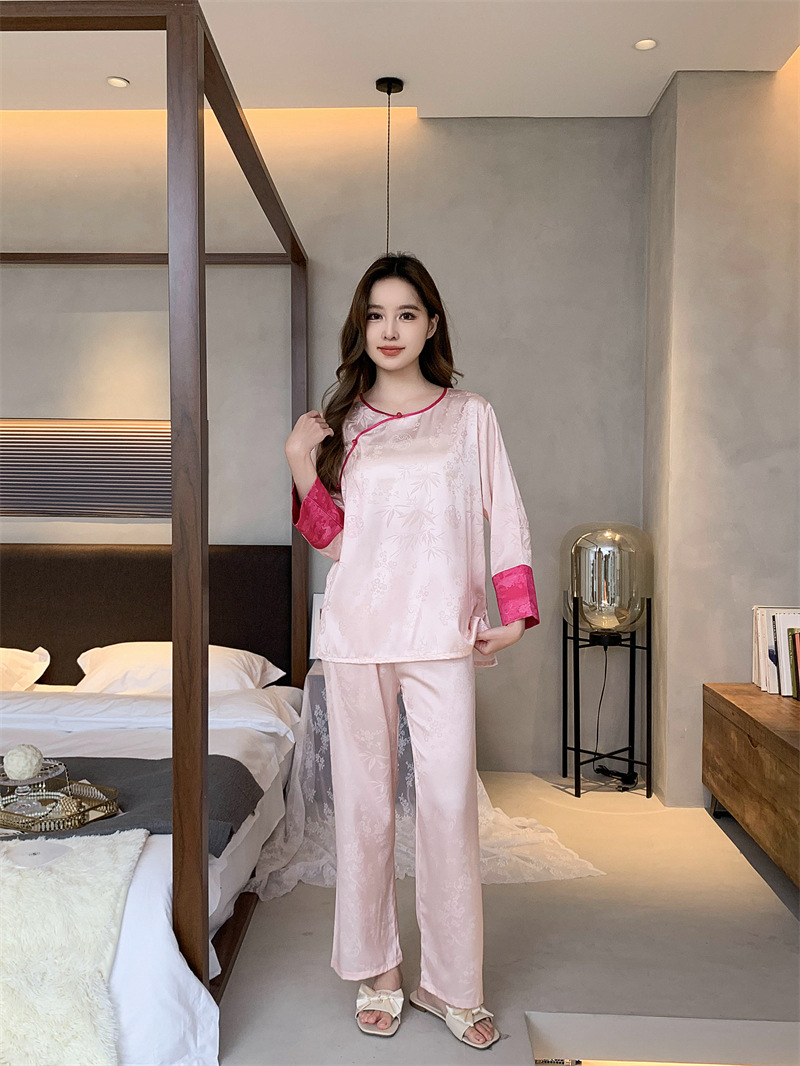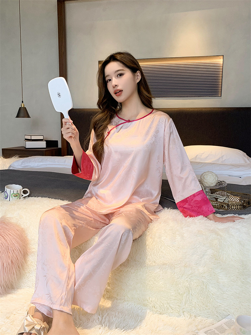 중국 스타일 아이스 실크 파자마 여성의 봄과 여름 얇은 홈웨어 세트 복고풍 자카드 고급은 외부에서 착용 할 수 있습니다.스토어 가기