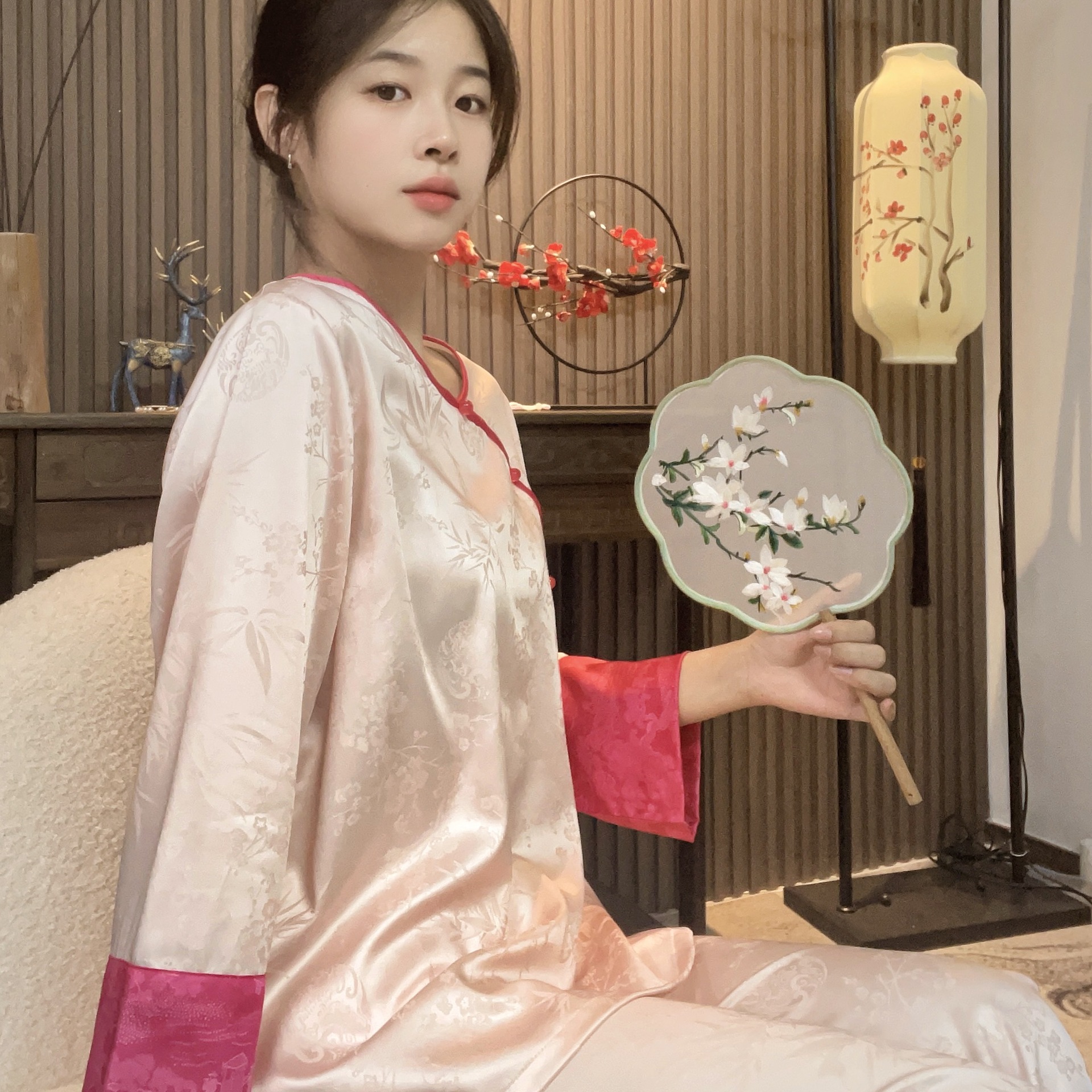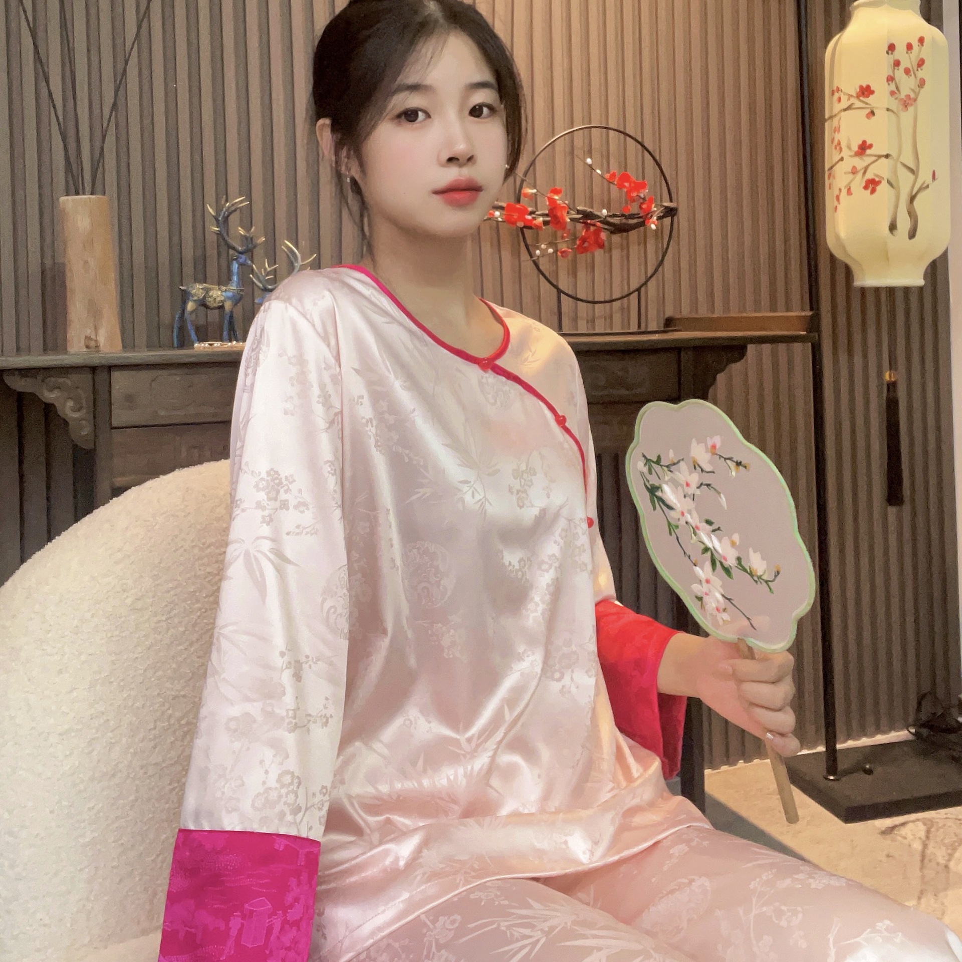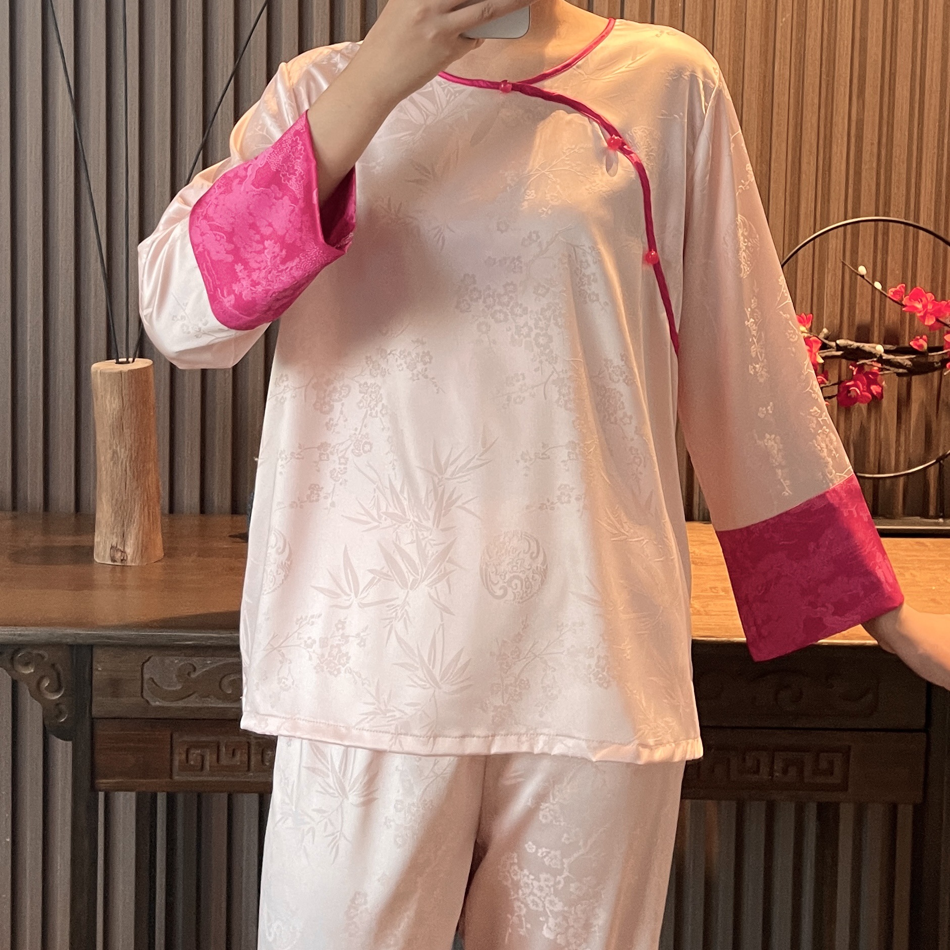 중국 스타일 아이스 실크 파자마 여성의 봄과 여름 얇은 홈웨어 세트 복고풍 자카드 고급은 외부에서 착용 할 수 있습니다.스토어 가기