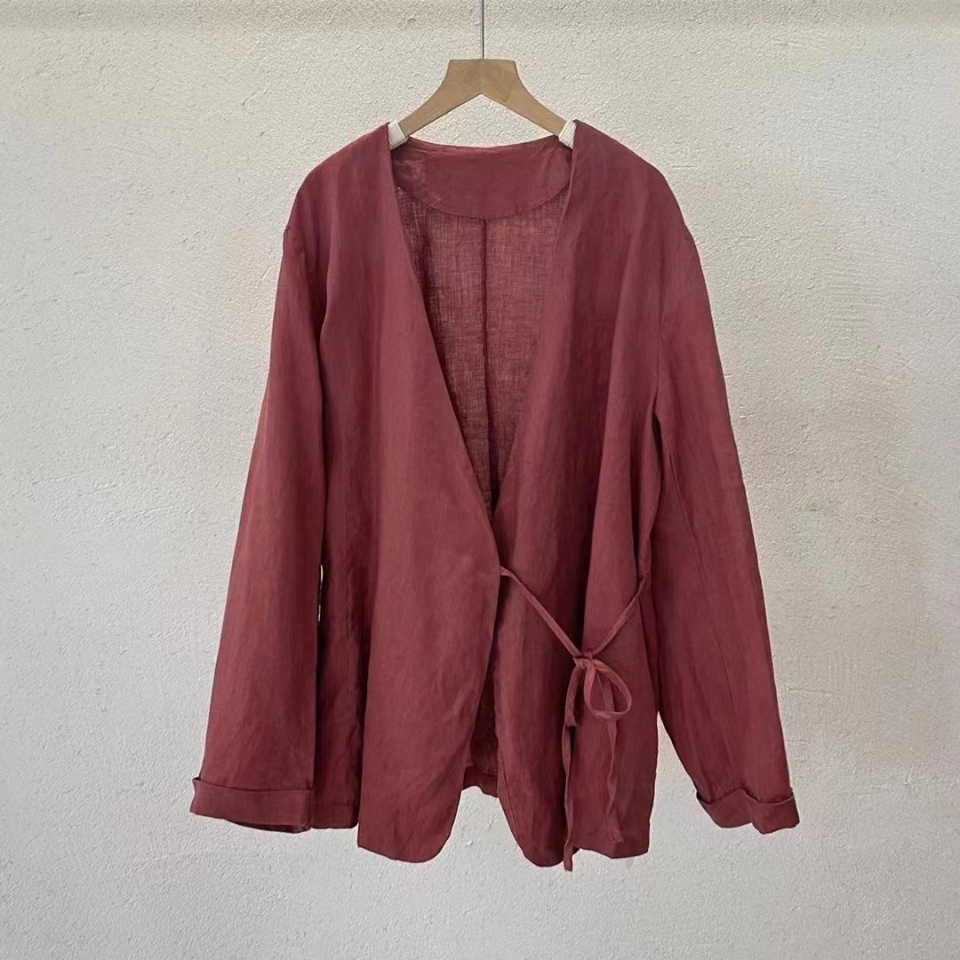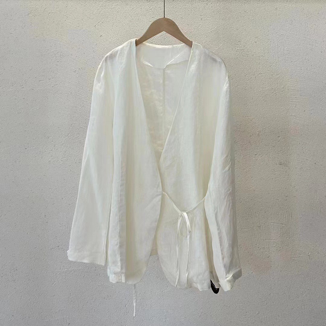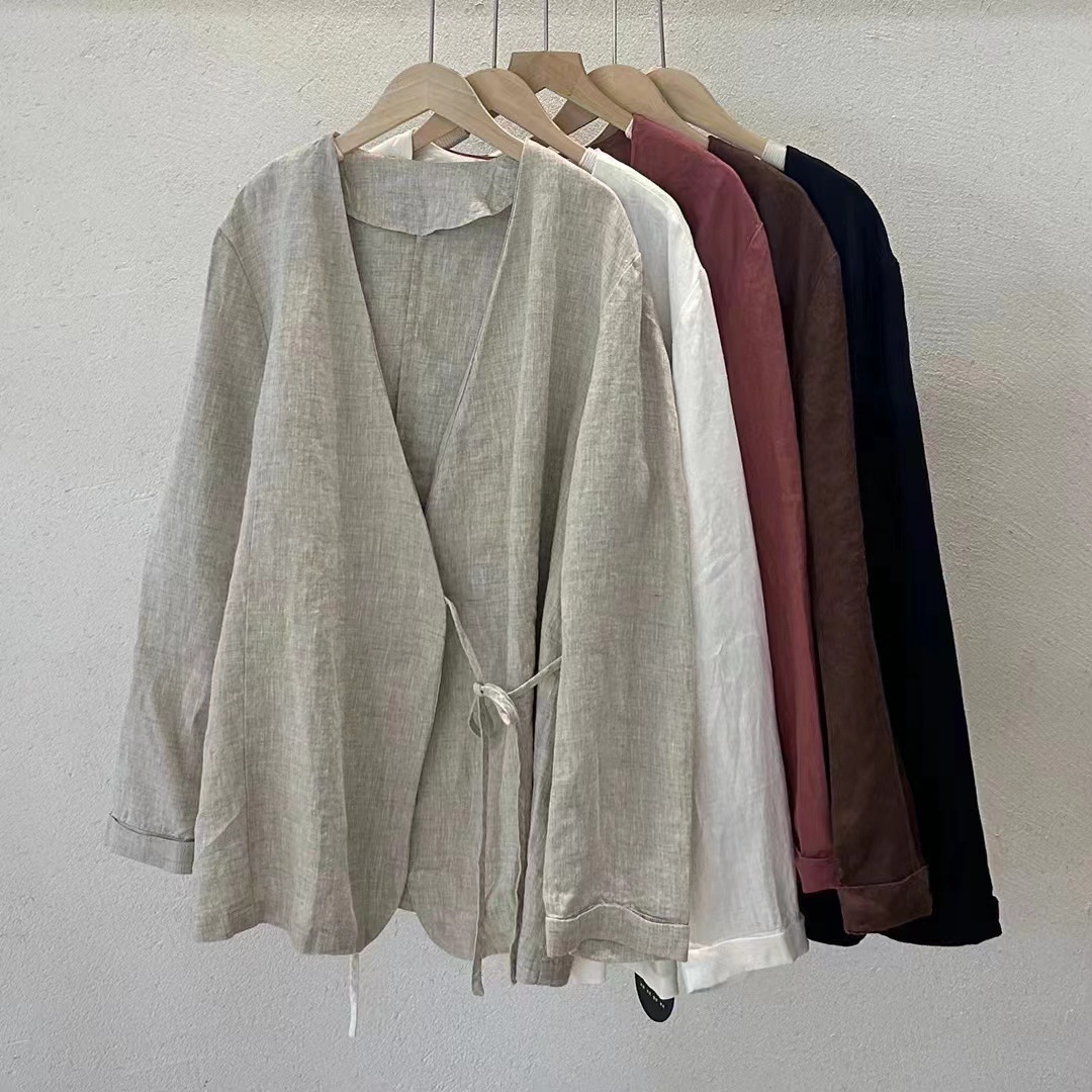 카디건 깊은 V 단색 레이스 업 긴 소매 예술적 복고풍 스타일 카디건 여성의 다재다능한 봄 새 린넨 셔츠스토어 가기