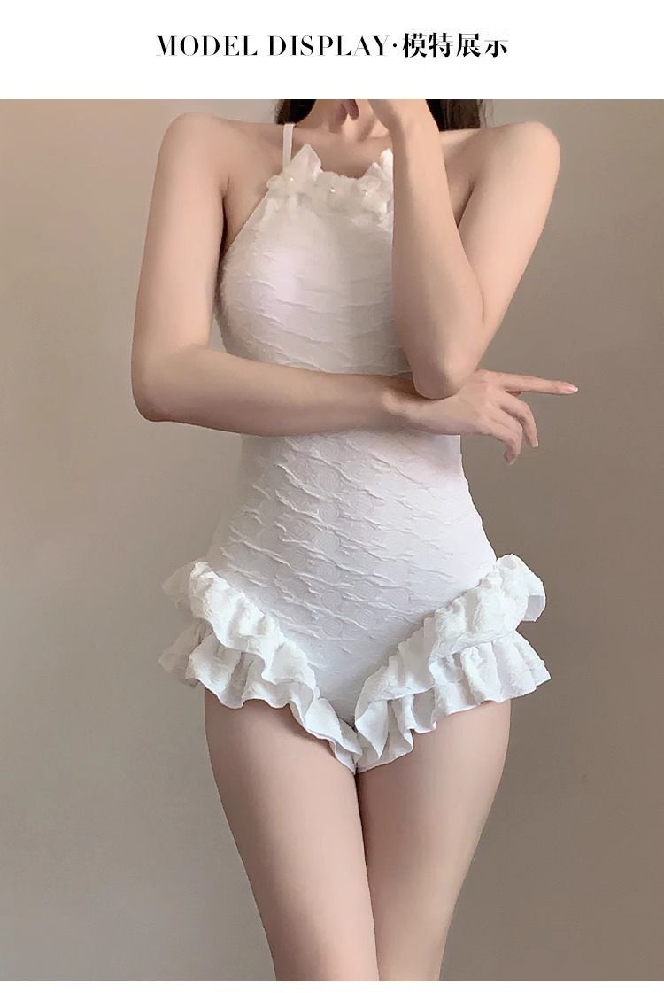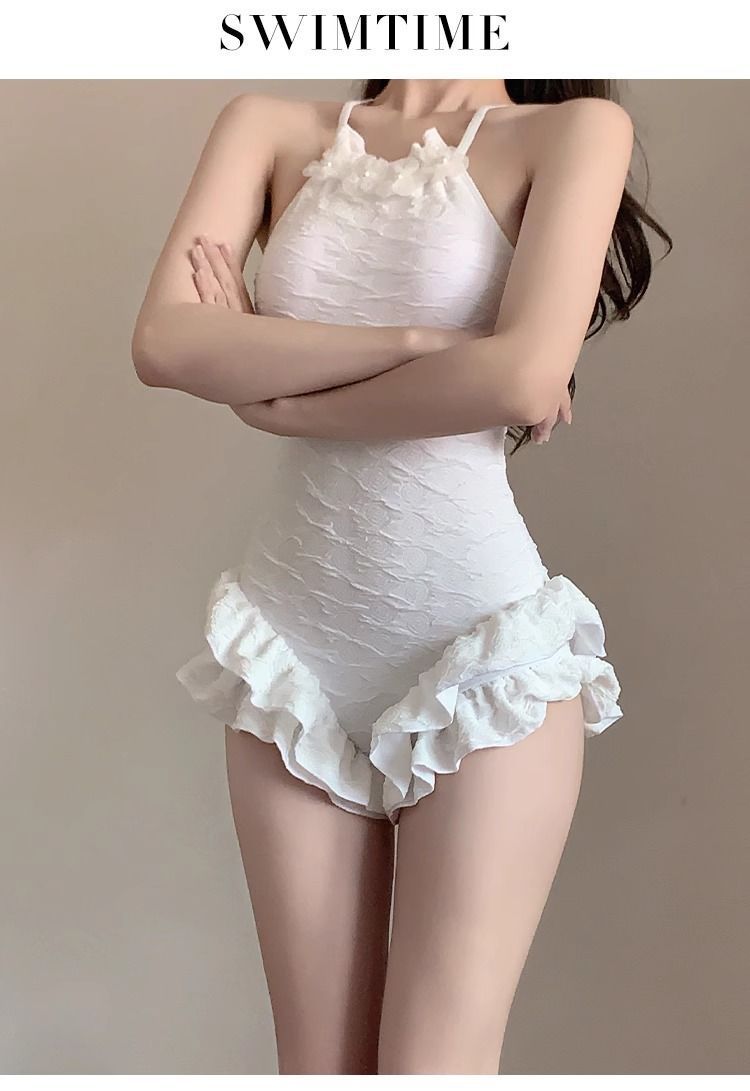 원피스 흰색 수영복 여성의 보수적 인 스트랩 복서 일본 귀여운 작은 가슴 수영복 2024 덮는 슬리밍 배