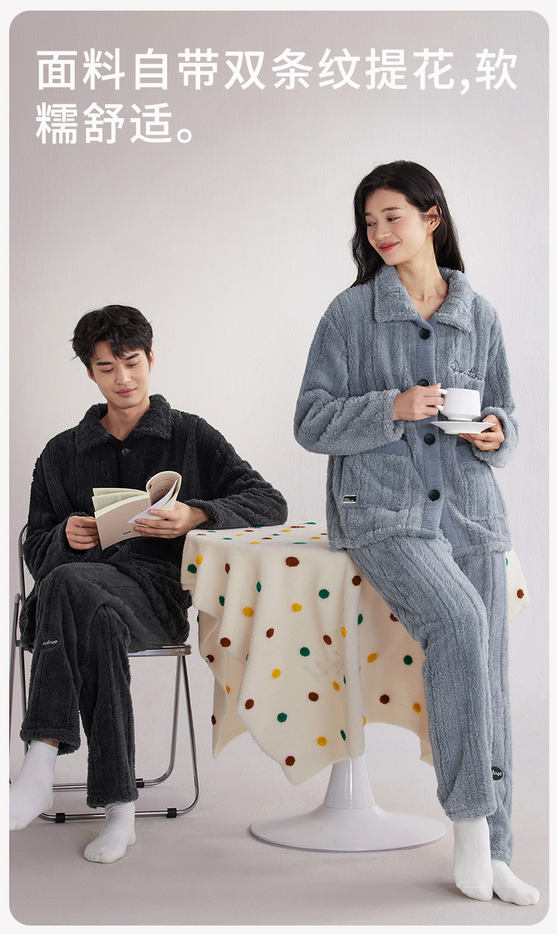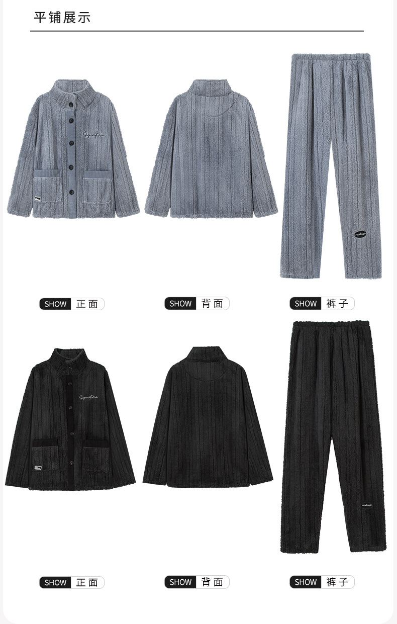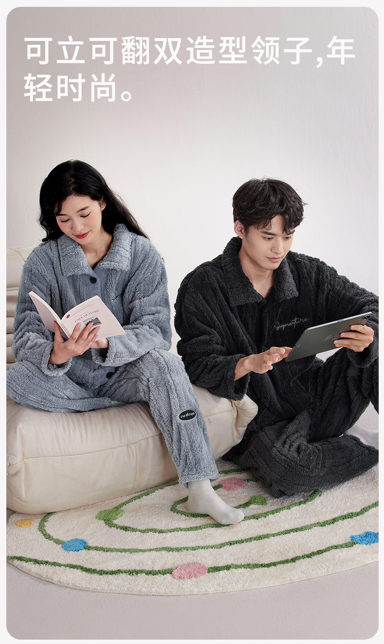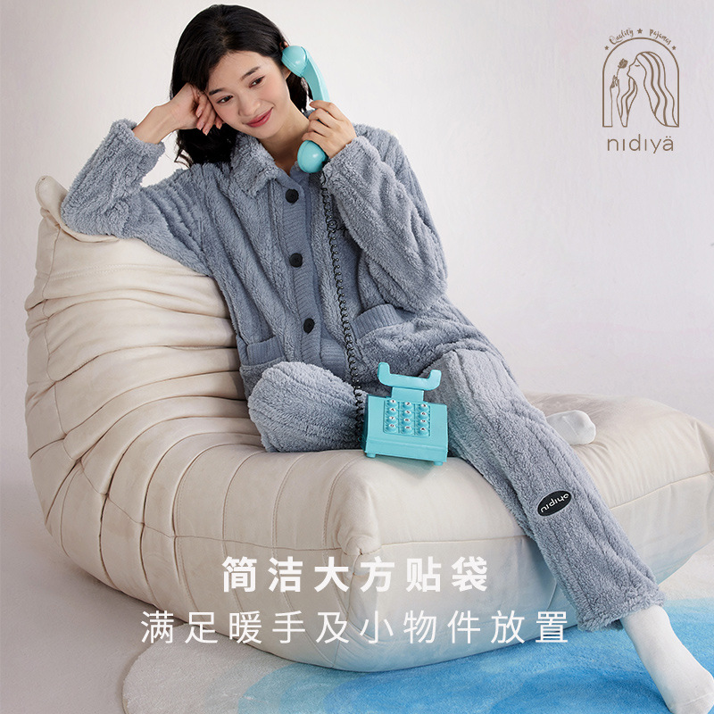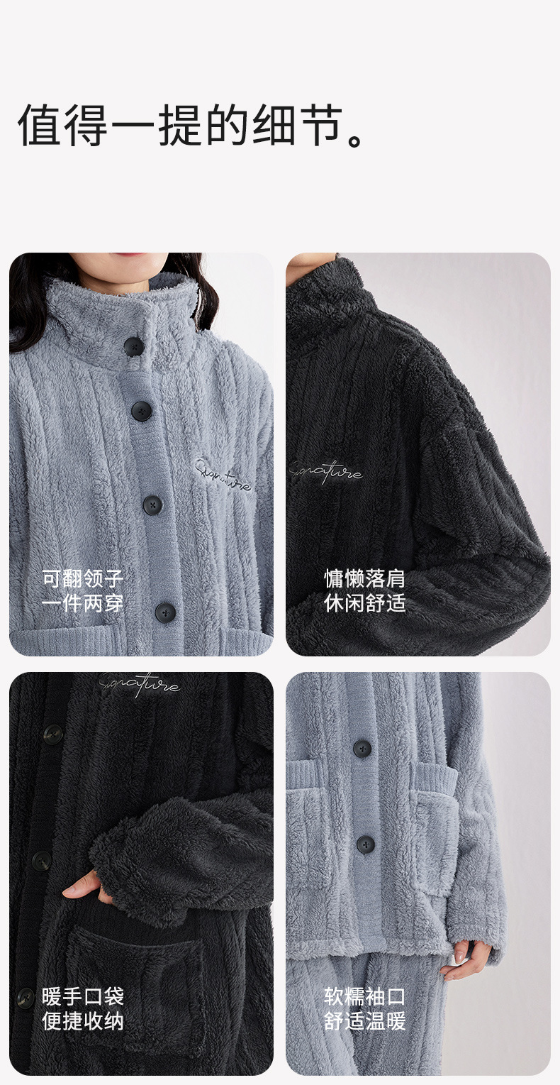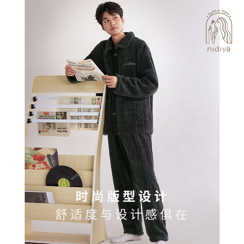 Nidiya 잠옷 여성의 겨울 산호 양털 따뜻한 스탠드 칼라 남성 캐주얼 카디건 패션 스트라이프 홈웨어 세트