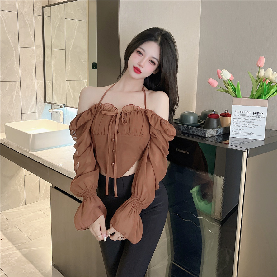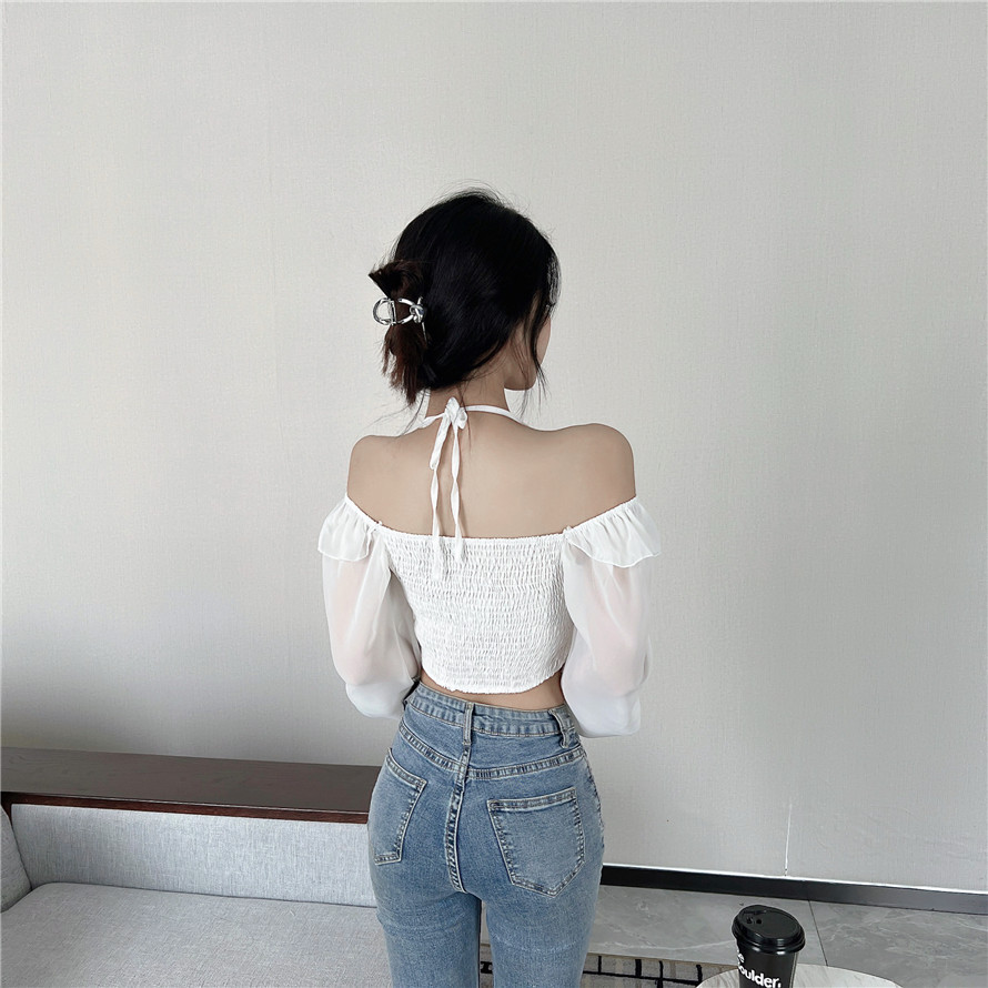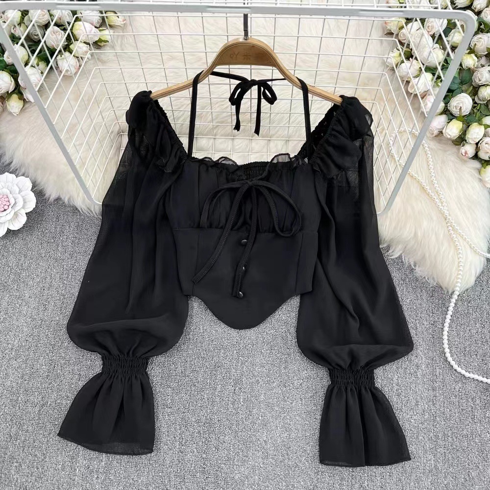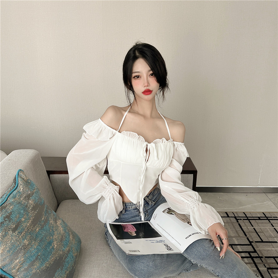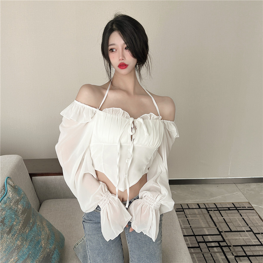 크로스보더 원숄더 레이스업 긴팔 백리스 서스펜더 셔츠 홀터넥 쇼트 패딩 탑 쉬폰 셔츠