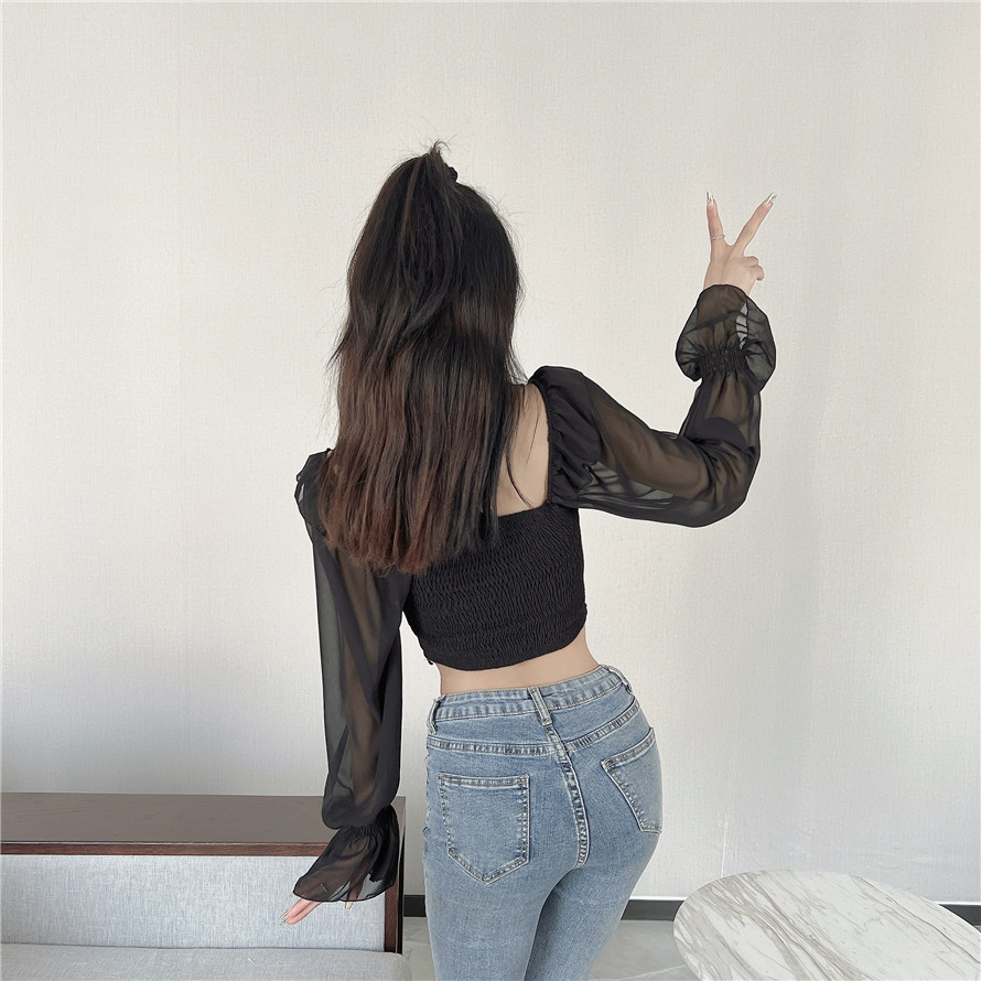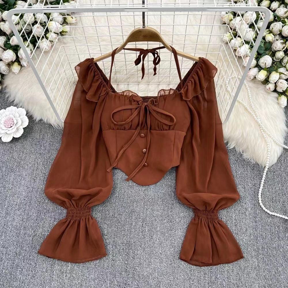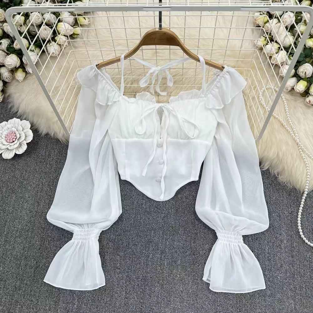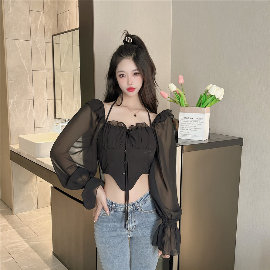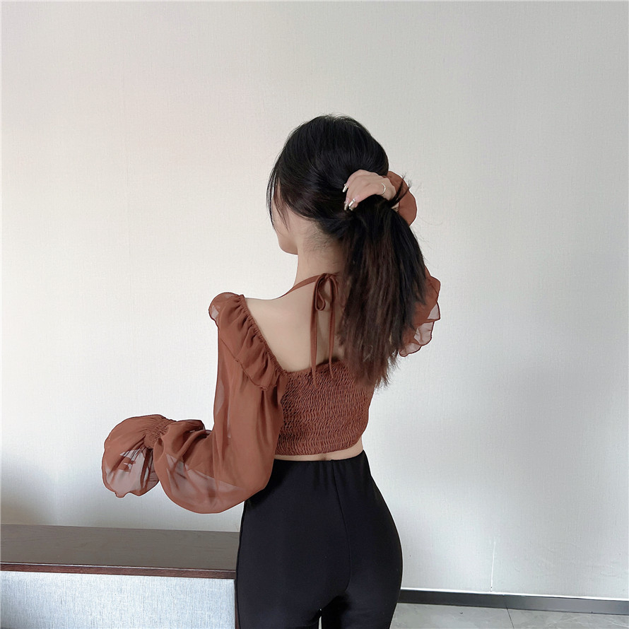 크로스보더 원숄더 레이스업 긴팔 백리스 서스펜더 셔츠 홀터넥 쇼트 패딩 탑 쉬폰 셔츠