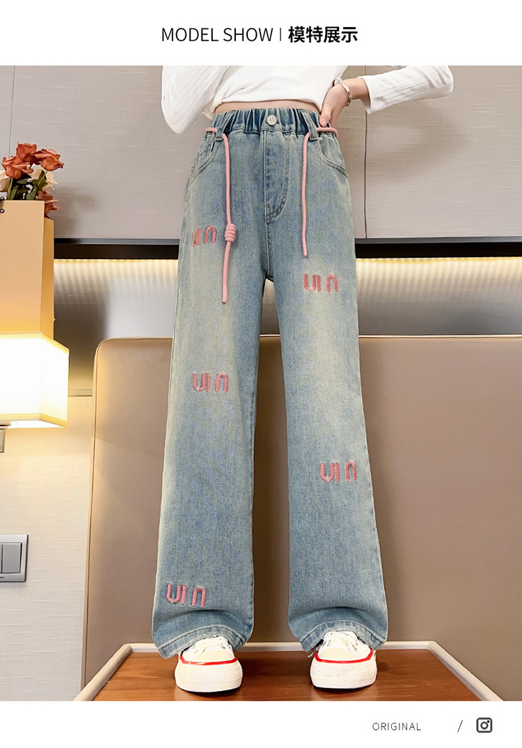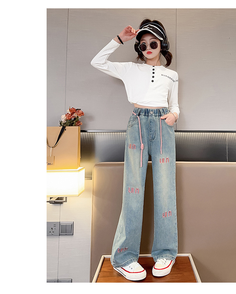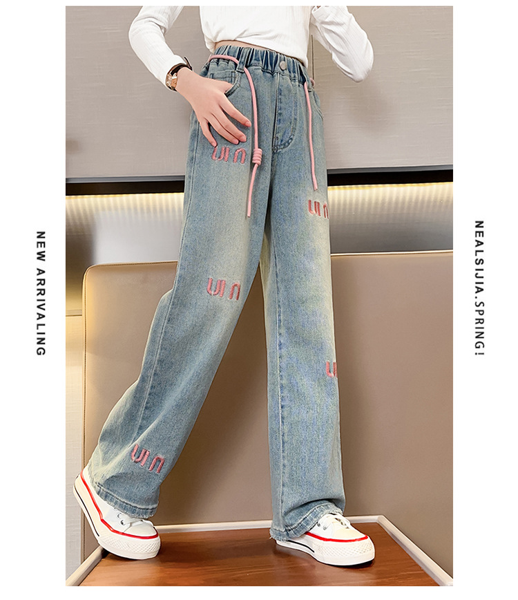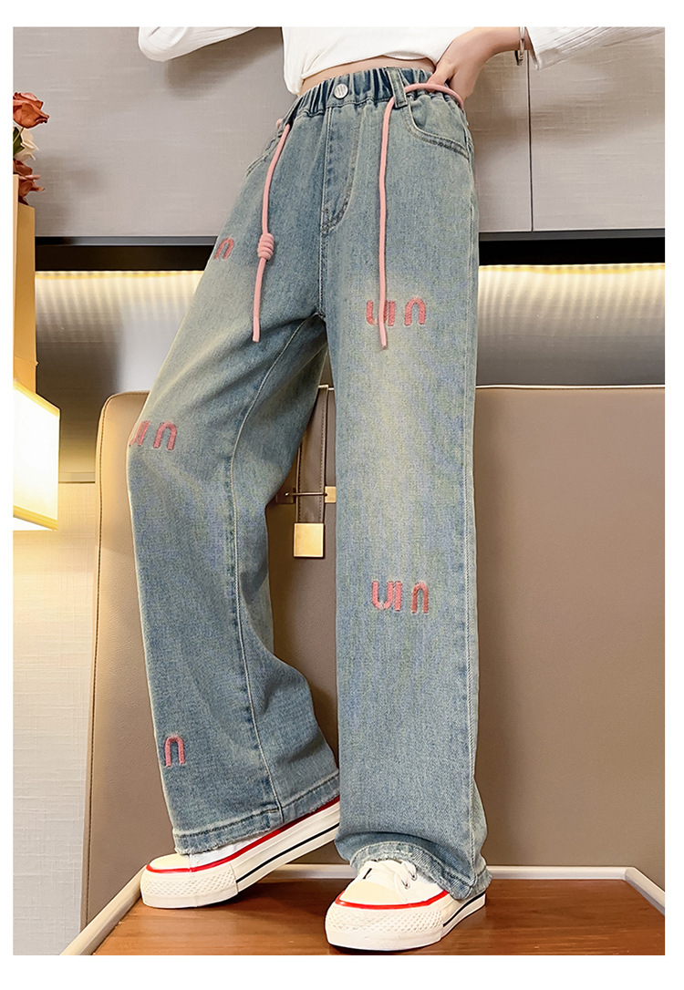 소녀의 봄 자수 편지 청바지 2024 새로운 중형 및 대형 어린이 서양식 캐주얼 와이드 레그 팬츠 롱 팬츠 패션스토어 가기