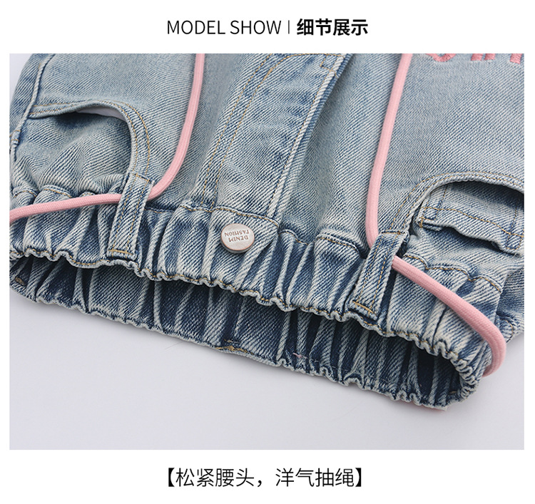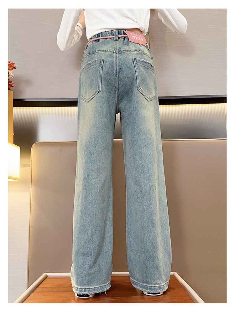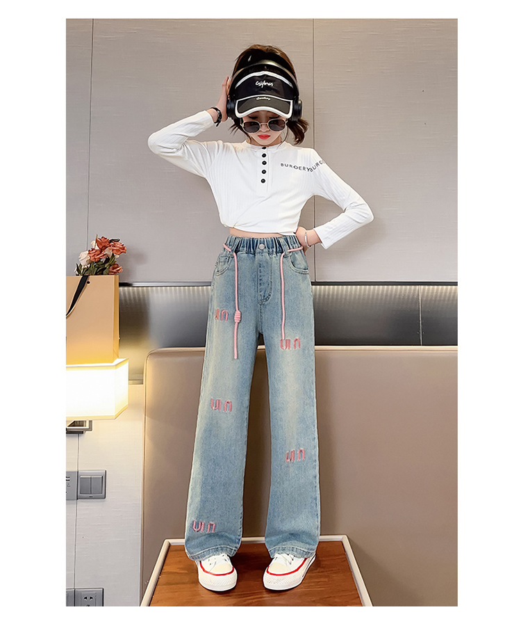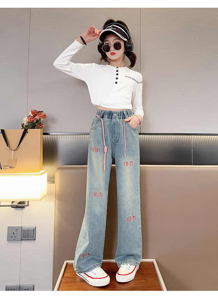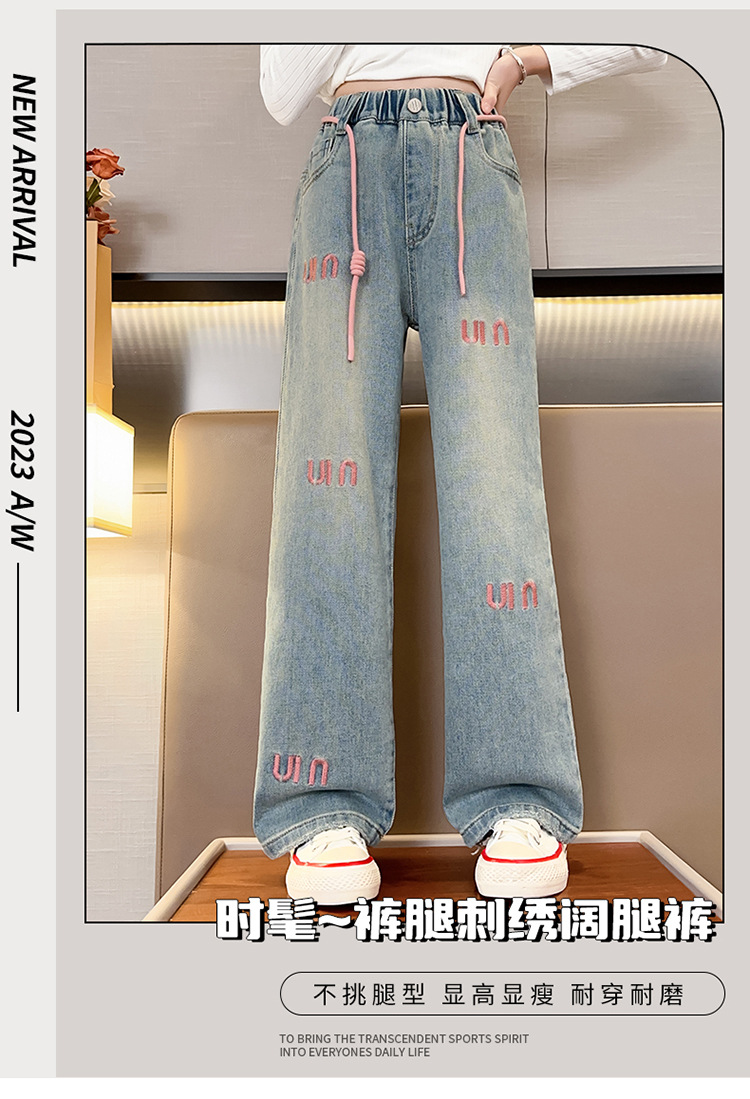 소녀의 봄 자수 편지 청바지 2024 새로운 중형 및 대형 어린이 서양식 캐주얼 와이드 레그 팬츠 롱 팬츠 패션스토어 가기