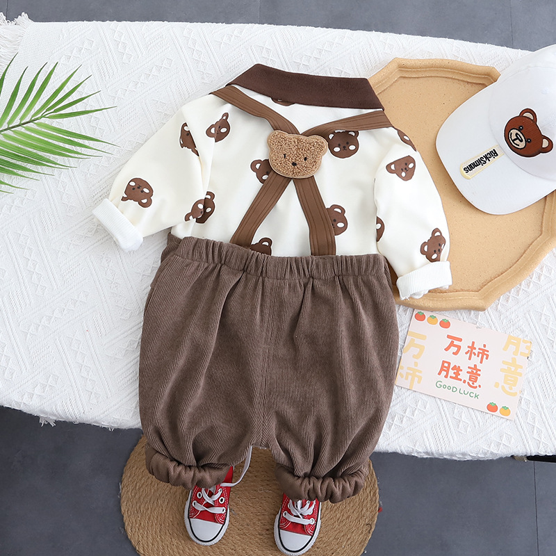 소년의 서양식 인쇄 된 곰 서스펜더 바지 세트 봄과 가을 새로운 아기 귀여운 투피스 세트 아기 의류 패션