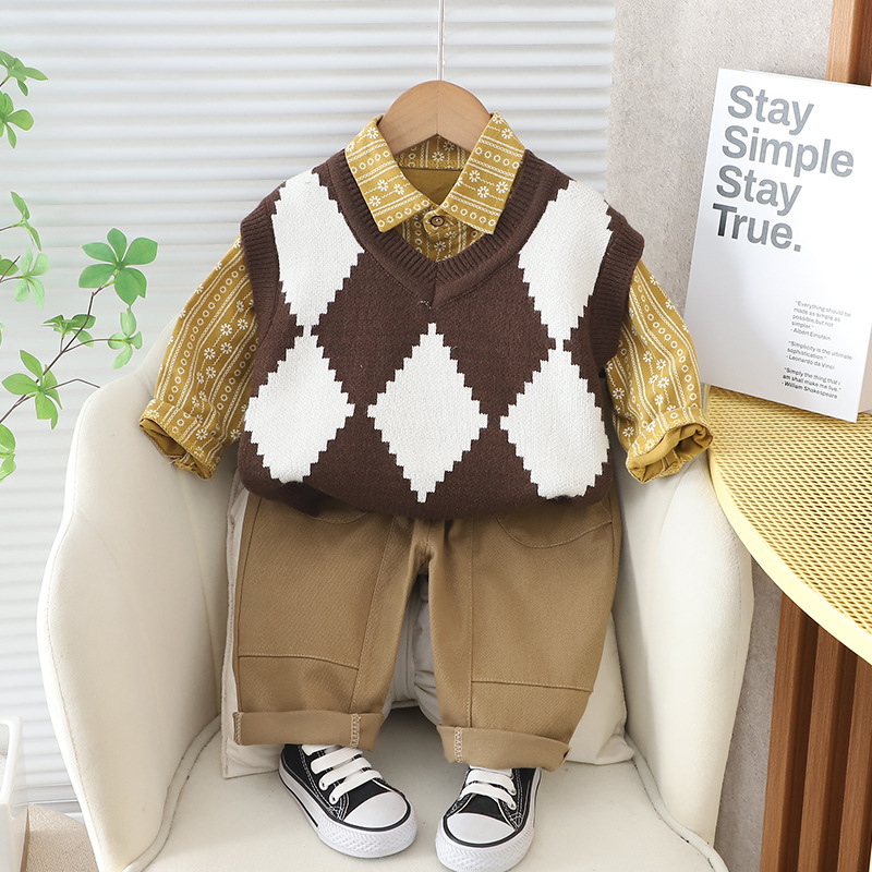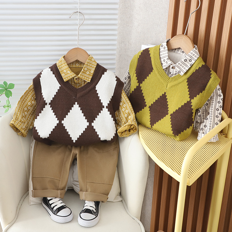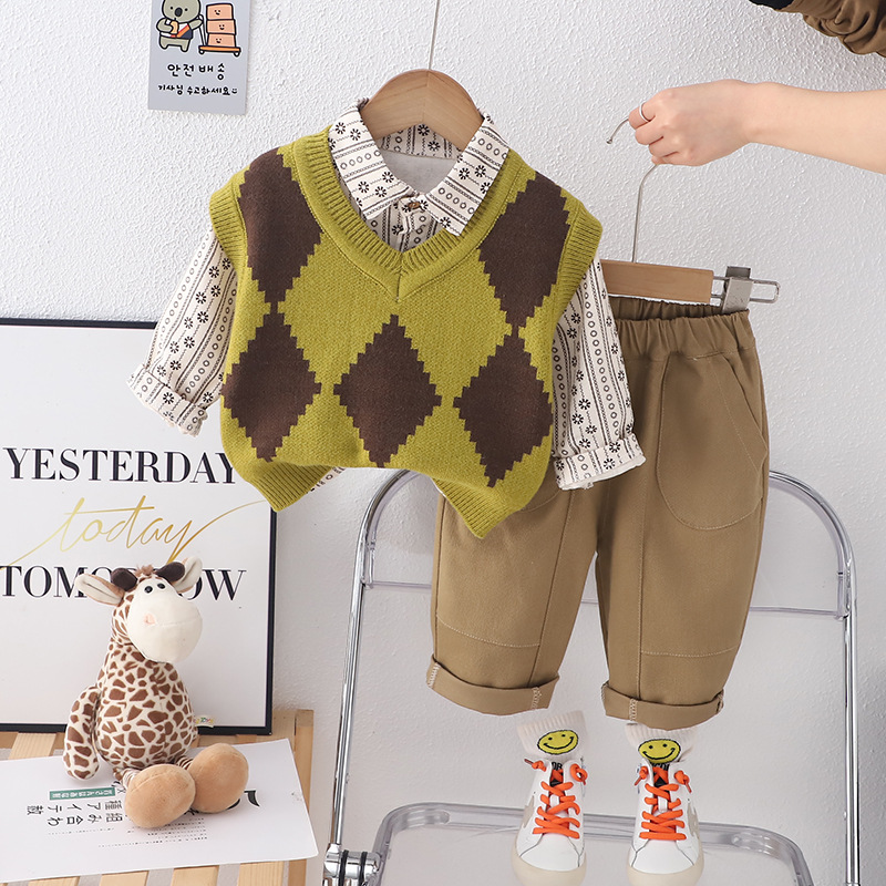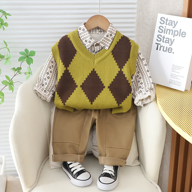 소년 스웨터 세트 2024 봄과 가을 아동복 새로운 서양식 다이아몬드 스웨터 3 피스 봄 의류 한국식 세트 패션