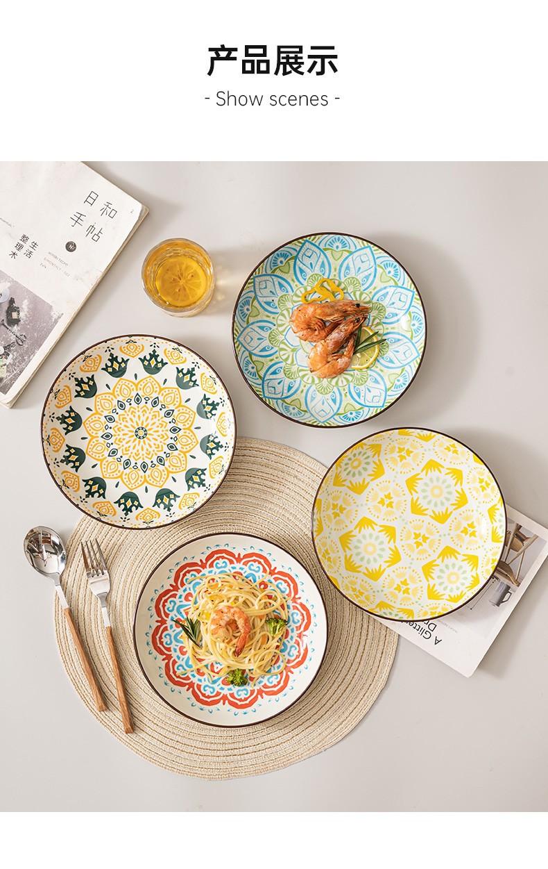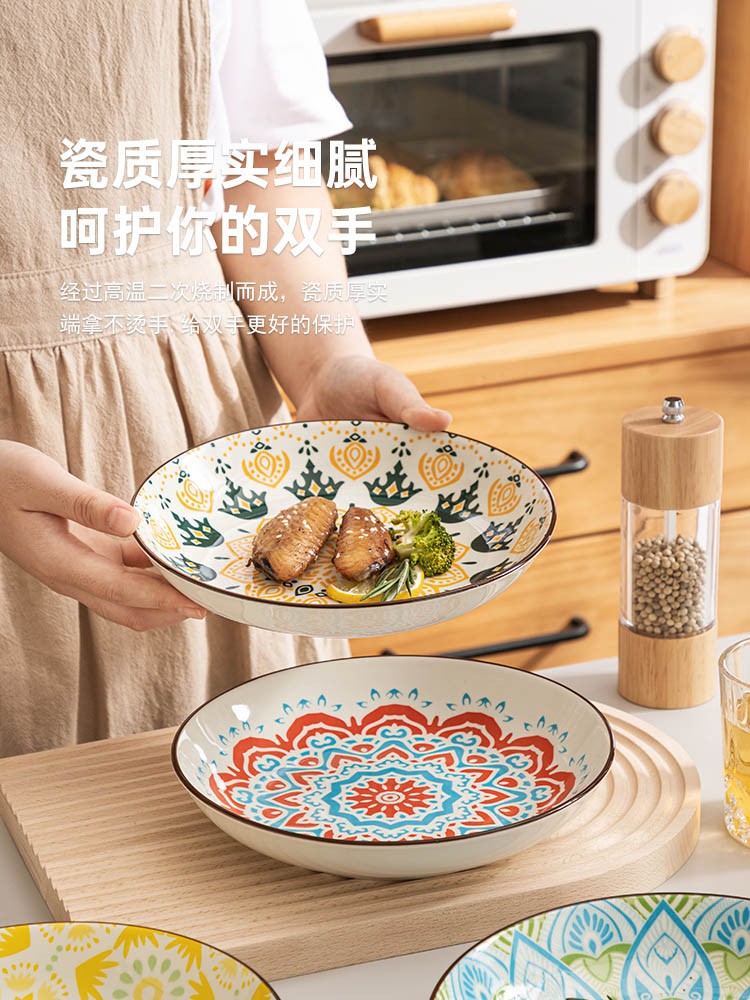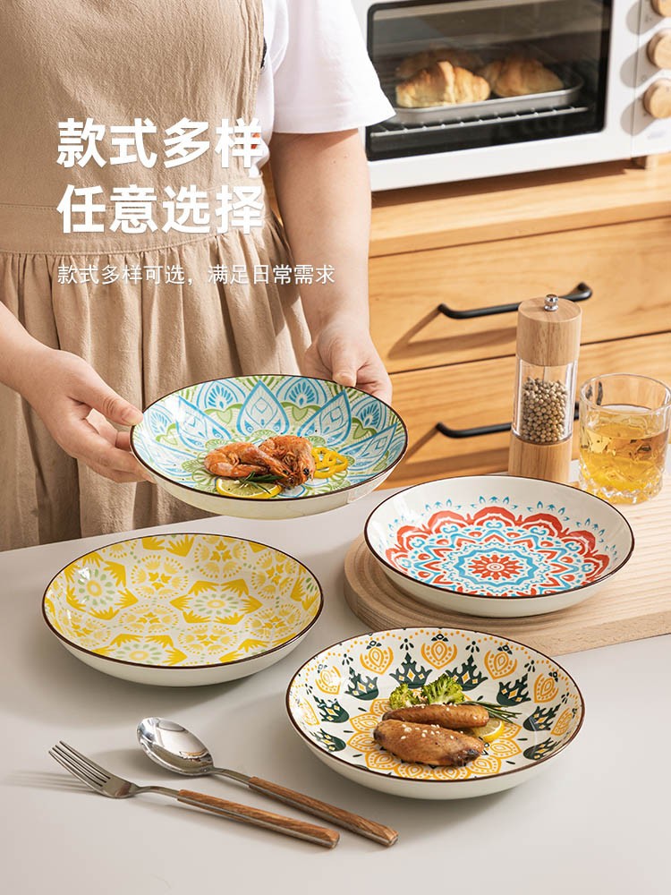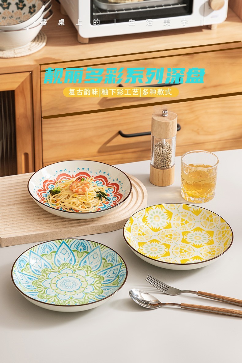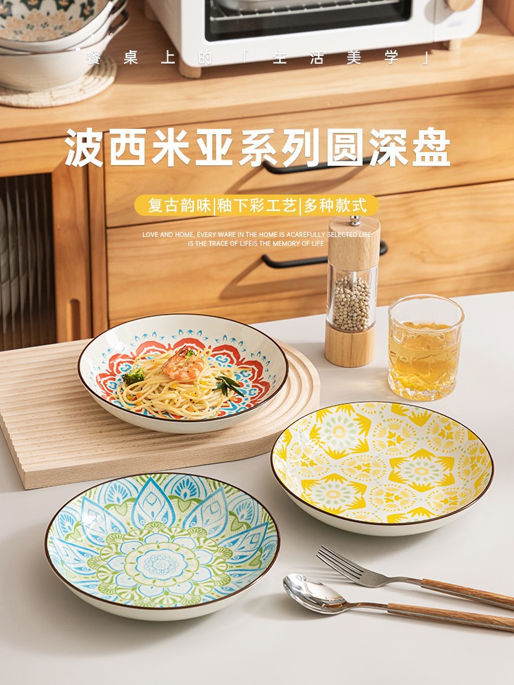 보헤미안 세라믹 깊은 수프 접시 평평한 접시 원형 접시 절임 접시 일본식 접시 수프 접시 유약 밑 색상 기계 인쇄스토어 가기