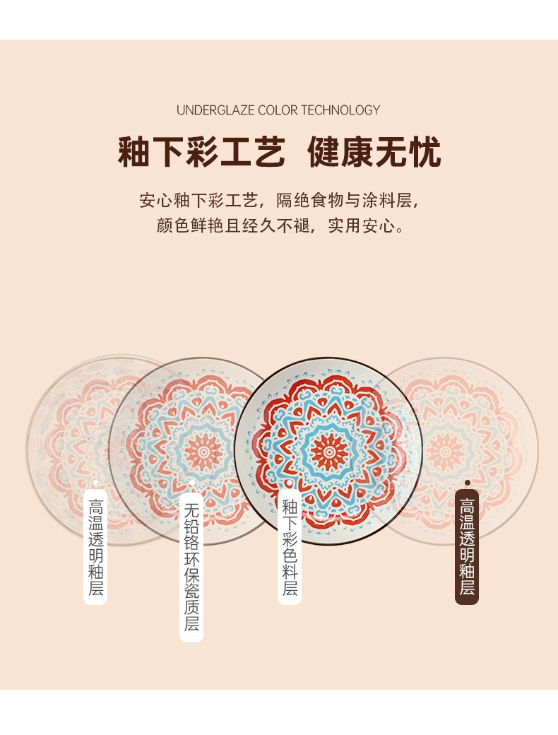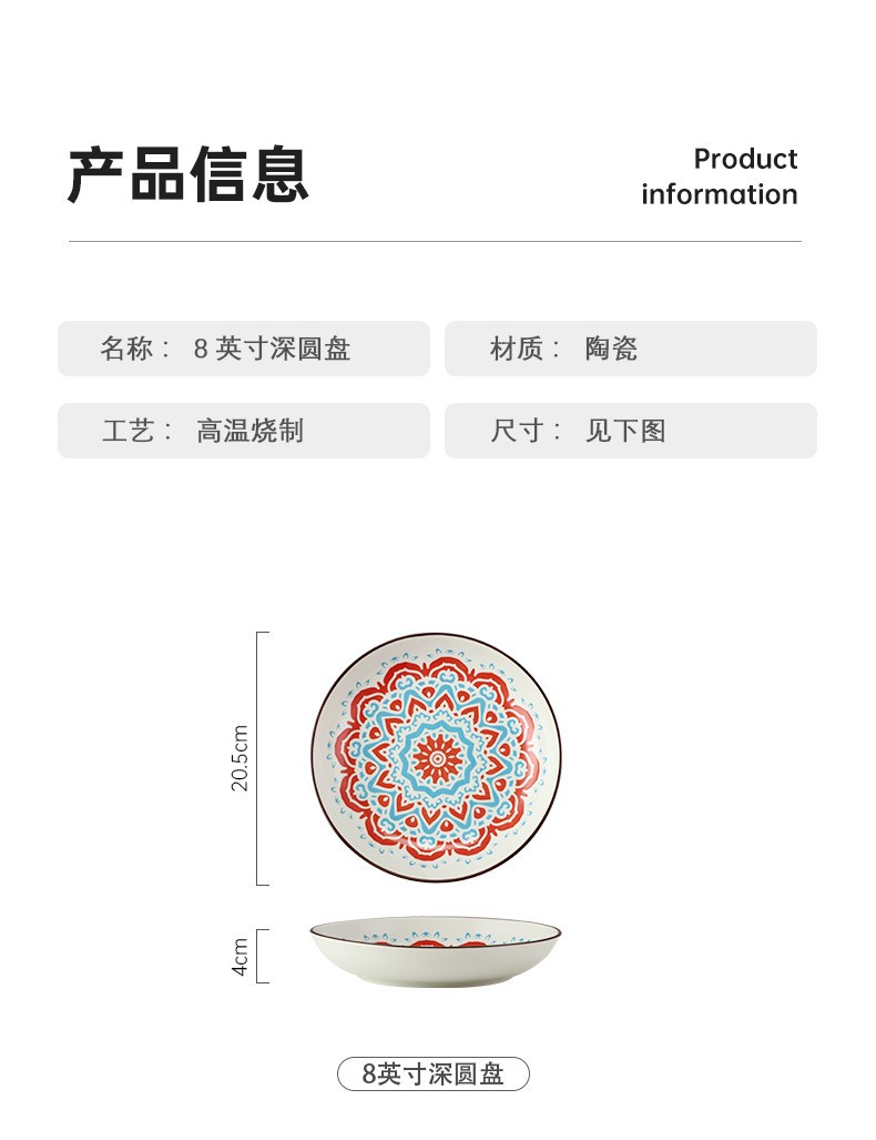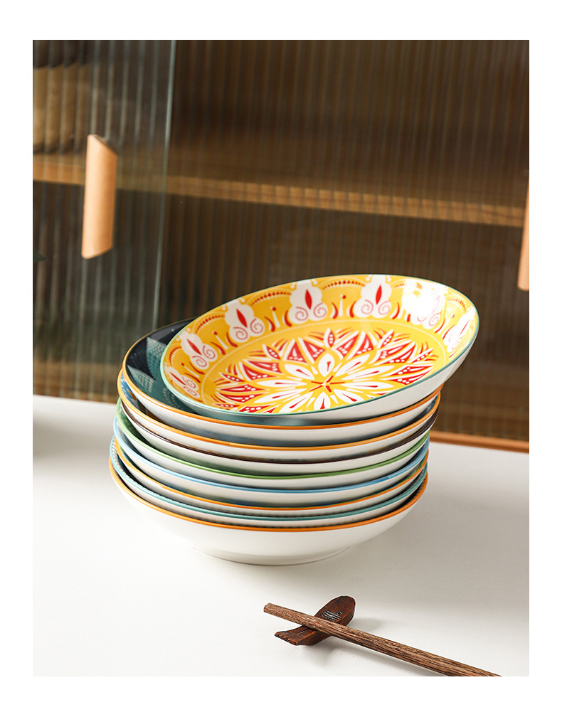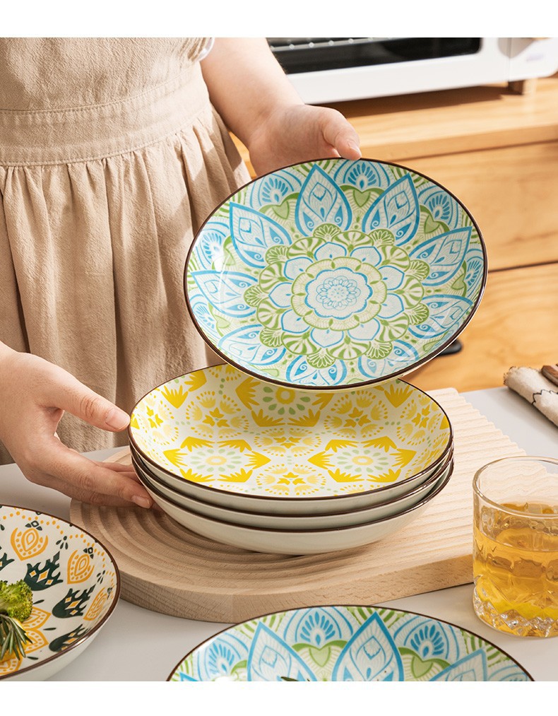 보헤미안 세라믹 깊은 수프 접시 평평한 접시 원형 접시 절임 접시 일본식 접시 수프 접시 유약 밑 색상 기계 인쇄