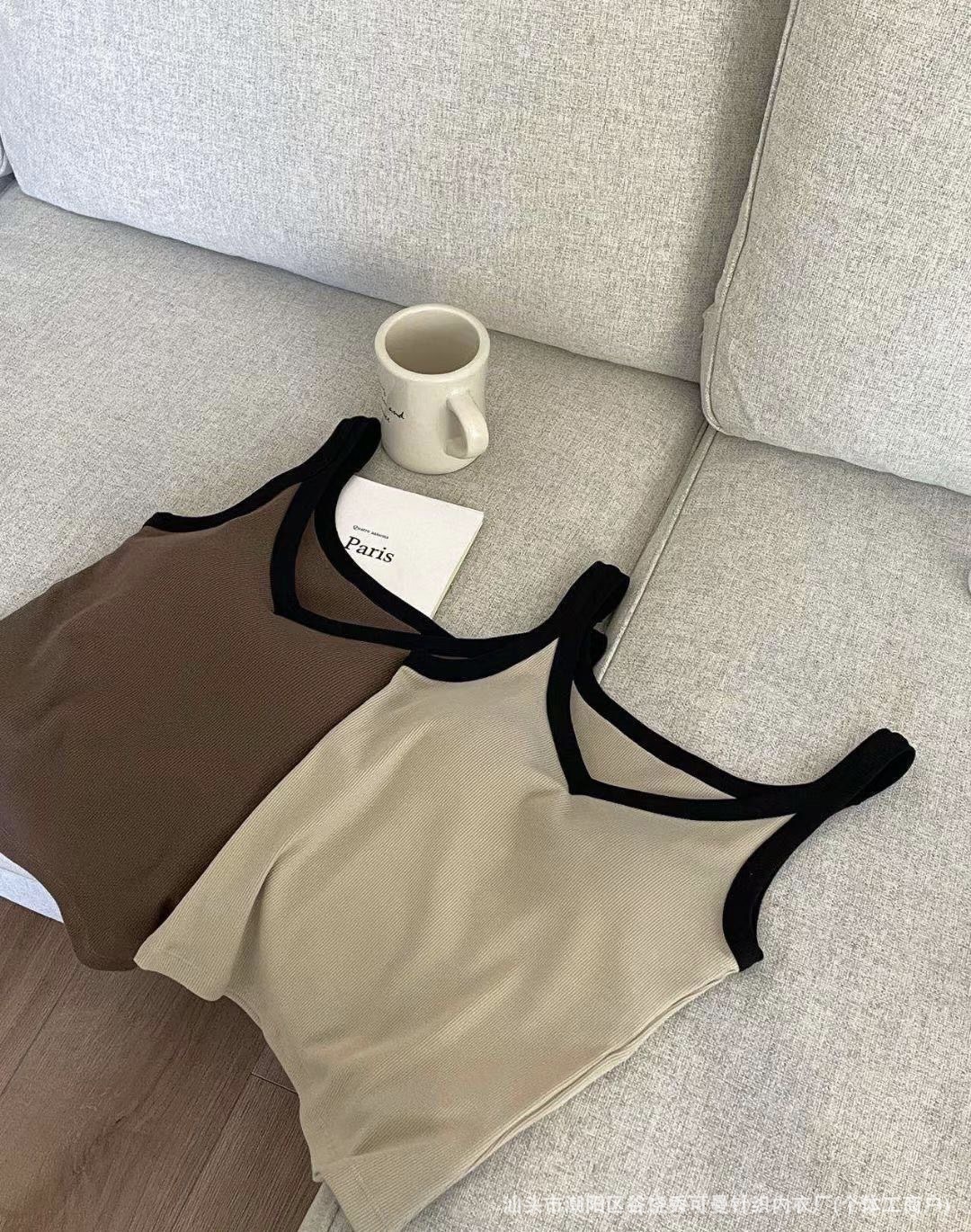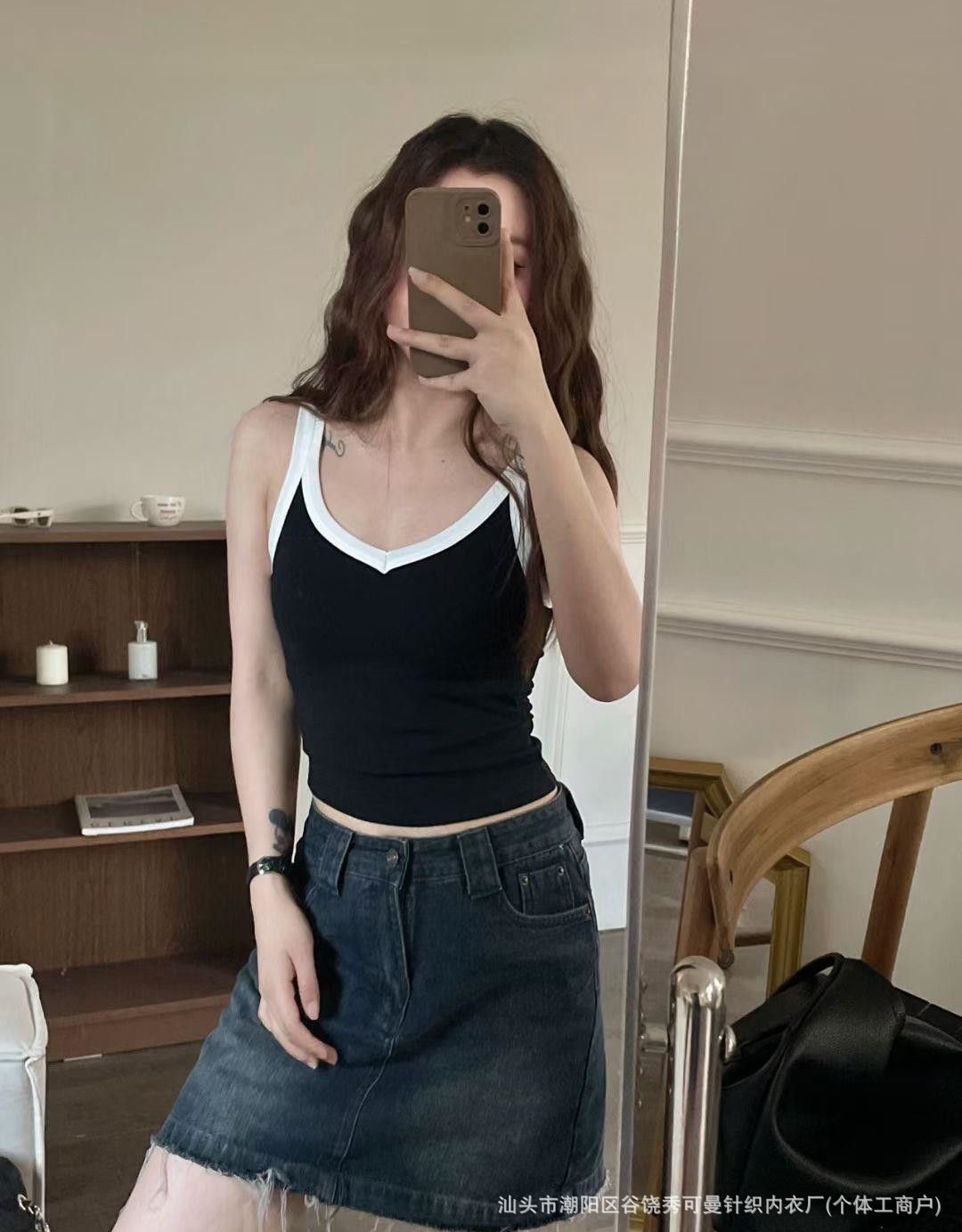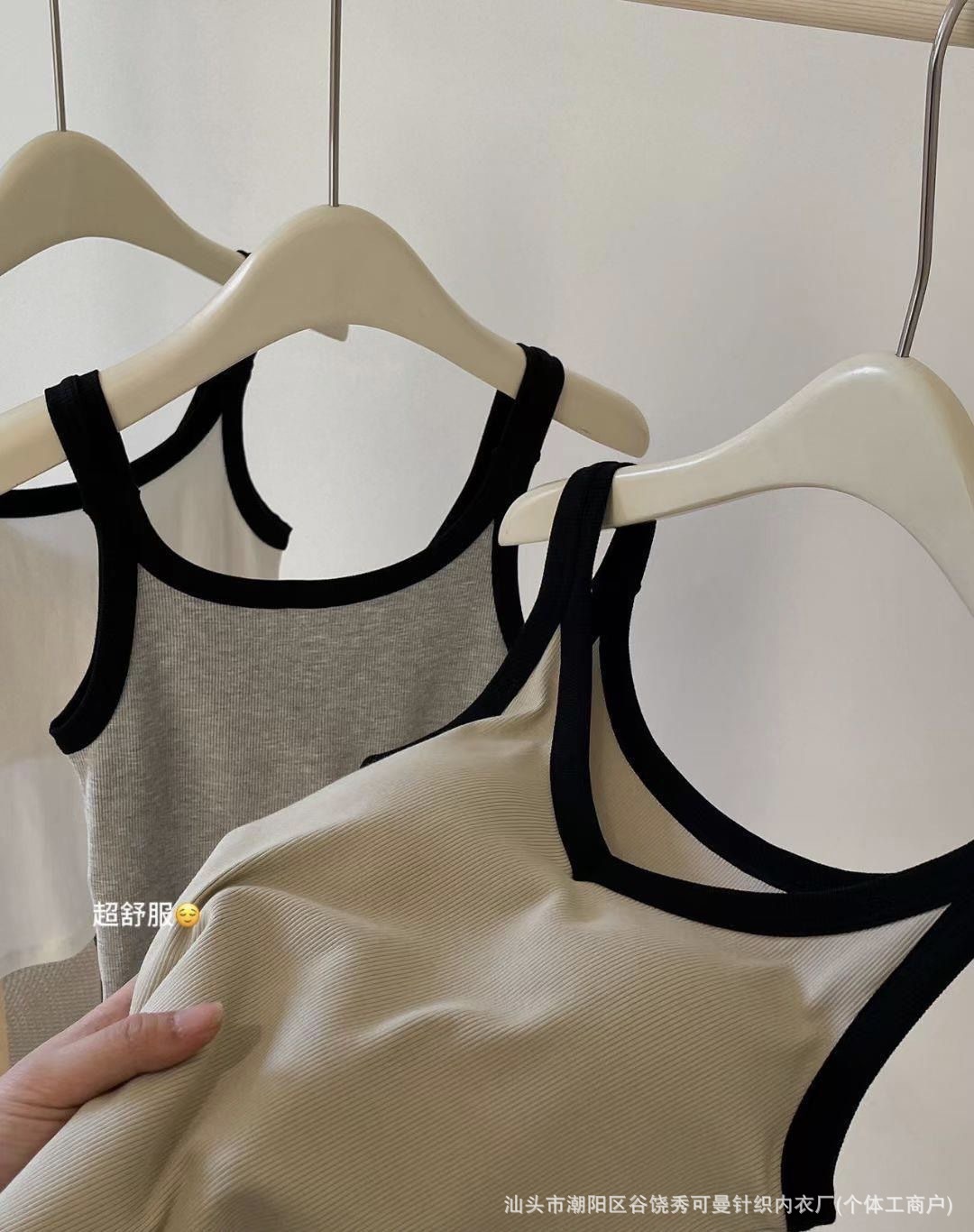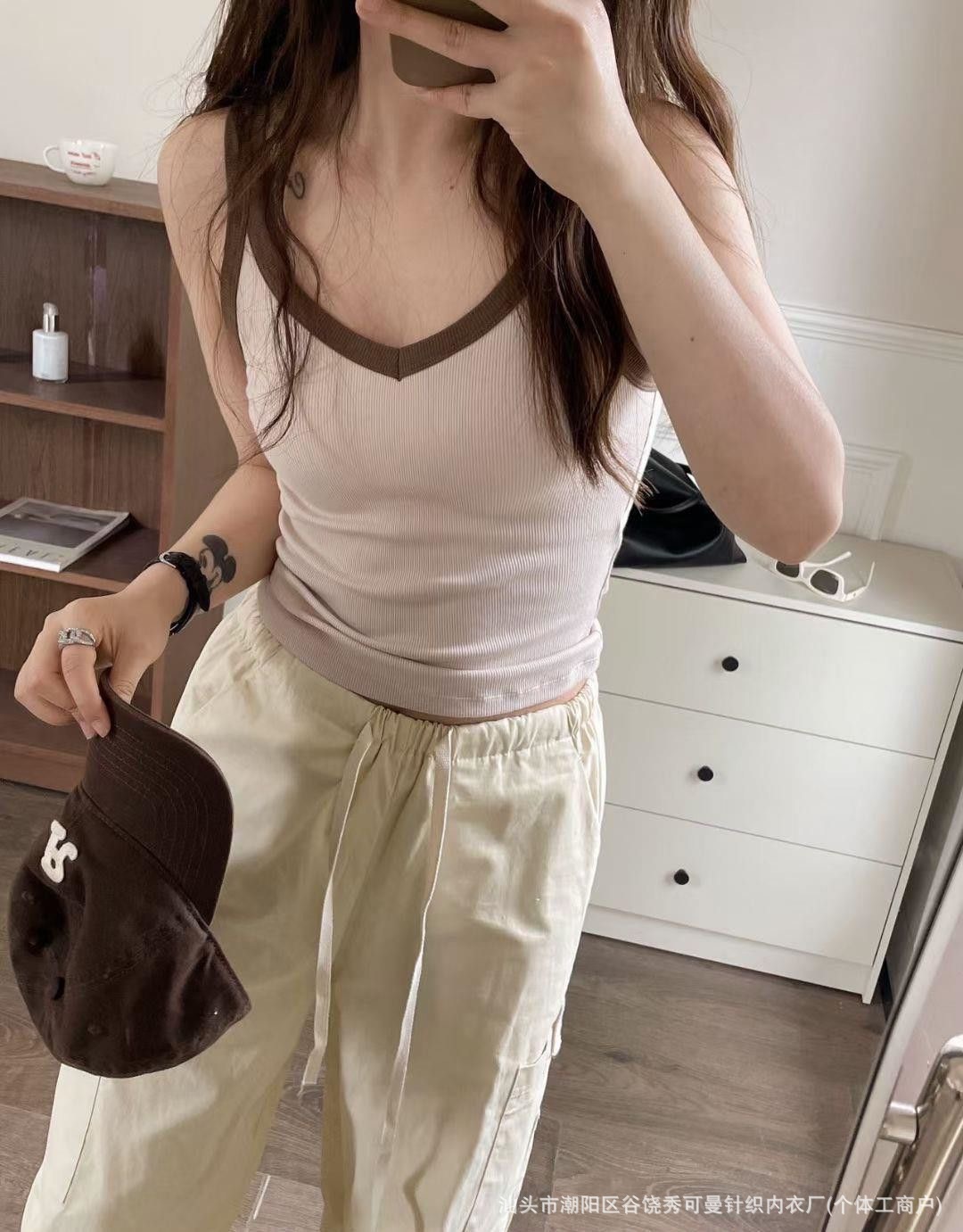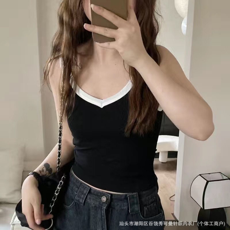 올 매치 대비 컬러 원피스 컵 소녀 캐미솔 여성용 슬림 스레드 면화 유방 커버 V 넥 바닥 탑스토어 가기