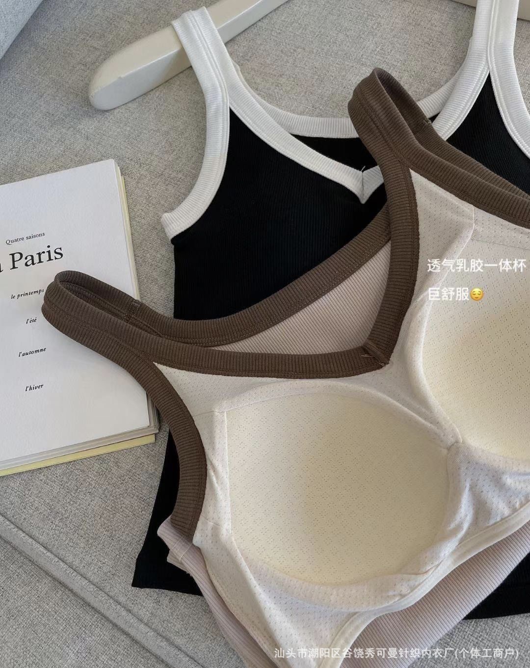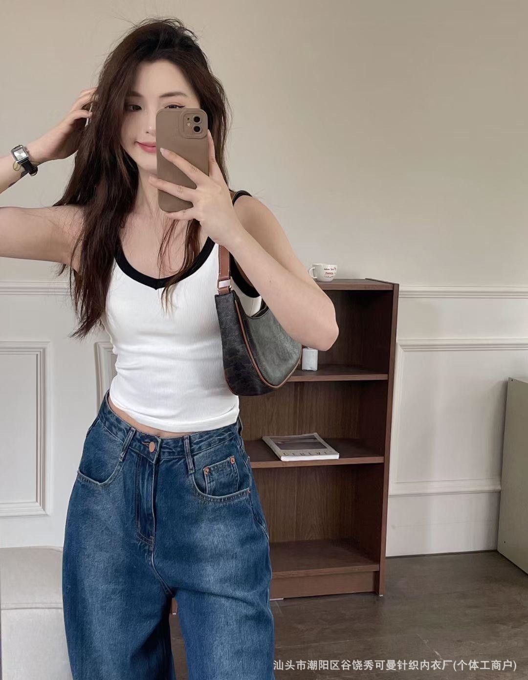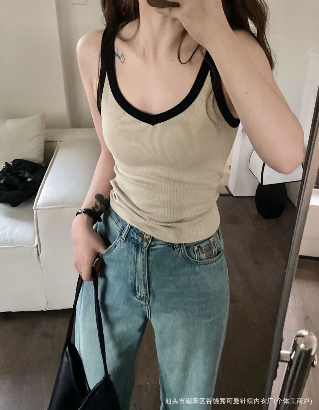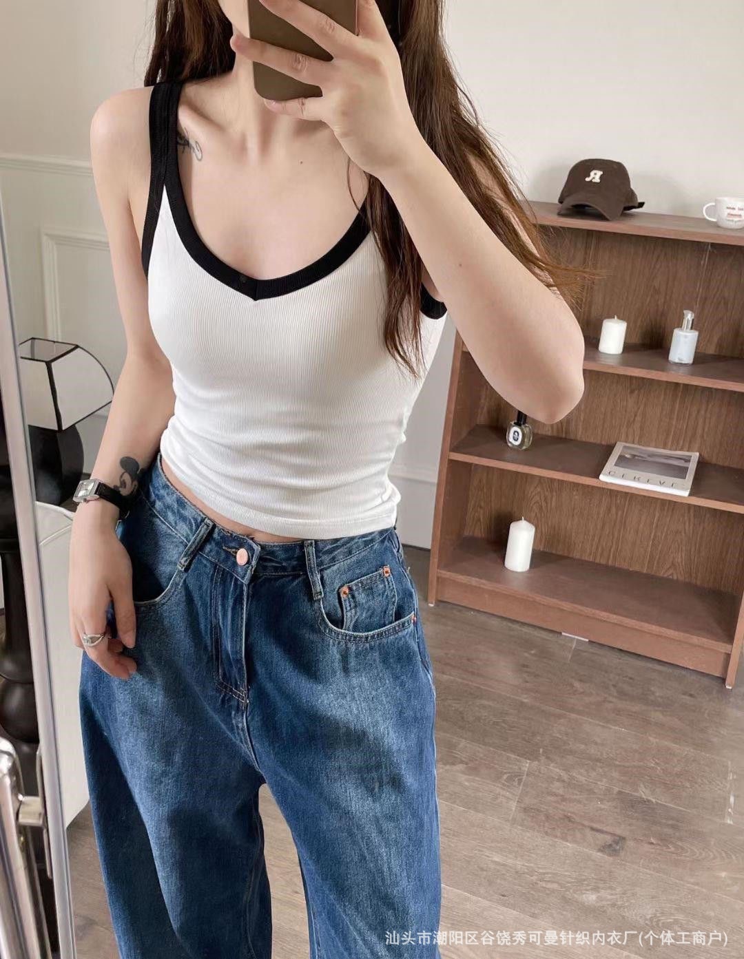 올 매치 대비 컬러 원피스 컵 소녀 캐미솔 여성용 슬림 스레드 면화 유방 커버 V 넥 바닥 탑스토어 가기