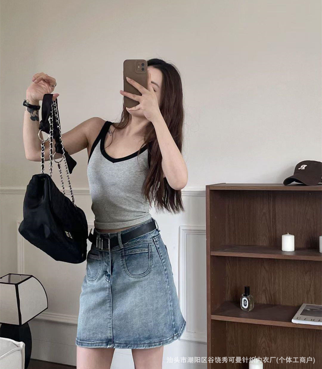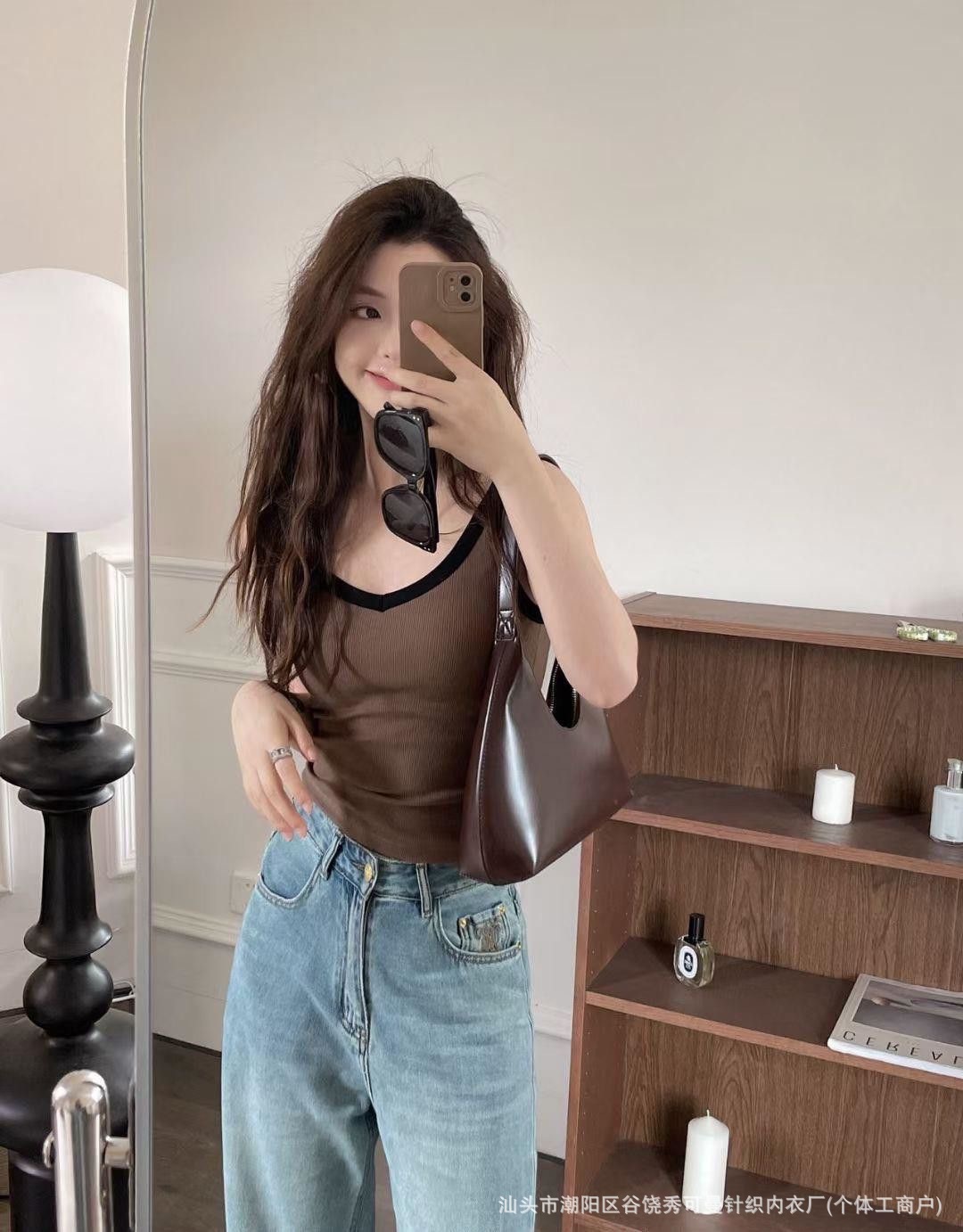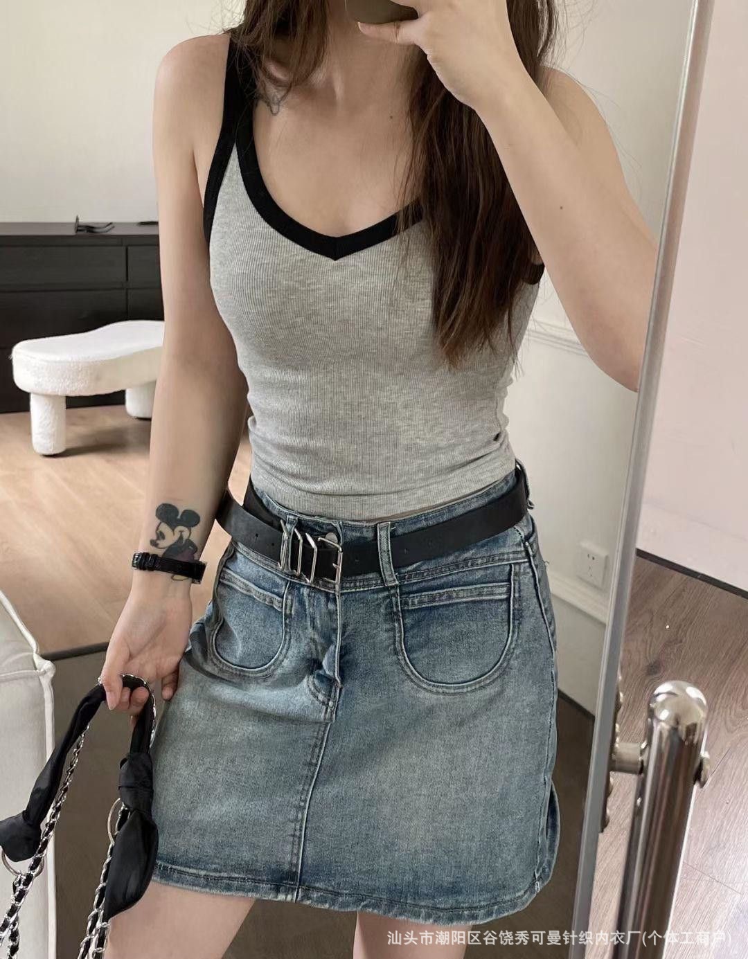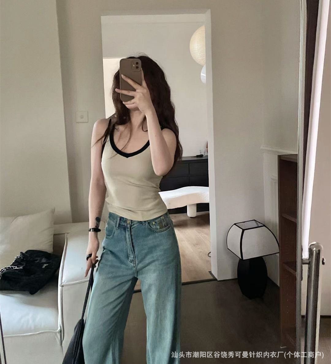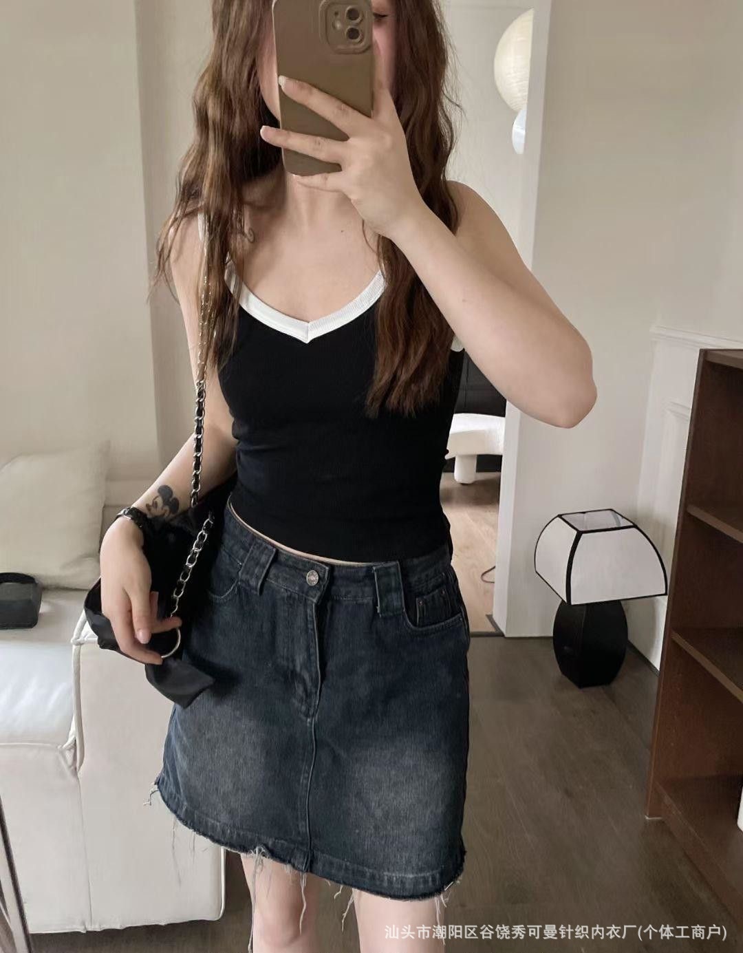 올 매치 대비 컬러 원피스 컵 소녀 캐미솔 여성용 슬림 스레드 면화 유방 커버 V 넥 바닥 탑스토어 가기