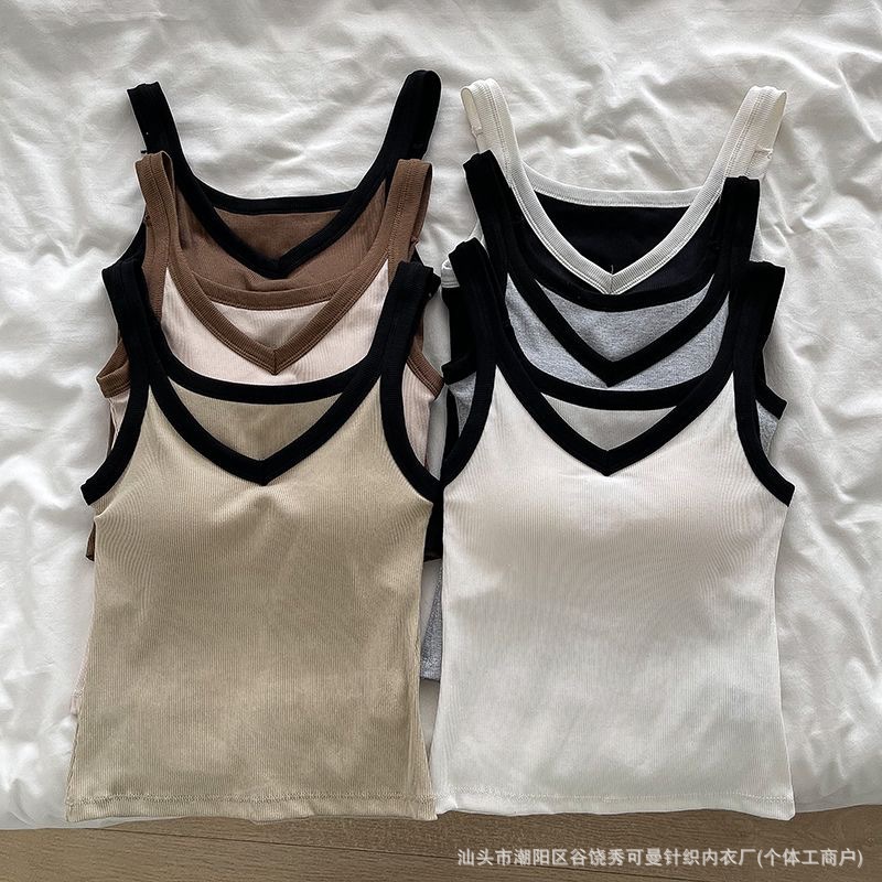 올 매치 대비 컬러 원피스 컵 소녀 캐미솔 여성용 슬림 스레드 면화 유방 커버 V 넥 바닥 탑