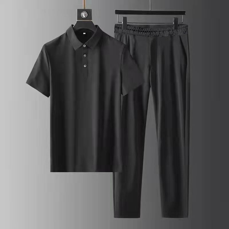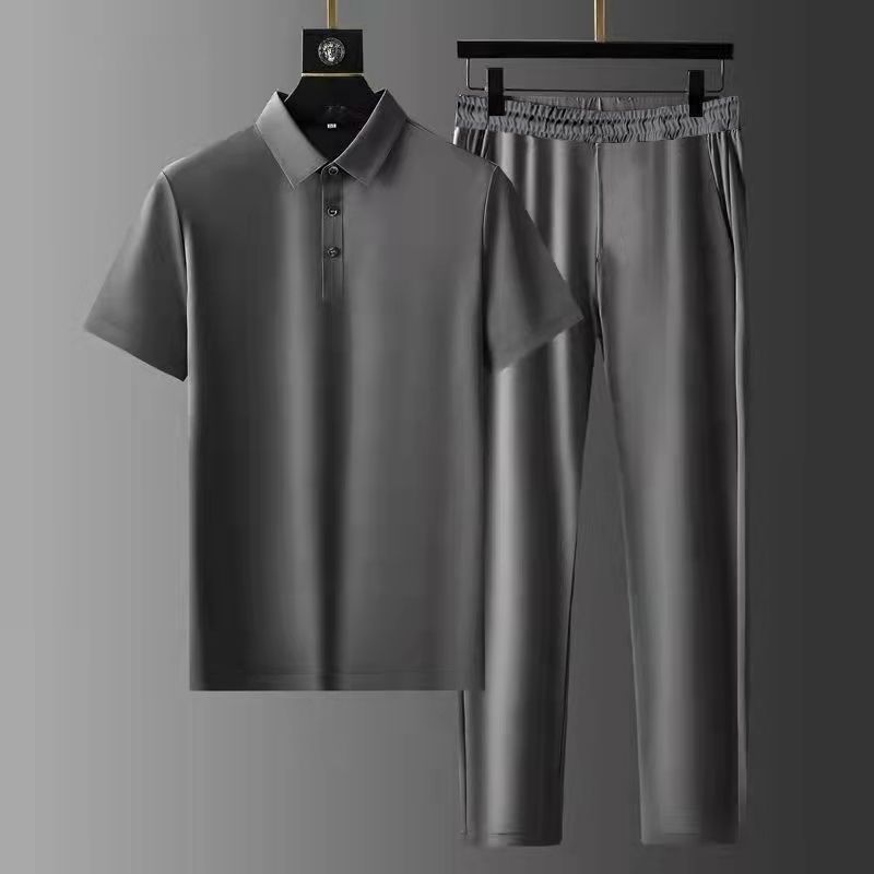 아마존 폴로 칼라 세트 탄성 초박형 빠른 건조 아이스 실크 짧은 소매 투피스 세트 고급 남성용 옷깃 세트