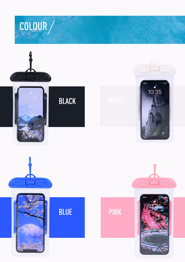 本工厂另有生产各类手机防水袋,多功能防水杂物包,相机防水套,跑步防水臂包,跑步腰包等各类防水箱包,产品可容量存放一些小贵重物品,在海边漂流游泳的时候以免弄到沙子、灰尘、水。使用环境:漂流、马尔代夫浮潜、游泳、户外野外运动、雨中、旅游防雨…适用于iphone 8 Plus、三星Note3等各大屏手机。