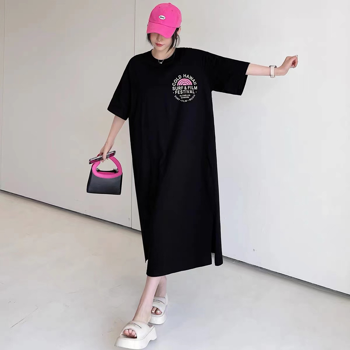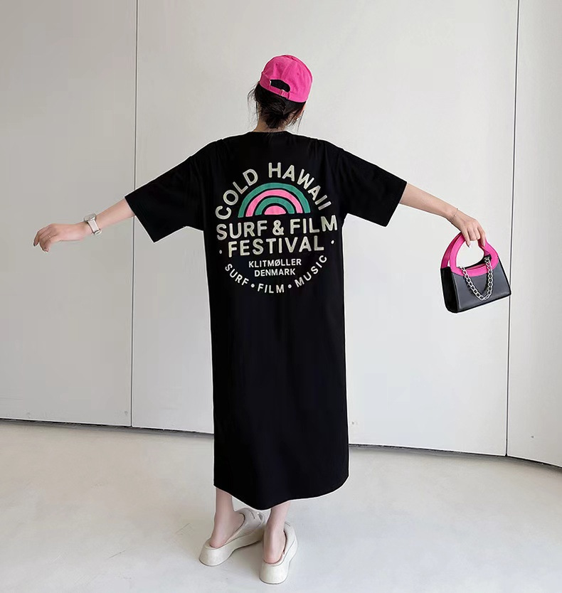 유럽 역 여름 2023 새로운 유럽 대형 반팔 티셔츠 여성용 가방 엉덩이 느슨한 중간 길이 스플릿 탑 티셔츠