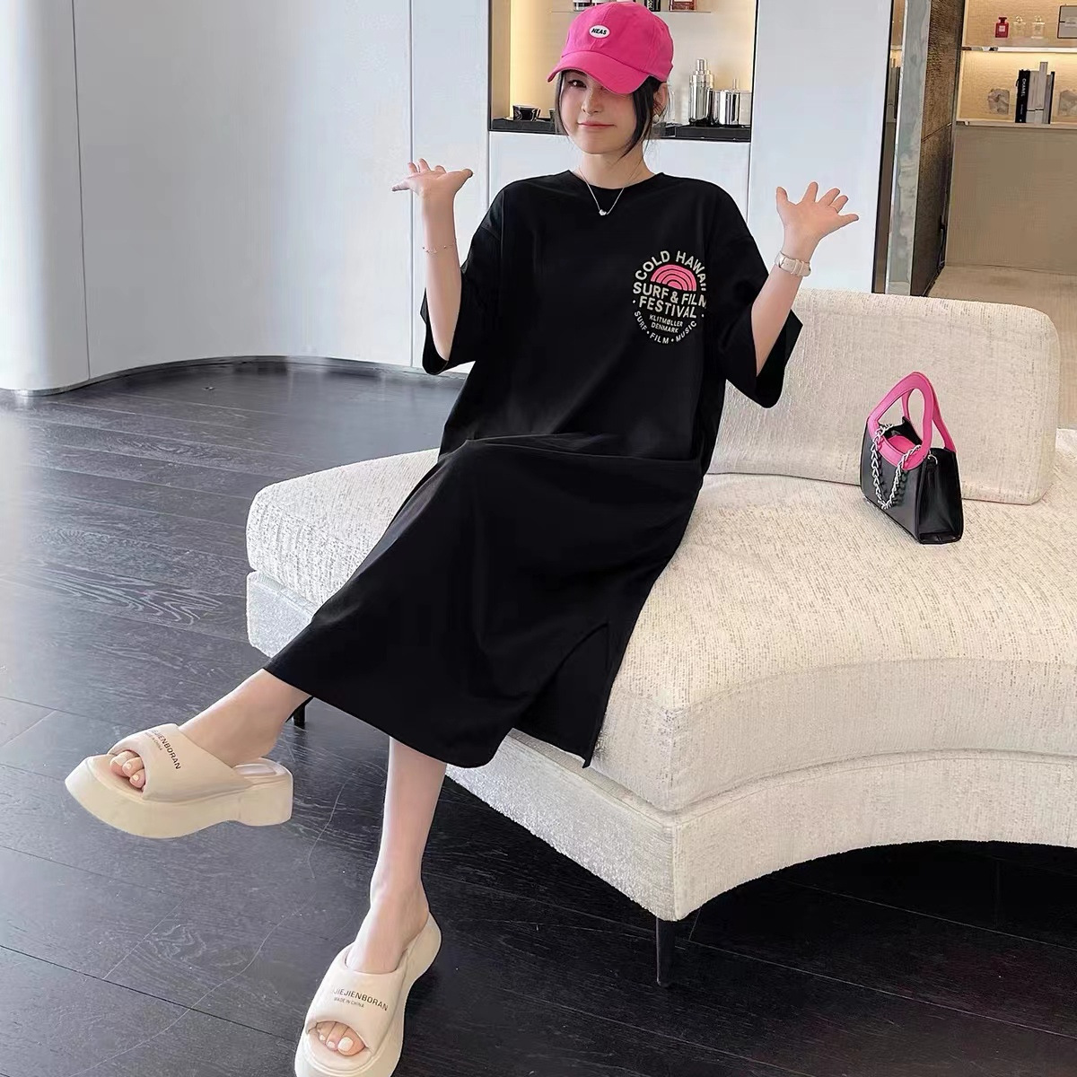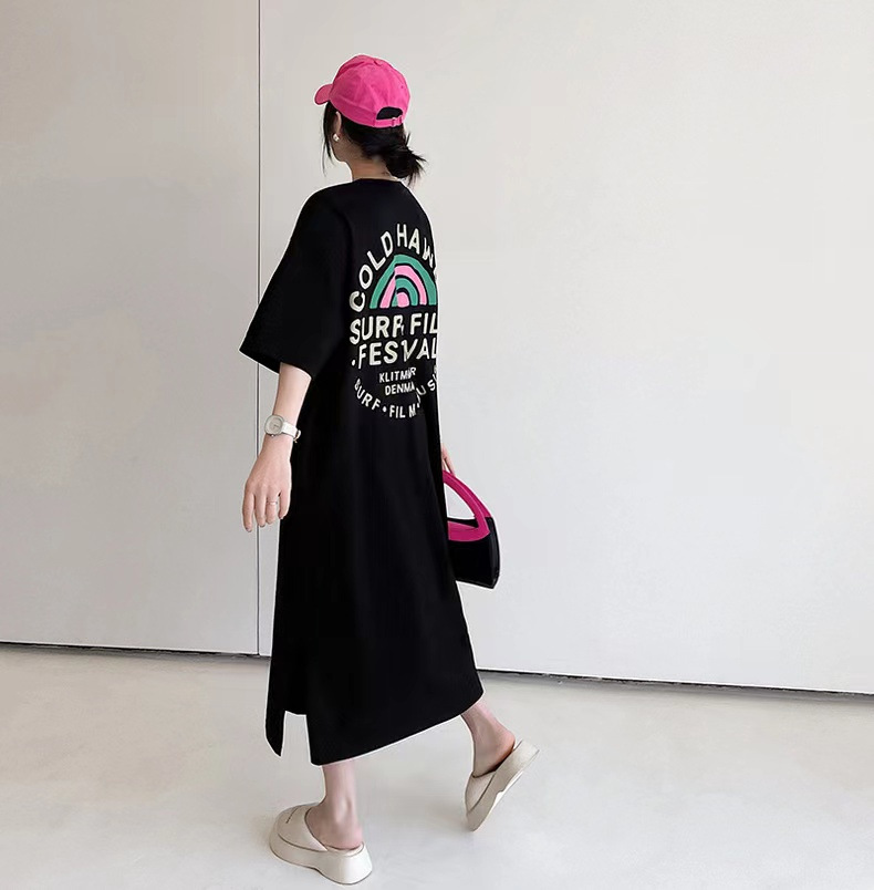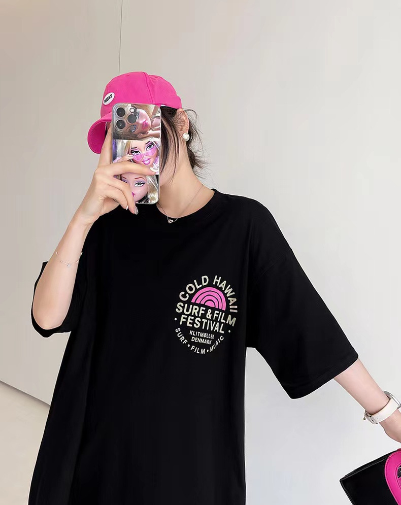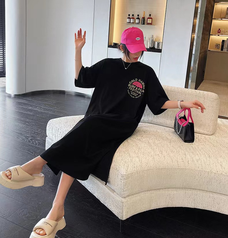 유럽 역 여름 2023 새로운 유럽 대형 반팔 티셔츠 여성용 가방 엉덩이 느슨한 중간 길이 스플릿 탑 티셔츠스토어 가기