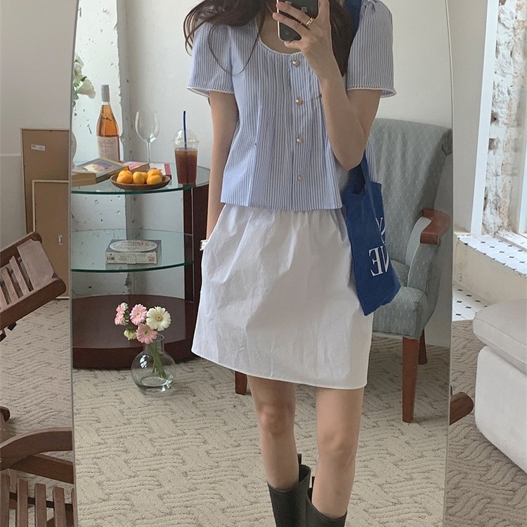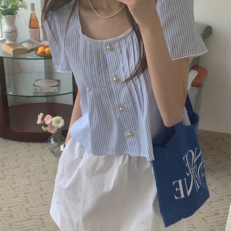 한국 스타일 부드러운 달콤한 소녀 블루 스트라이프 레이스 바느질 셔츠 새로운 틈새 간단한 여성용 셔츠스토어 가기