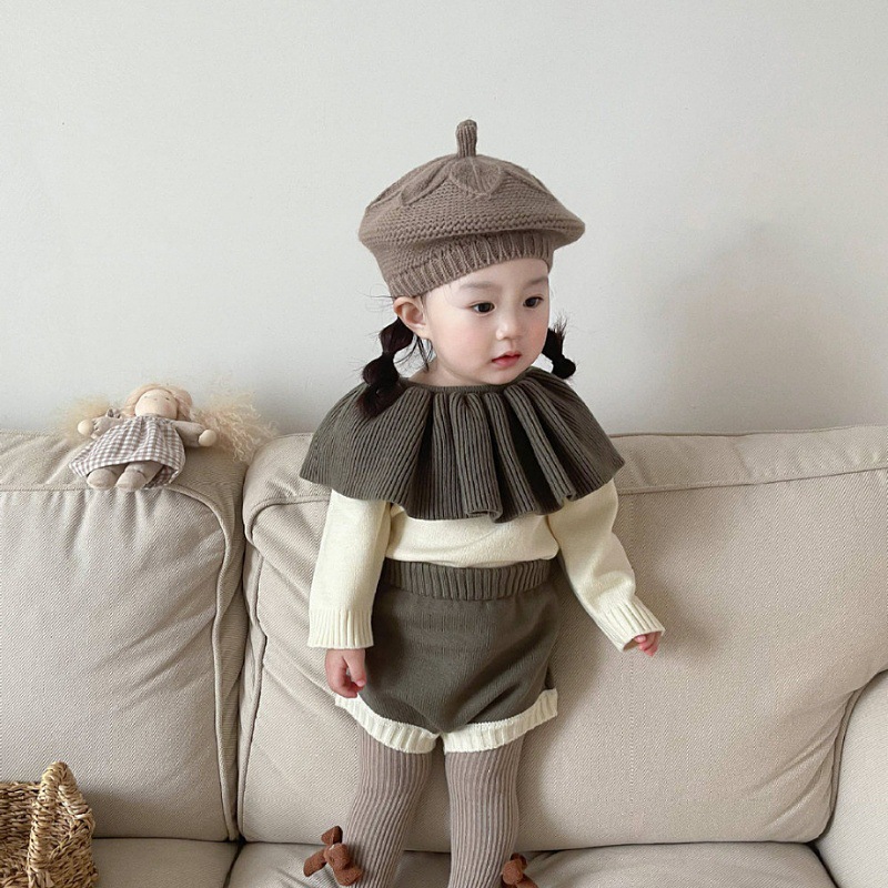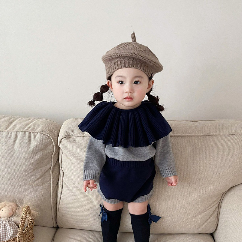 한국 아동복 소녀 봄과 가을 양모 스웨터 긴소매 주름진 칼라 풀오버 스웨터 토끼 꼬리 반바지