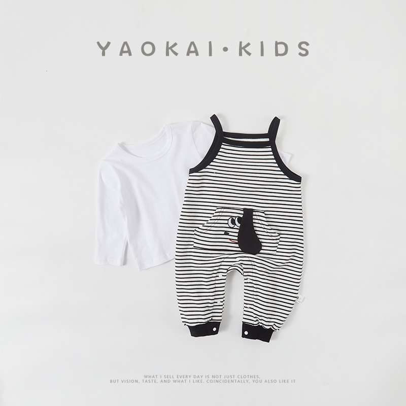 24 봄과 가을 새로운 아기 점프 수트 투피스 세트 아기 소년 바지 셔츠 스트라이프 서스펜더 바지 세트