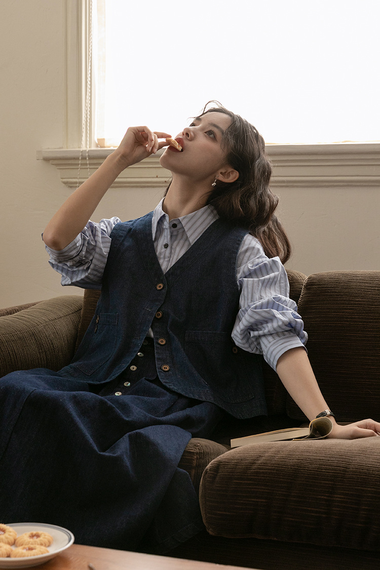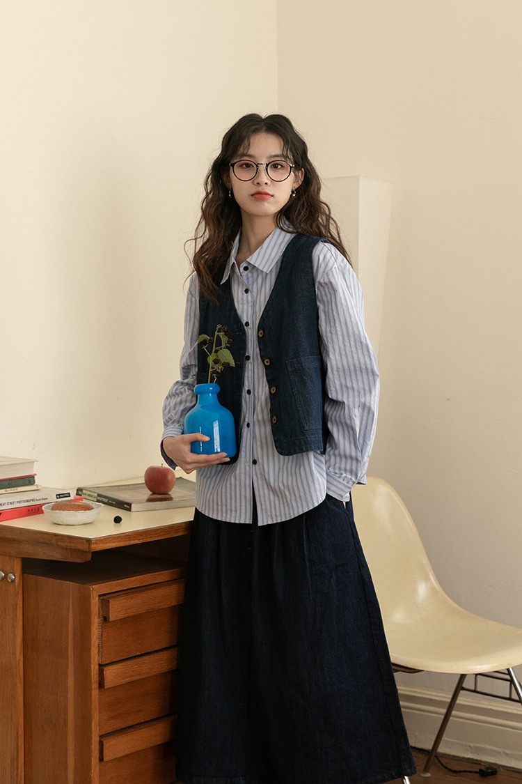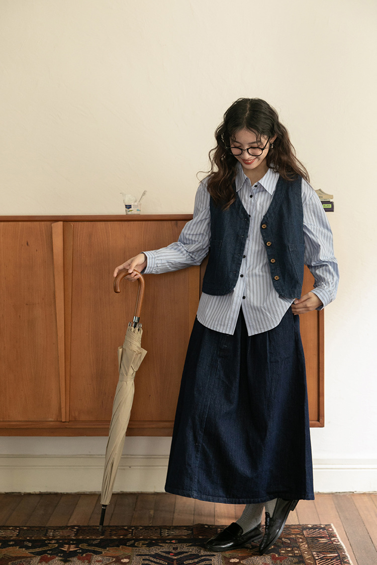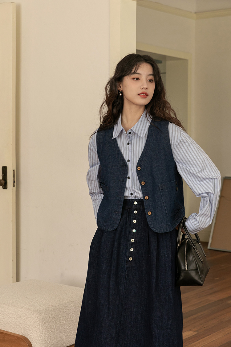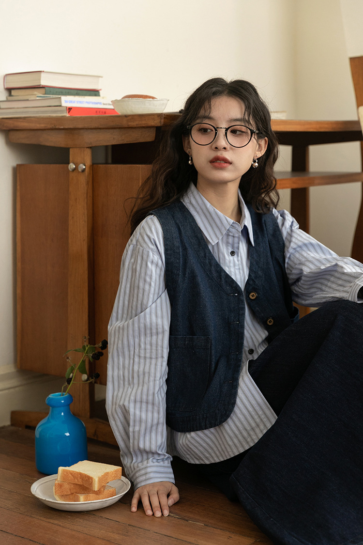 2025년 가을 레트로 일본 문학적 스타일의 심플하고 다재다능한 여성 데님 조끼, 레이어드 조끼 탑의 실제 사진