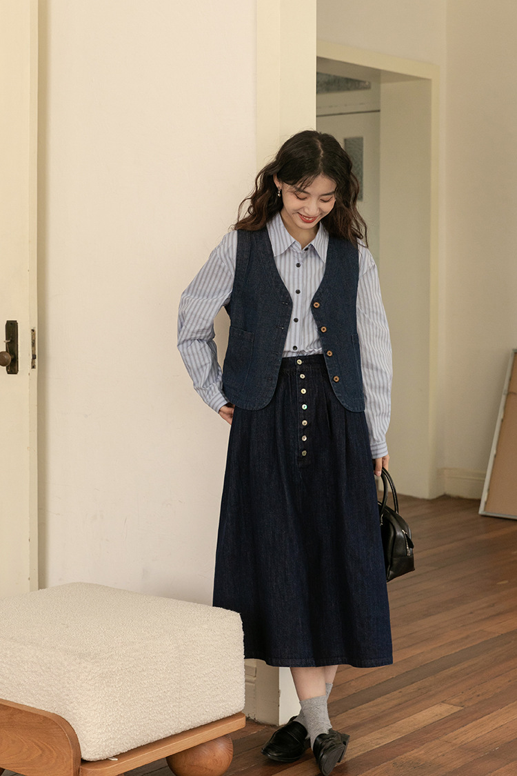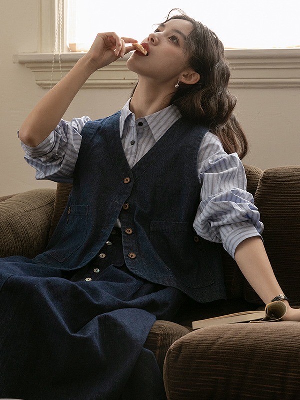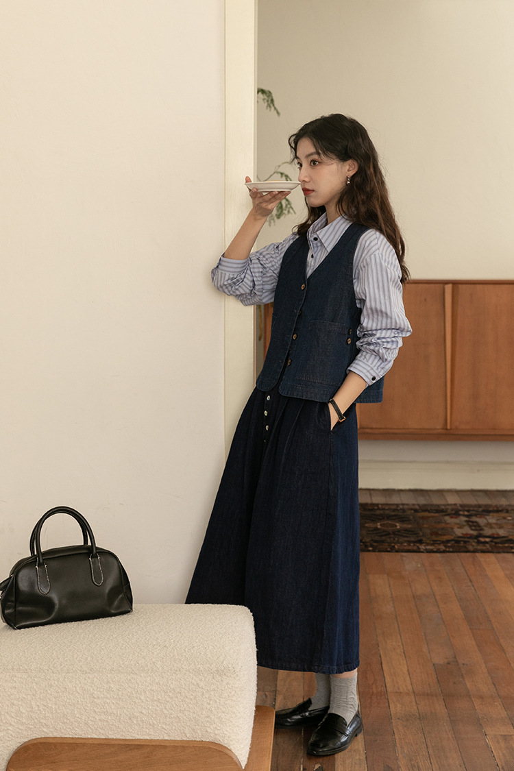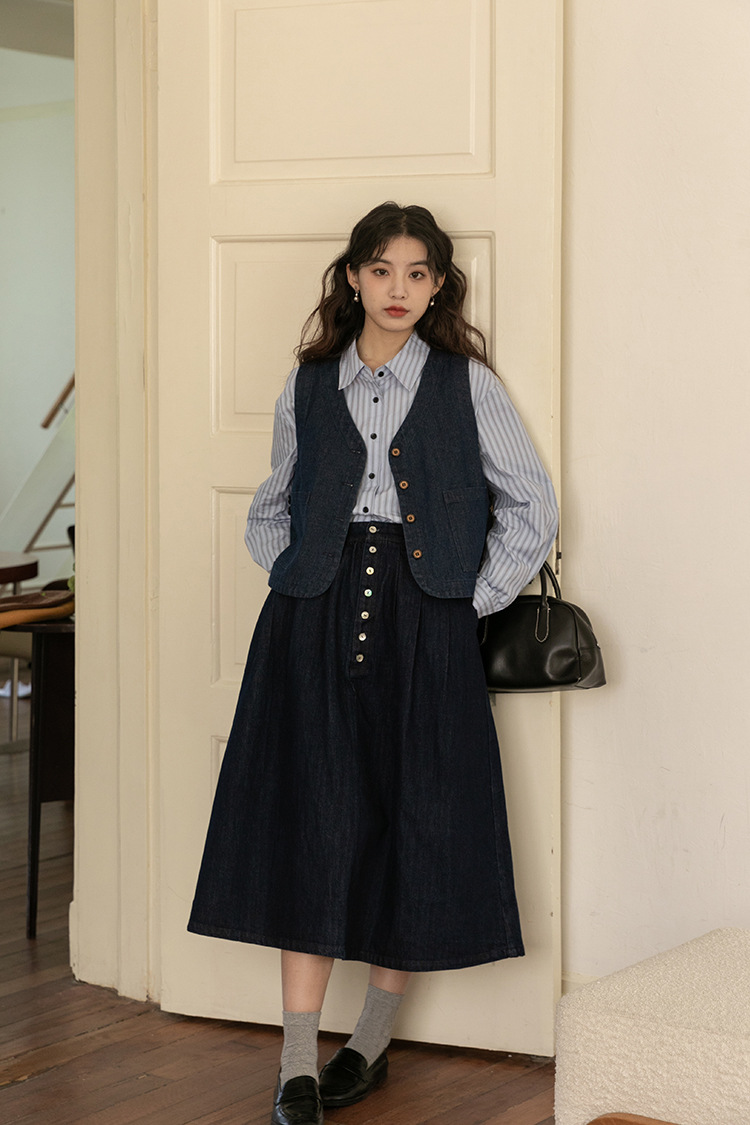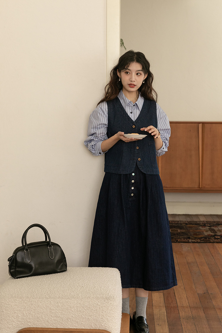2025년 가을 레트로 일본 문학적 스타일의 심플하고 다재다능한 여성 데님 조끼, 레이어드 조끼 탑의 실제 사진