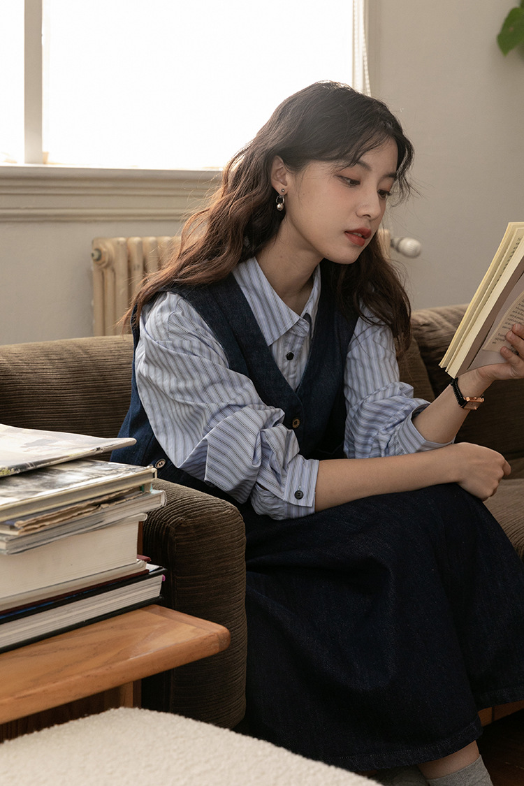 2025년 가을 레트로 일본 문학적 스타일의 심플하고 다재다능한 여성 데님 조끼, 레이어드 조끼 탑의 실제 사진스토어 가기
