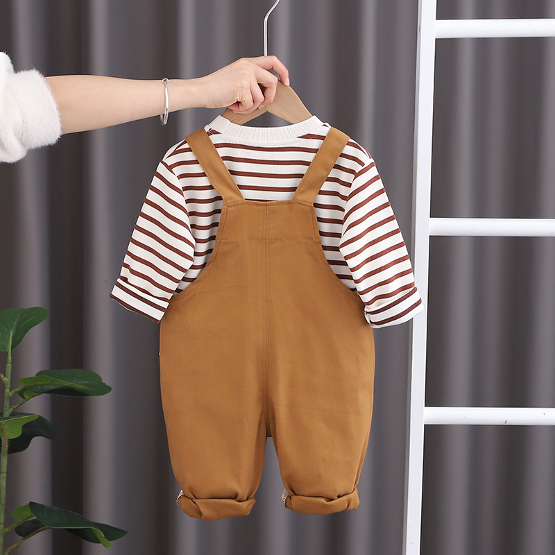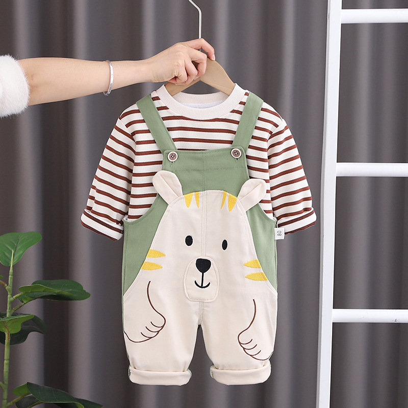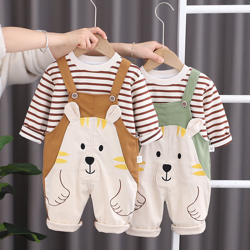 남자들의 봄 옷 투피스 세트 서양식 어린이 줄무늬 스웨터 컬러 매칭 곰 서스펜더 바지 공장 도매 패션 패션