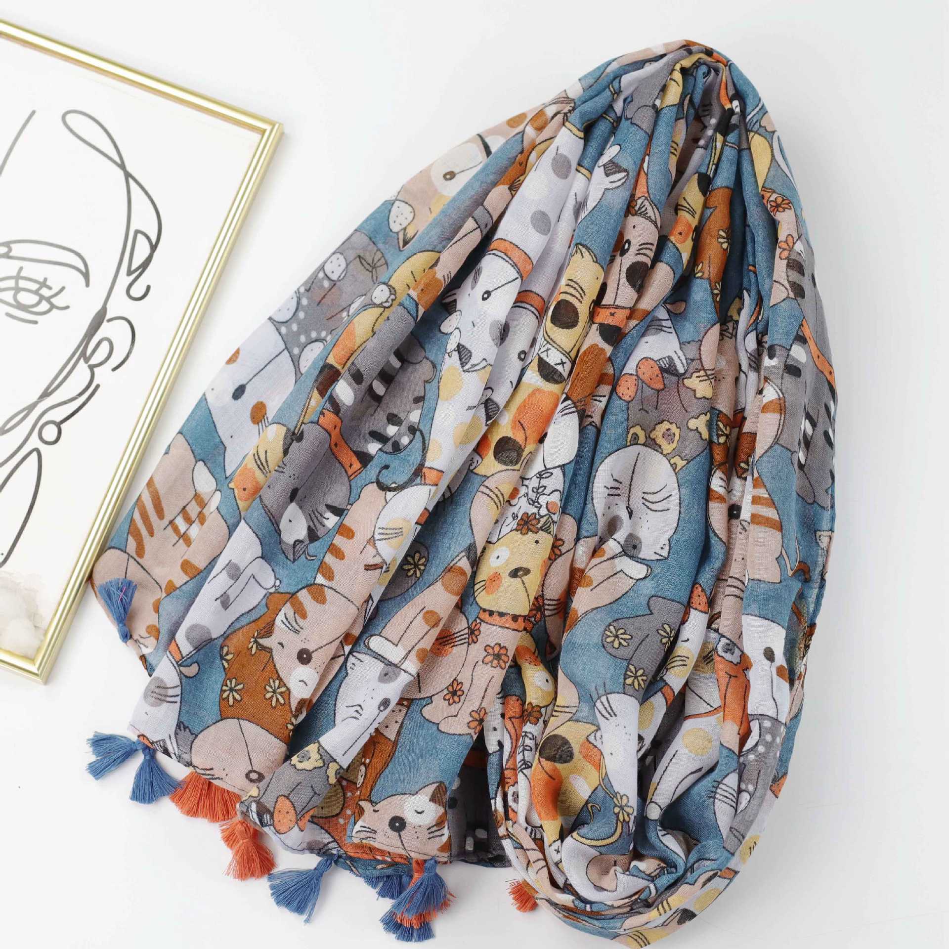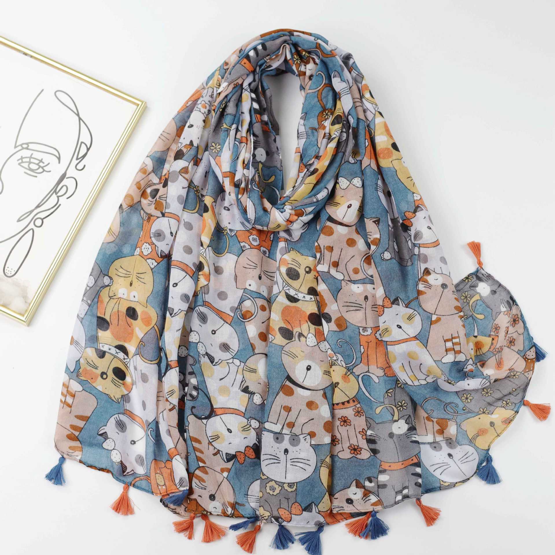 공장 판매 대외 무역 국경 만화 큰 얼굴 고양이 인쇄 실크 스카프 암호화 된 발리 원사 여성의 긴 스카프 봄과 여름 스카프 목도리