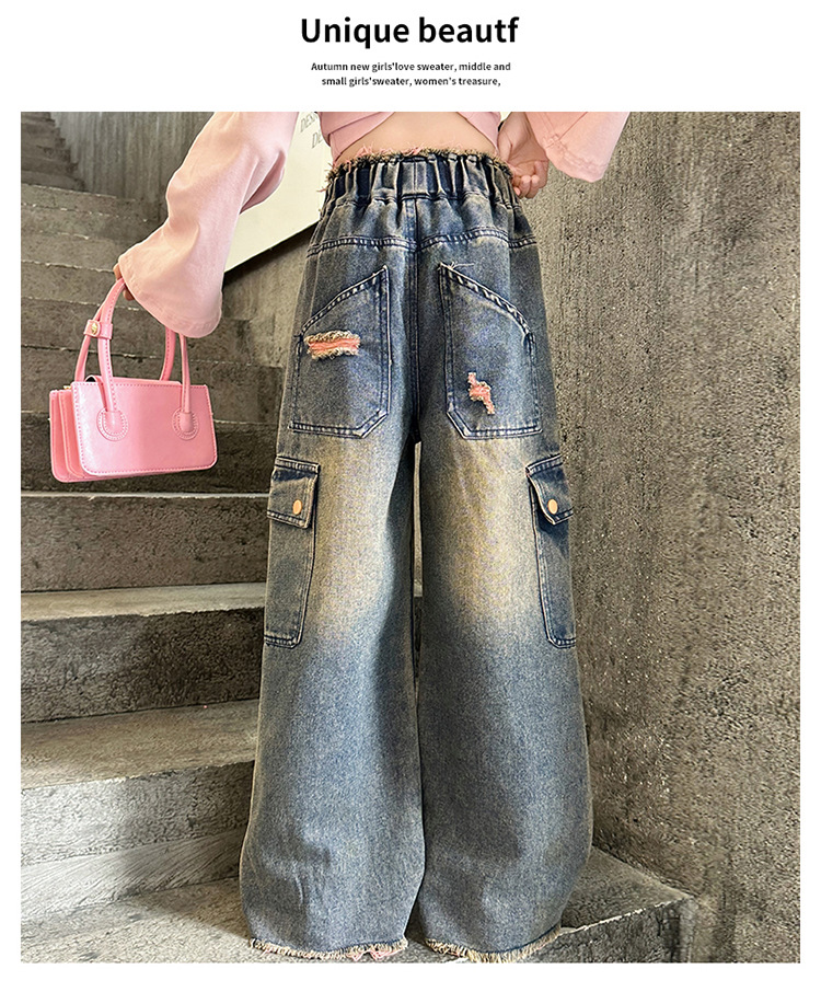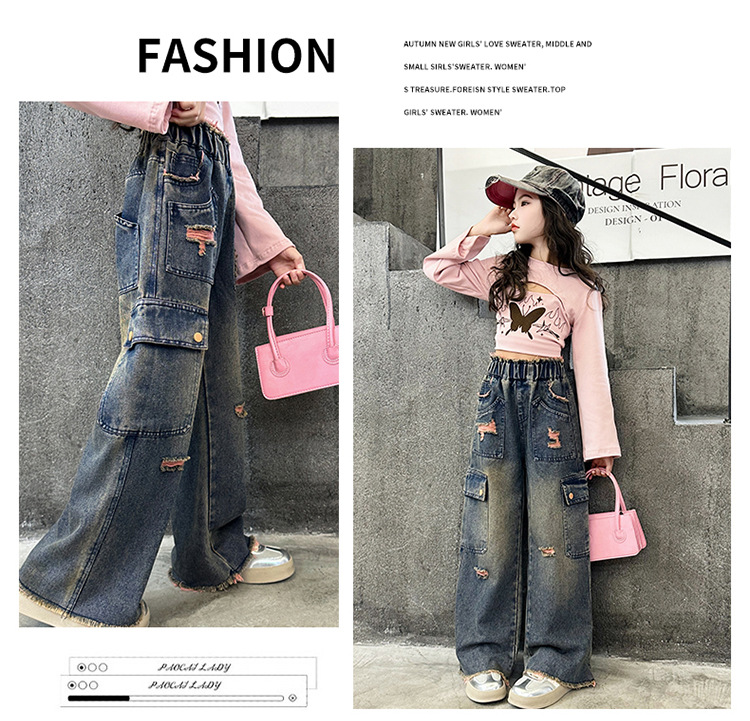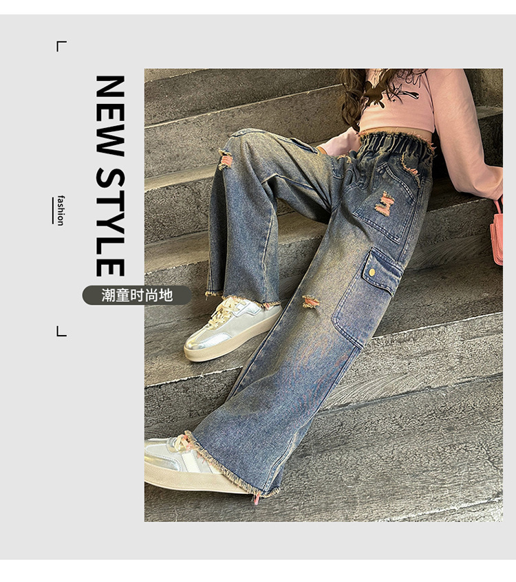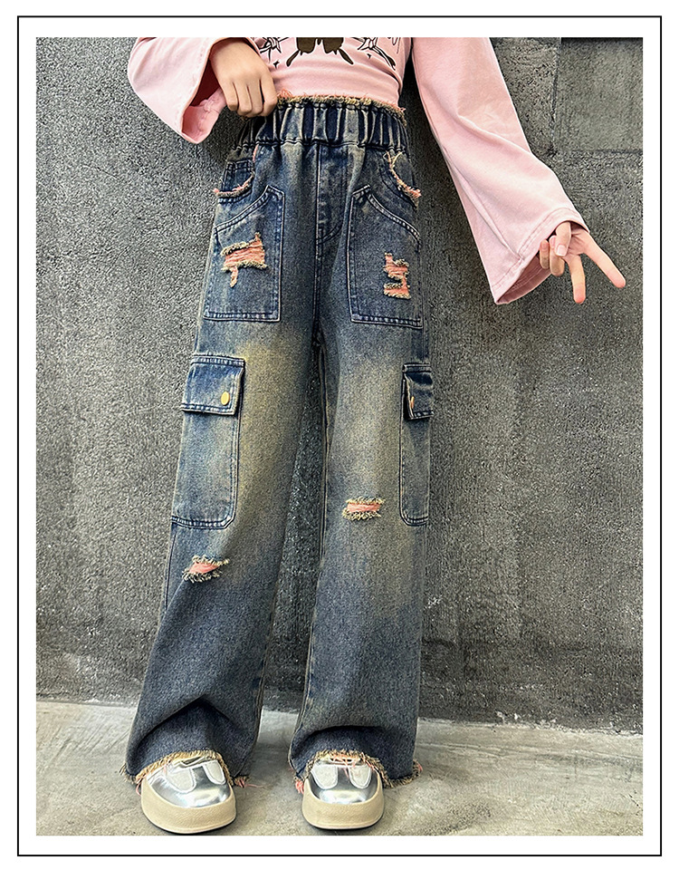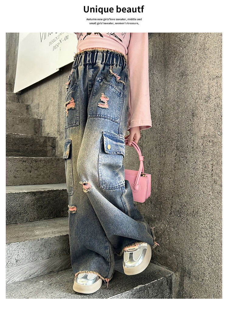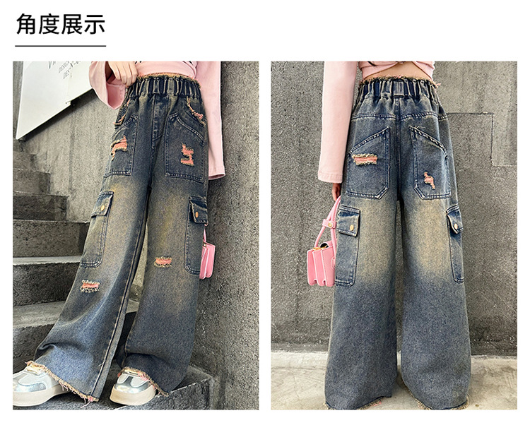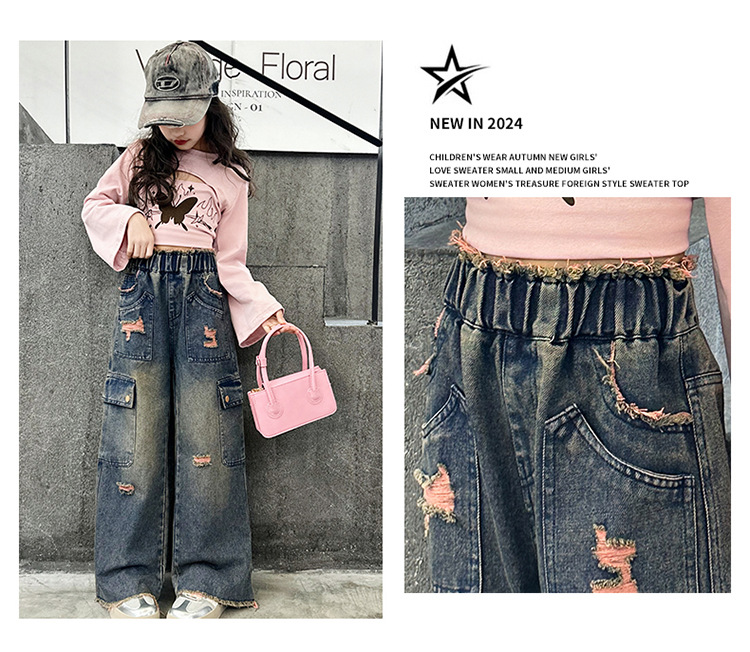 소녀 찢어진 청바지 봄 2024 새로운 어린이 소녀 봄과 가을 느슨한 넓은 다리 바지 바지 바지 바지 바지스토어 가기
