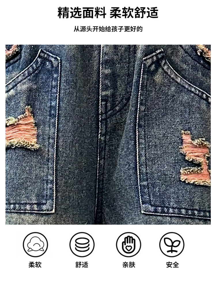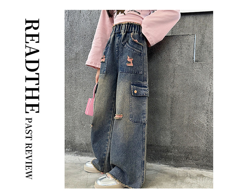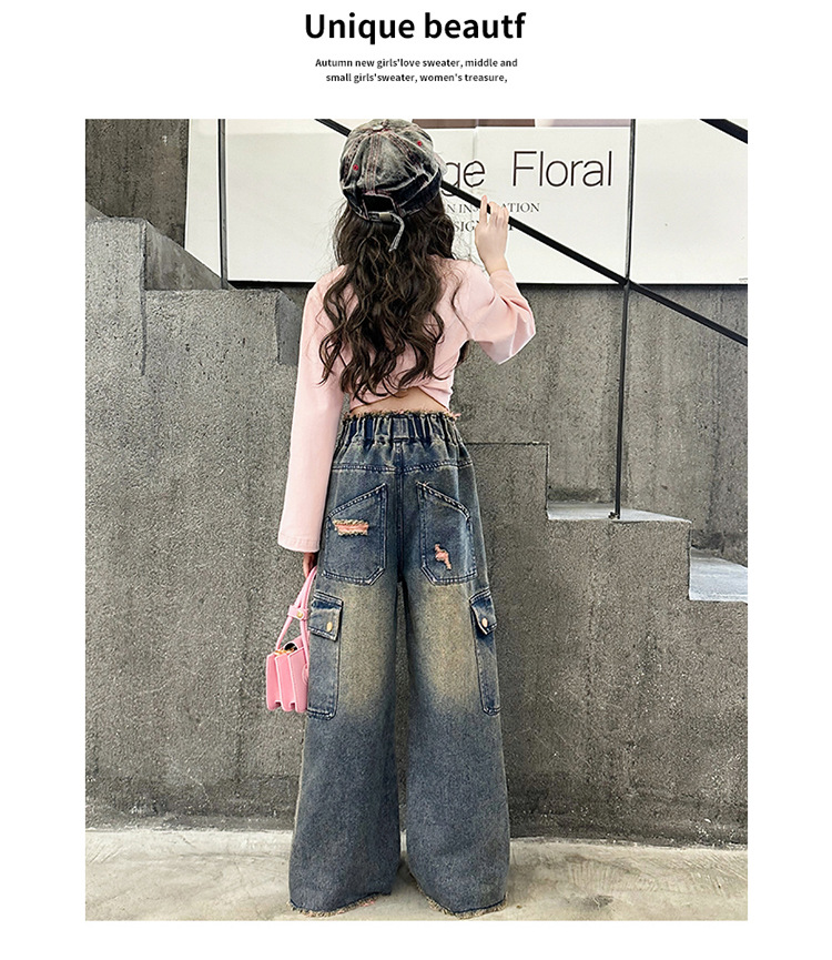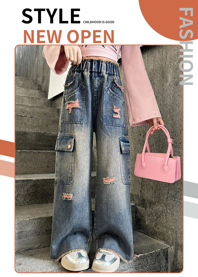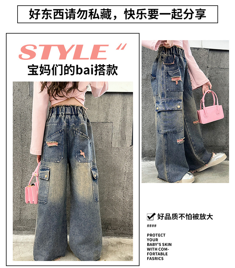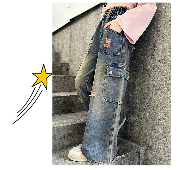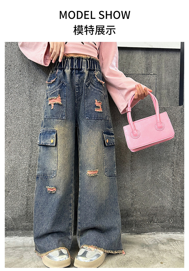 소녀 찢어진 청바지 봄 2024 새로운 어린이 소녀 봄과 가을 느슨한 넓은 다리 바지 바지 바지 바지 바지스토어 가기