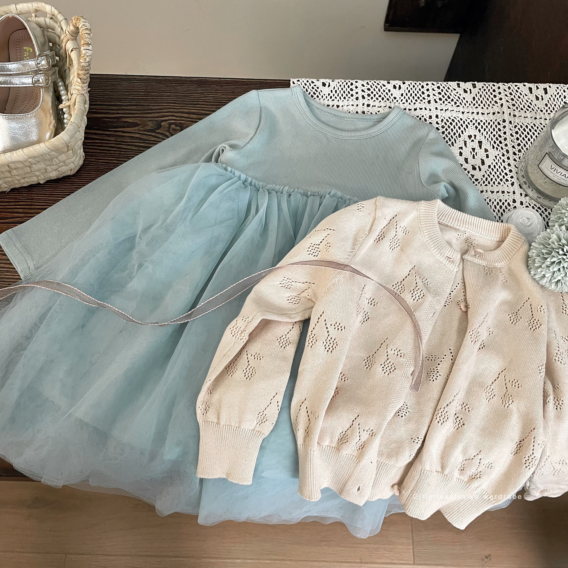 한국식 아동복 2024 새 봄 소녀 긴팔 원피스 어린이 서양 공주 페티스커트 메쉬 스커트
