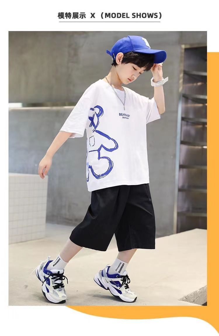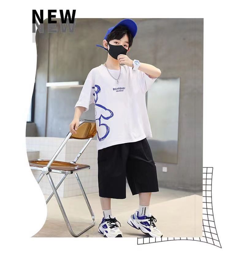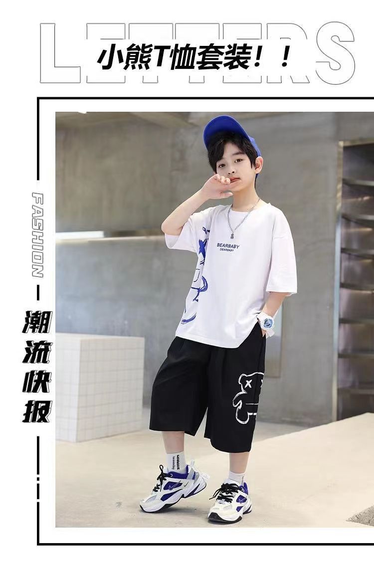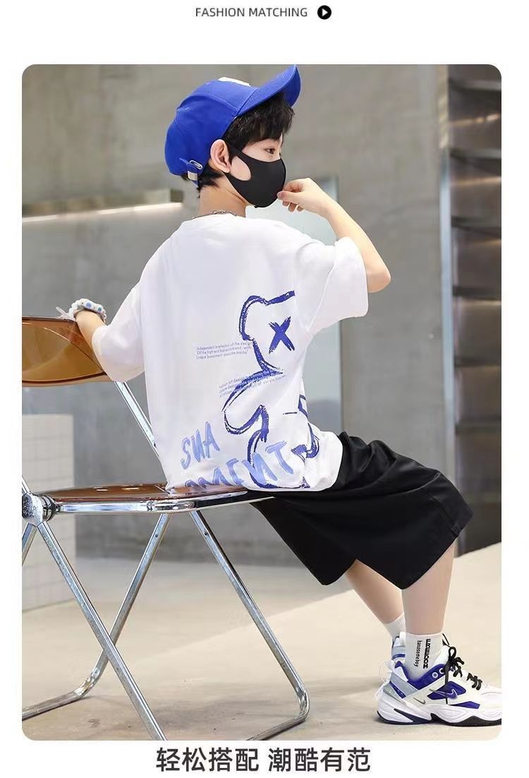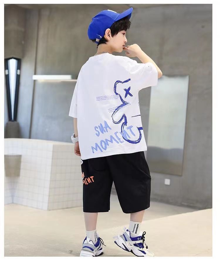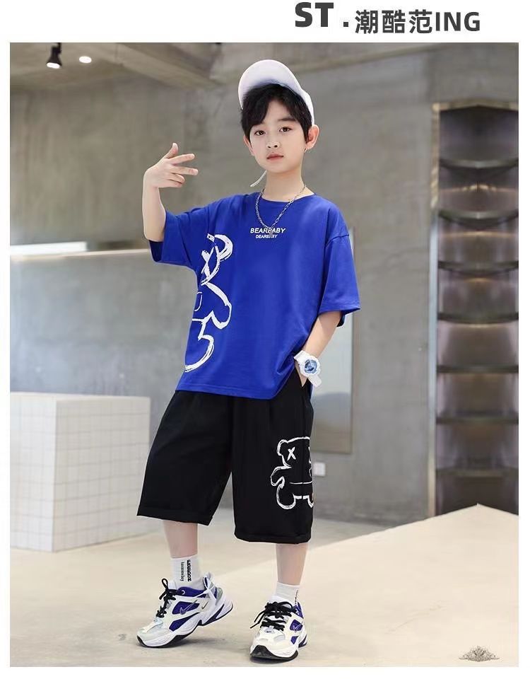 24 봄 새로운 어린이 반팔 반바지 세트 큰 소년의 만화 인쇄 라운드 넥 스포츠 캐주얼 투피스 세트스토어 가기