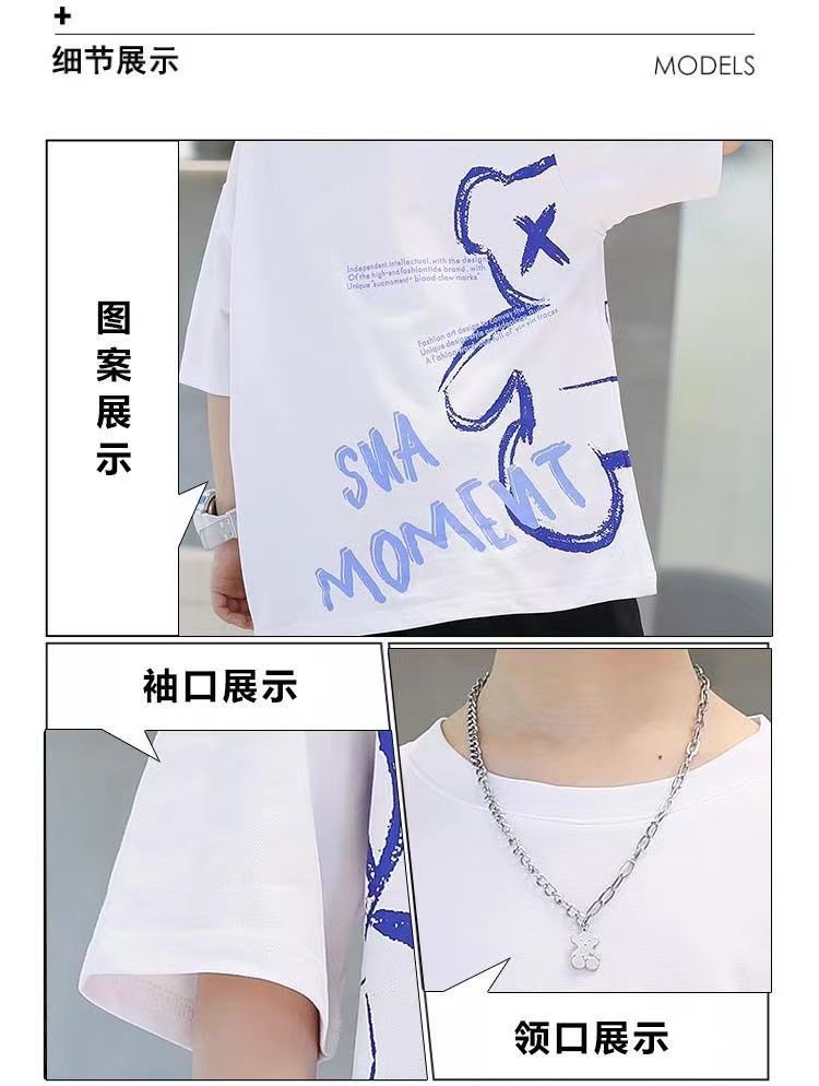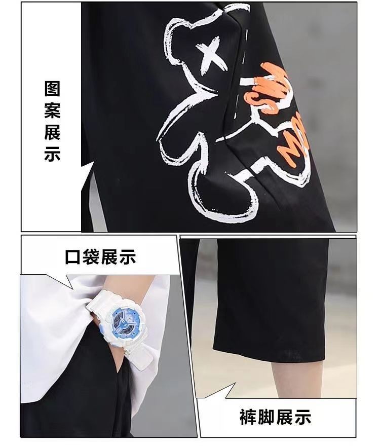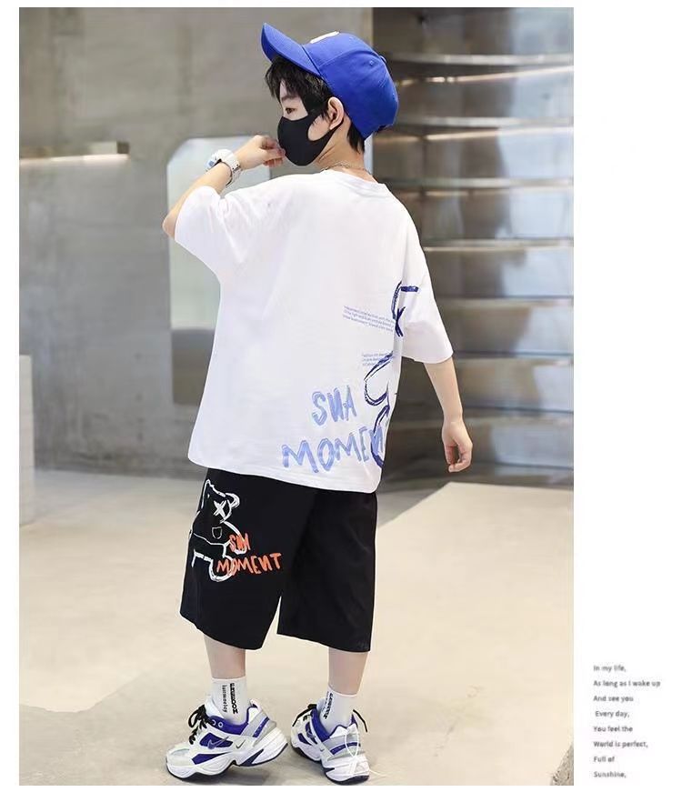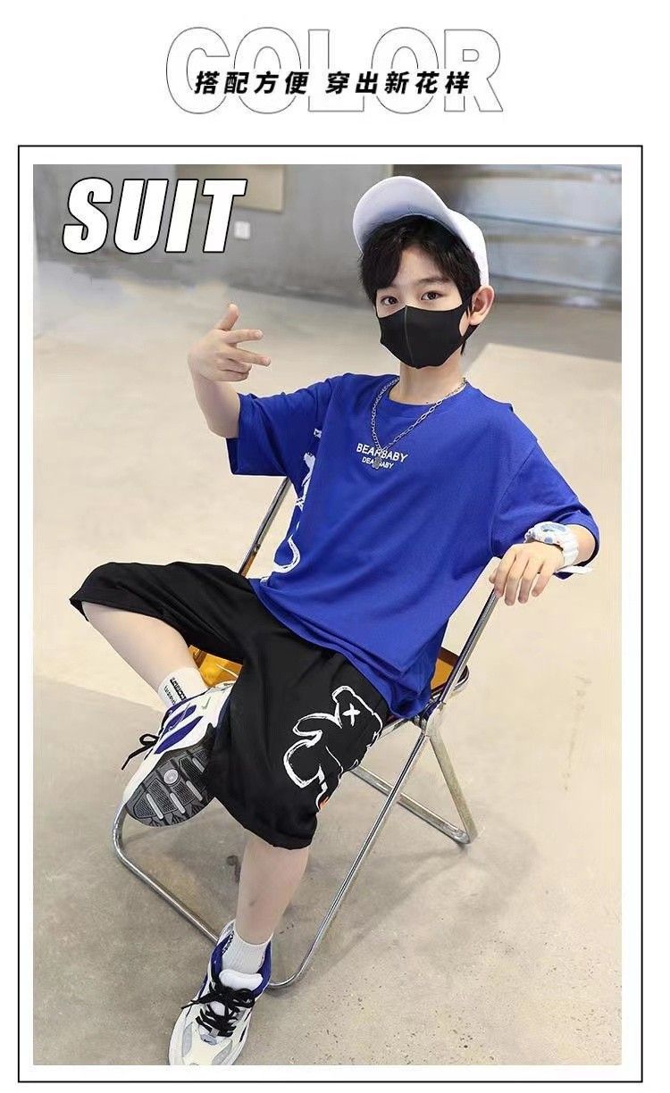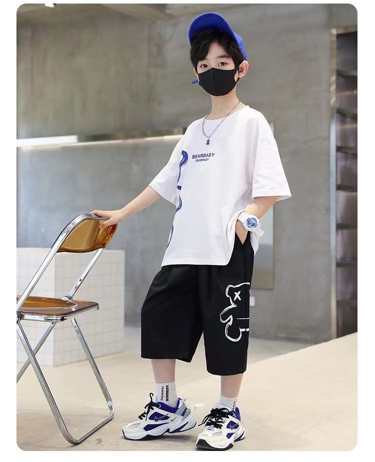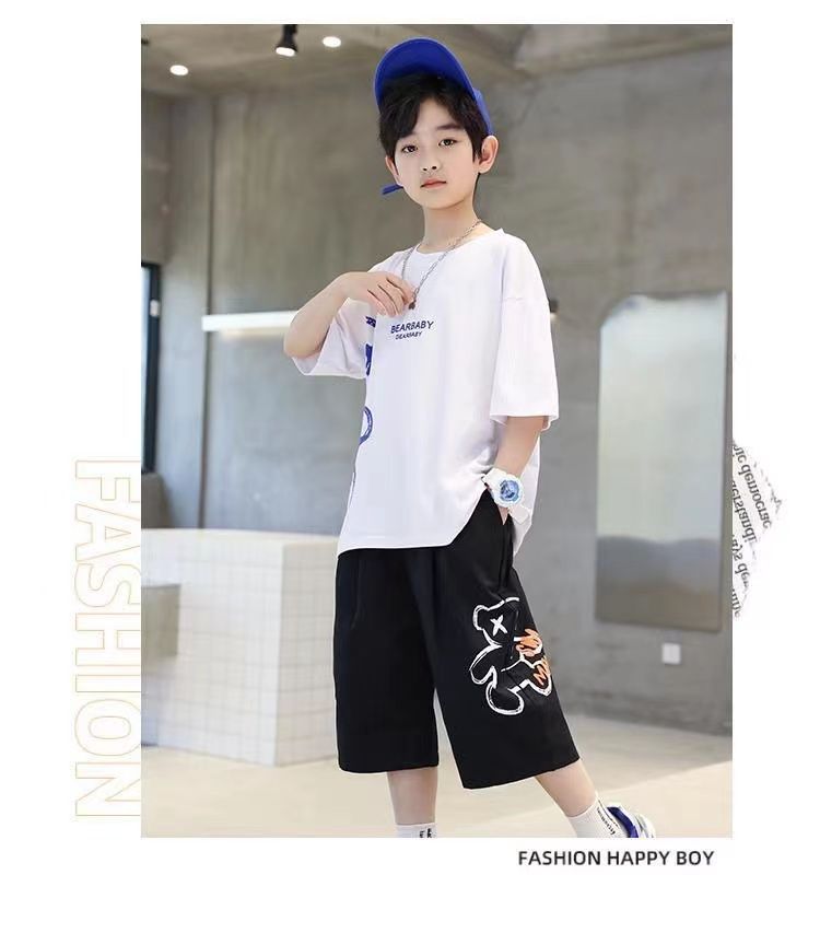 24 봄 새로운 어린이 반팔 반바지 세트 큰 소년의 만화 인쇄 라운드 넥 스포츠 캐주얼 투피스 세트스토어 가기