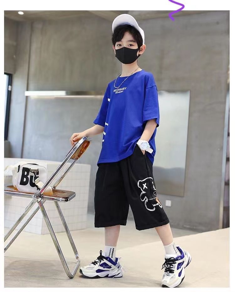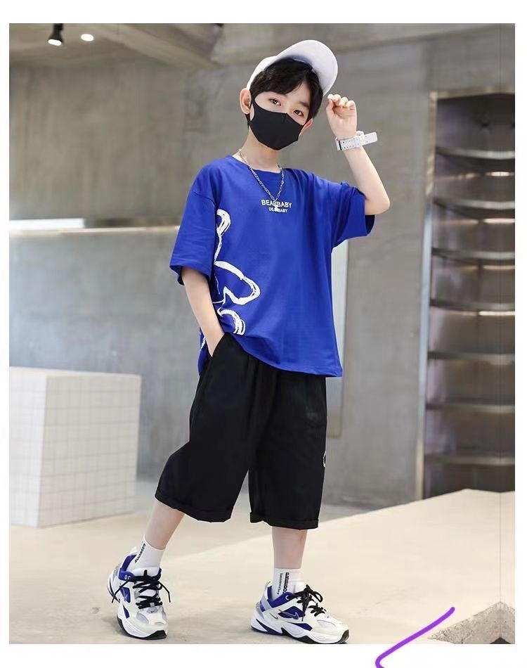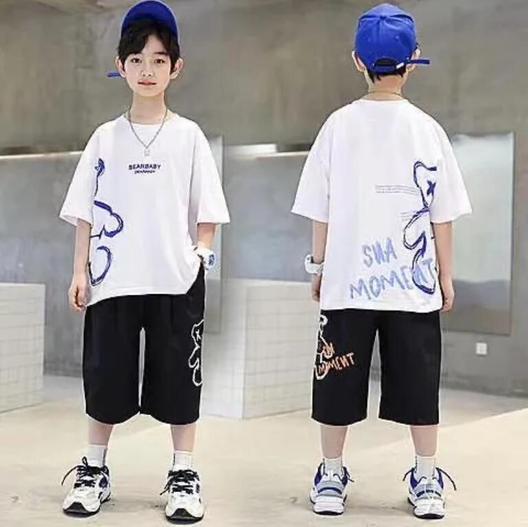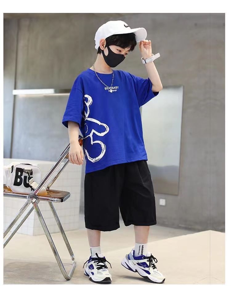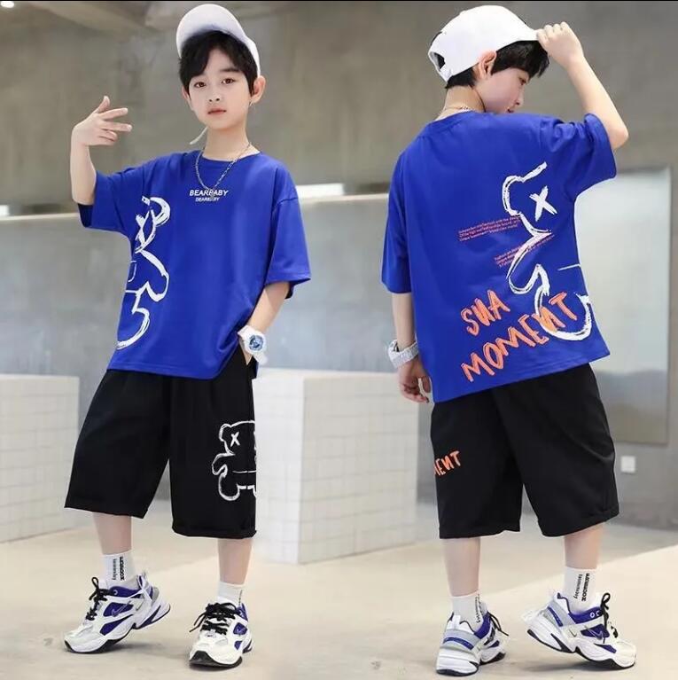 24 봄 새로운 어린이 반팔 반바지 세트 큰 소년의 만화 인쇄 라운드 넥 스포츠 캐주얼 투피스 세트