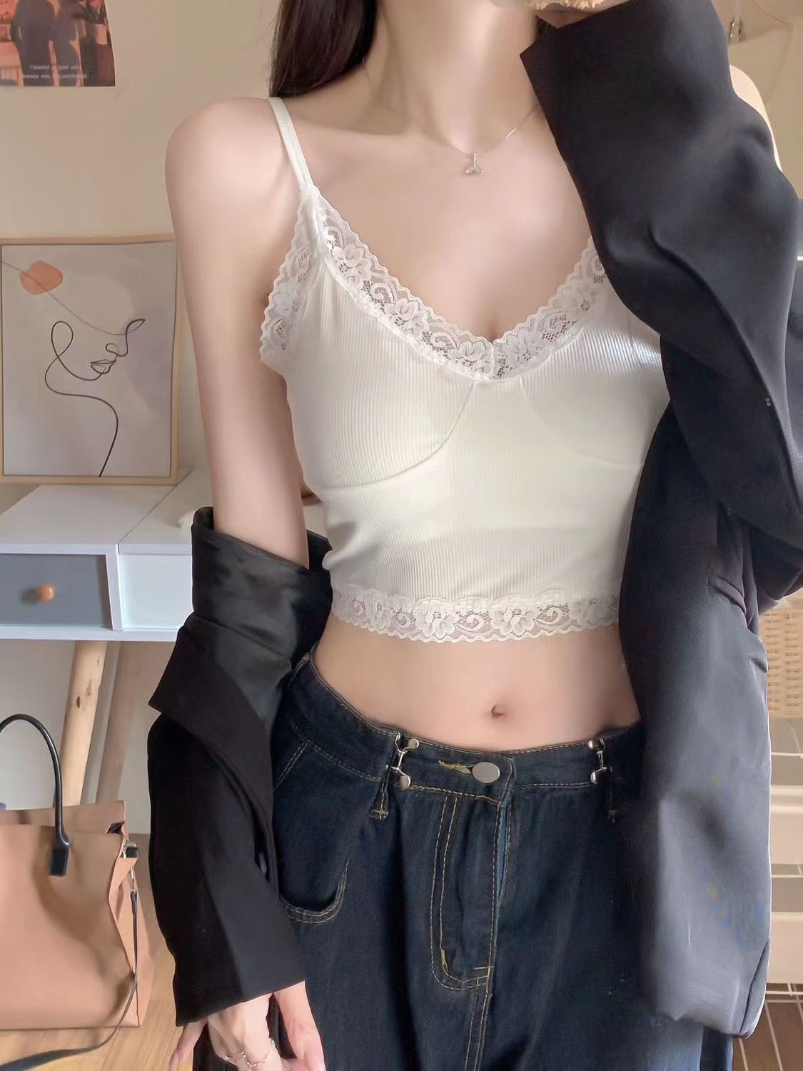 새로운 복고풍 레이스 V 넥 슬링 슬림 핏 슬리밍 조끼 가슴 패드 순수한 욕망 소녀 내부 기반스토어 가기