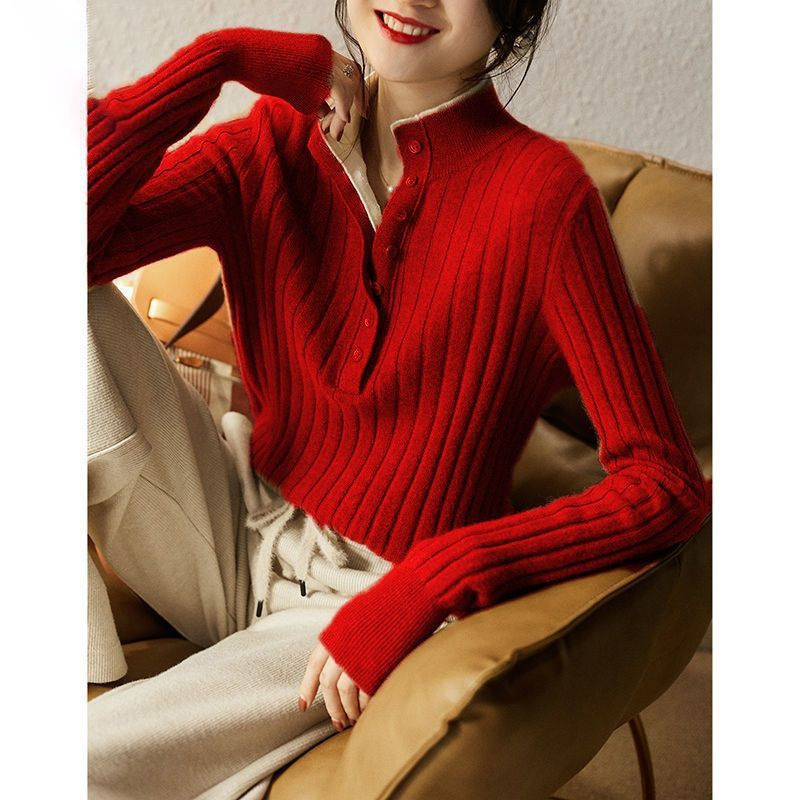 회색 스타일 우아한 피트 버튼 스탠드 칼라 슬림 스웨터 여성 의류 2024 봄 새로운 니트 탑 착용스토어 가기