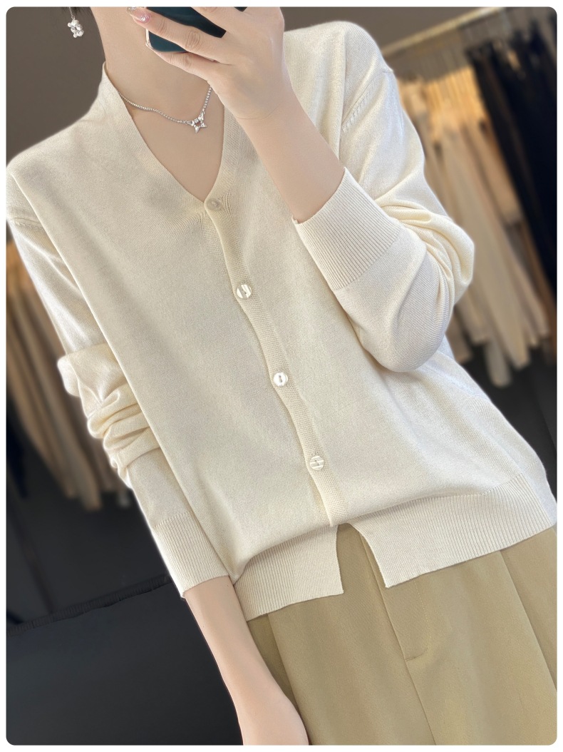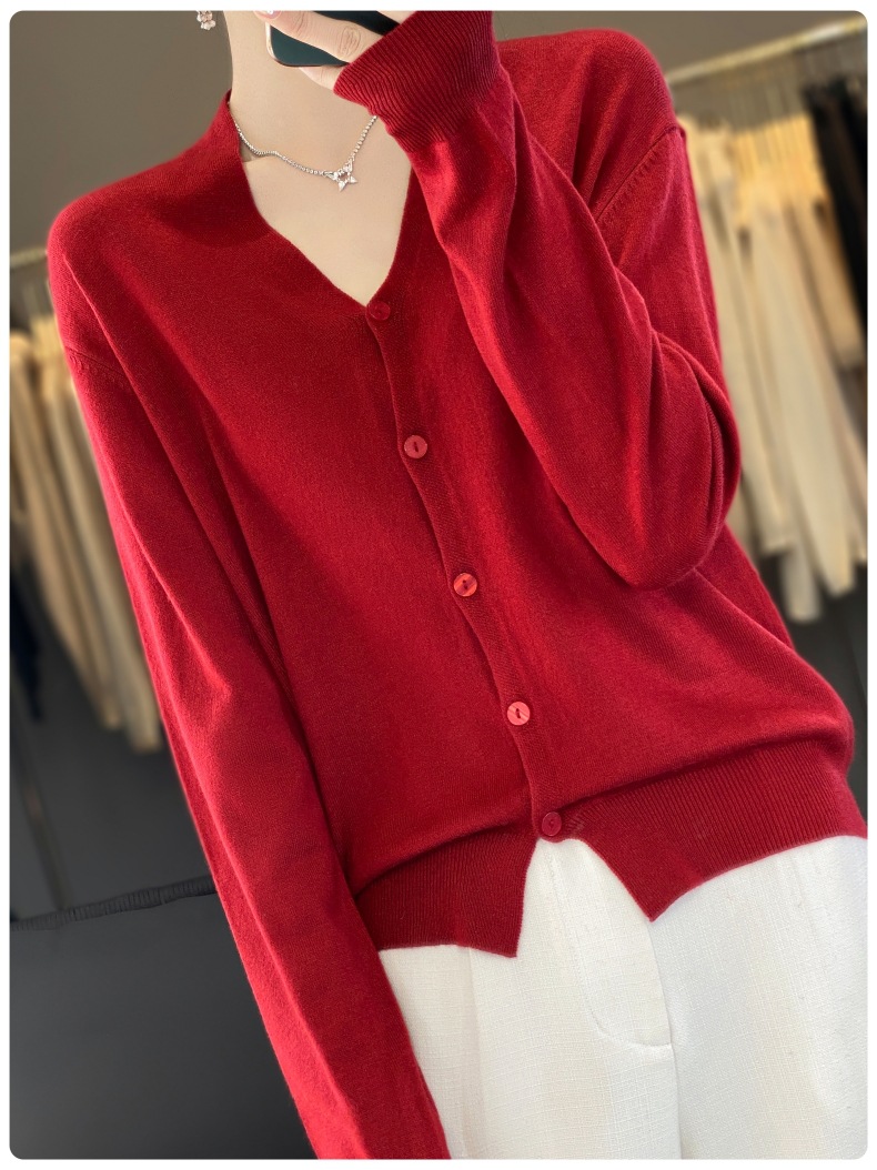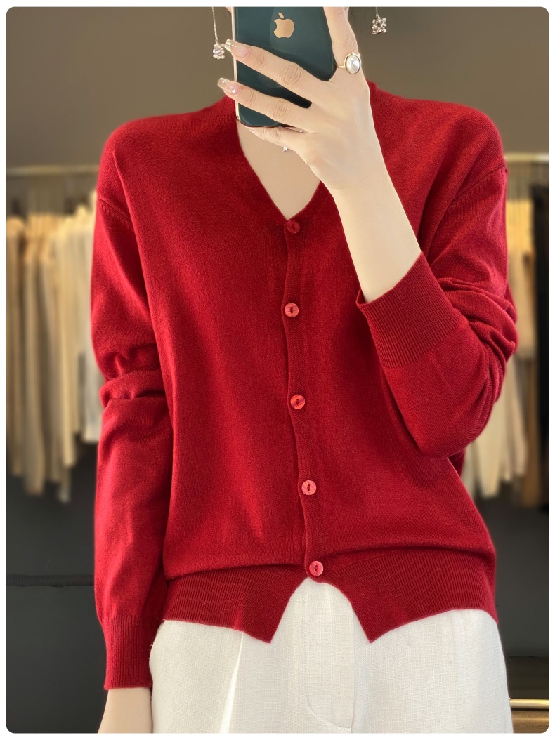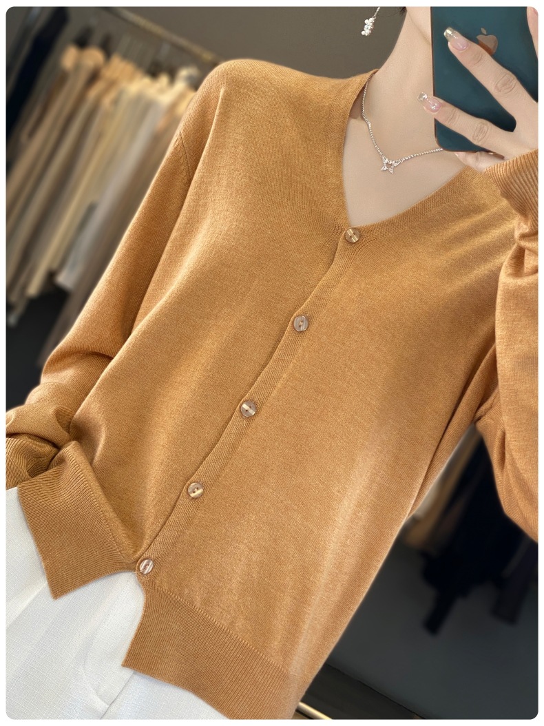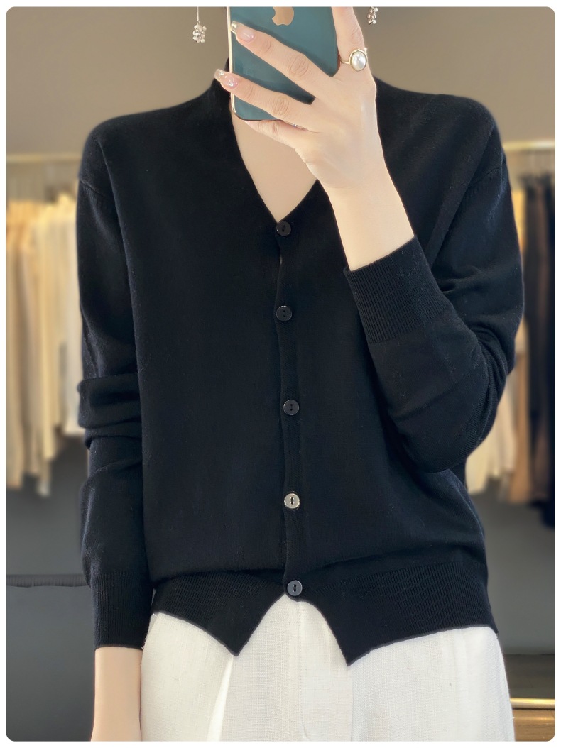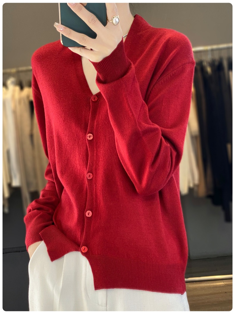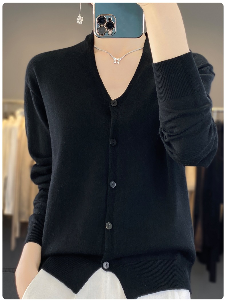 봄 새로운 여성 느슨한 단색 긴 소매 간단한 우아한 V 넥 양모 카디건스토어 가기