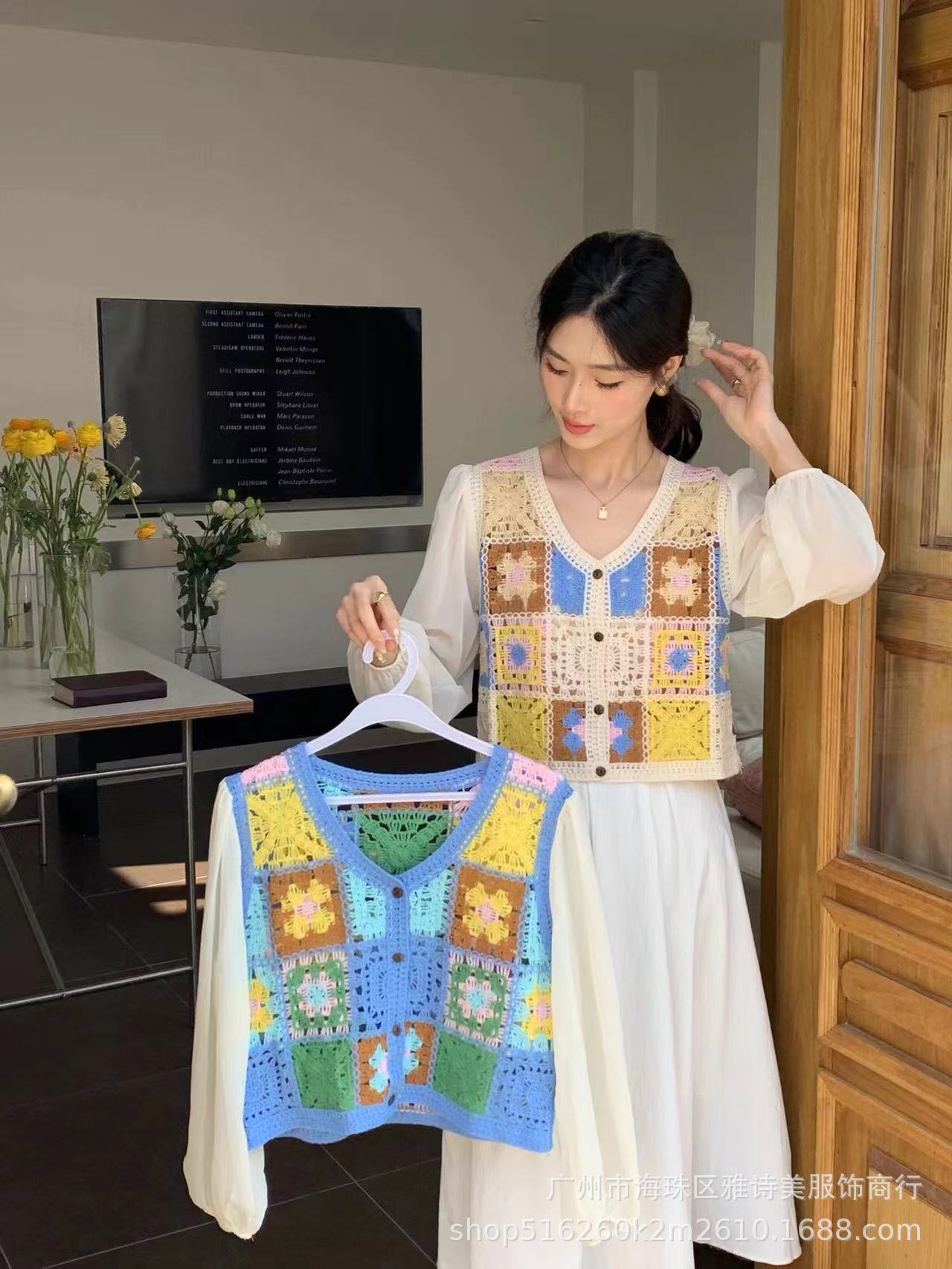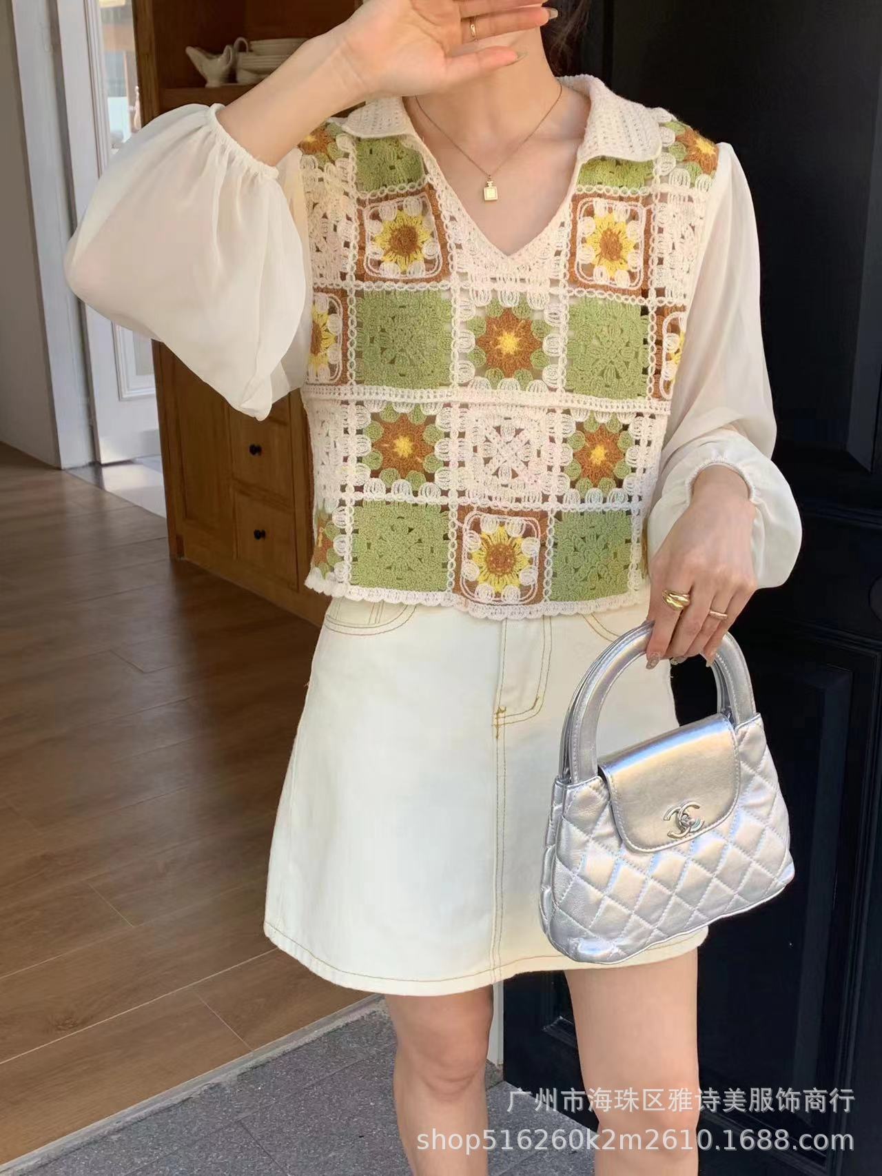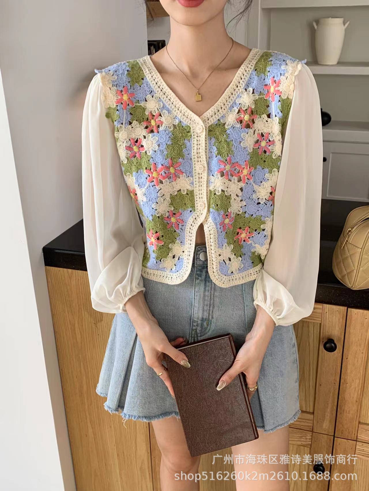 프랑스의 세련된 서양식 나이를 줄이는 쉬폰 셔츠 여성의 새로운 V 넥 크로 셰 뜨개질 속이 빈 퍼프 소매 달콤한 긴 소매 최고 패션스토어 가기